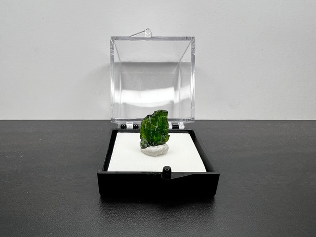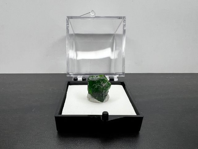 ロシア産のクロム透輝石(クロムダイオプサイド)です。 クロムでグリーンに色付いた透輝石で、タンザニア産のものと比べても濃い鮮やかなグリーンをしています。 透過光で美しい緑を確認することができます。 コレクションしやすいサムネイルサイズです。 画像のケースに固定してお届けいたします。 産地のラベルが付属いたします。 産地 : Inagli chrome diopside deposit, Russia サイズ : 12mm×11mm×8mm