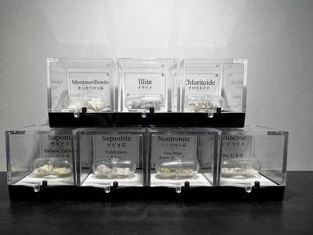 世界各地のレアな粘土鉱物7点セットです。 小さなカプセル内に収めてあります。 主に研究資料用で、市場で標本用としては入手は難しい物となっております。 セピオ石/Sepiolite 産地 : Valdemore,Spain サポナイト/Saponite 産地 : Ballarat,California,USA バイデライト/Beidellite 産地 : Idaho,USA ノントロン石/Nontronite 産地 : Uley Mine,South Australia イライト/Illite 産地 : Waukesha,Wisconsin, USA モンモリロン石/Montmorillonite 産地 : Arizona, USA クロリトイド/Chloritoide 産地 : Quebéc,Canada 産地のラベルが付属いたします。