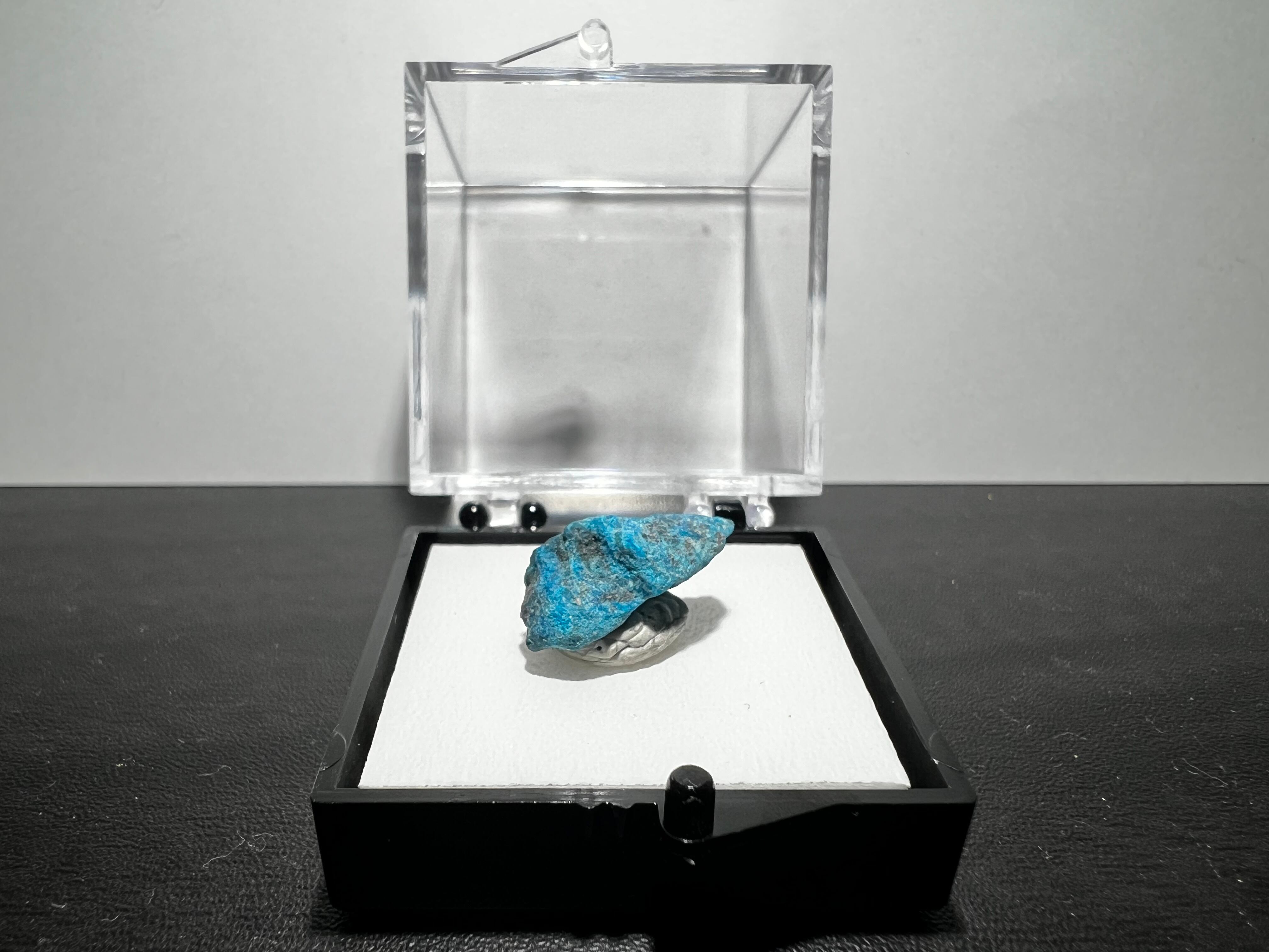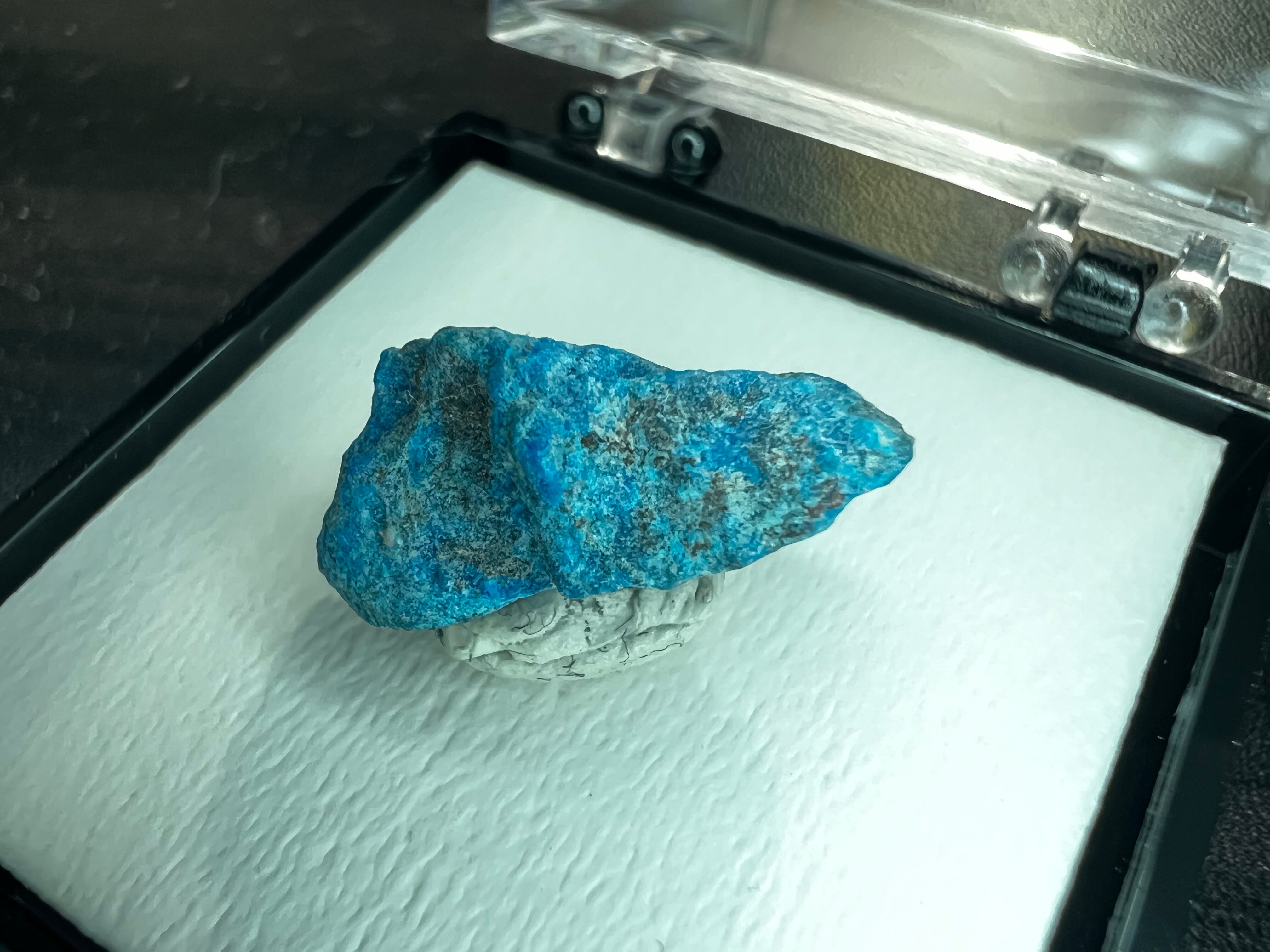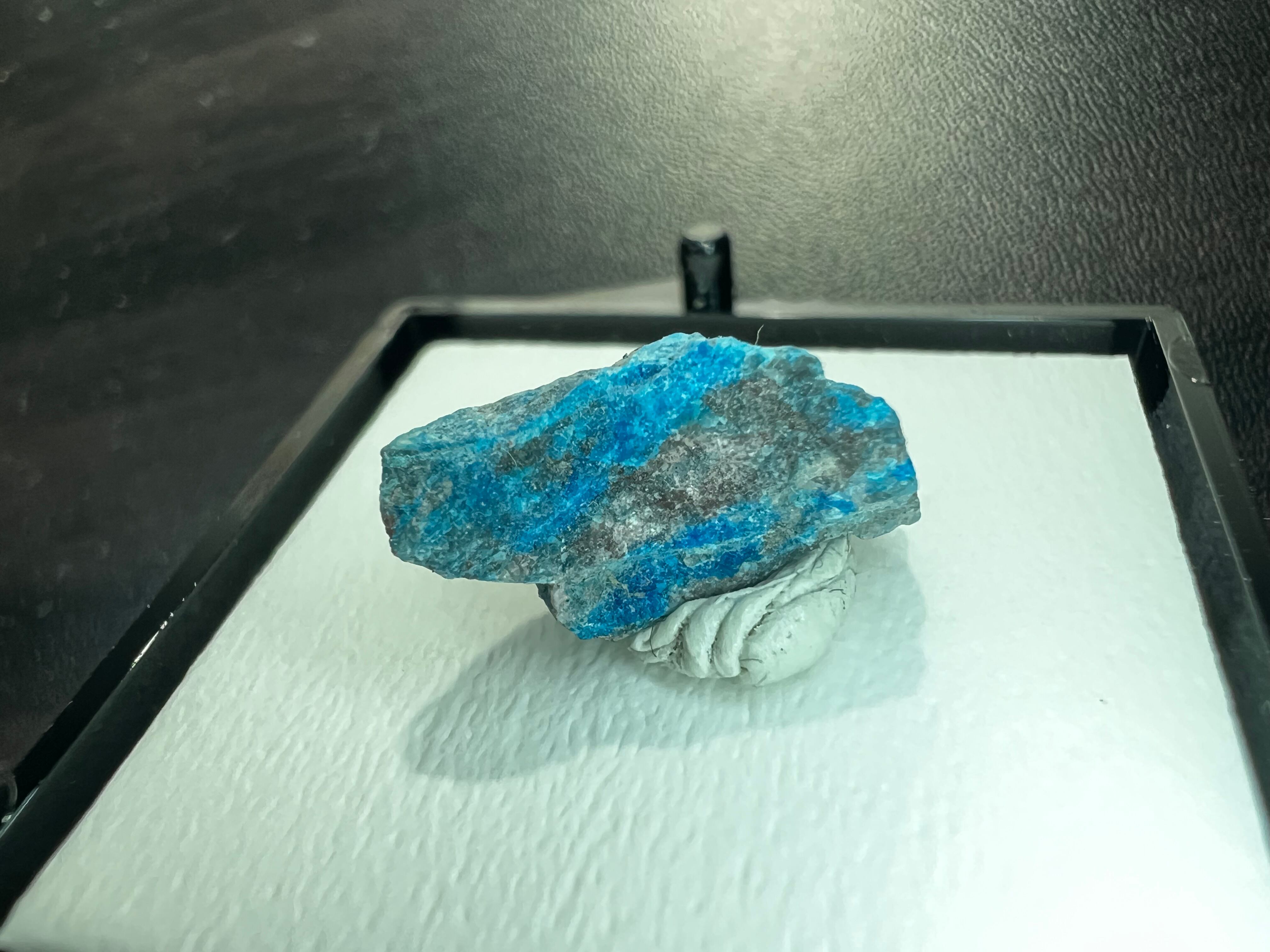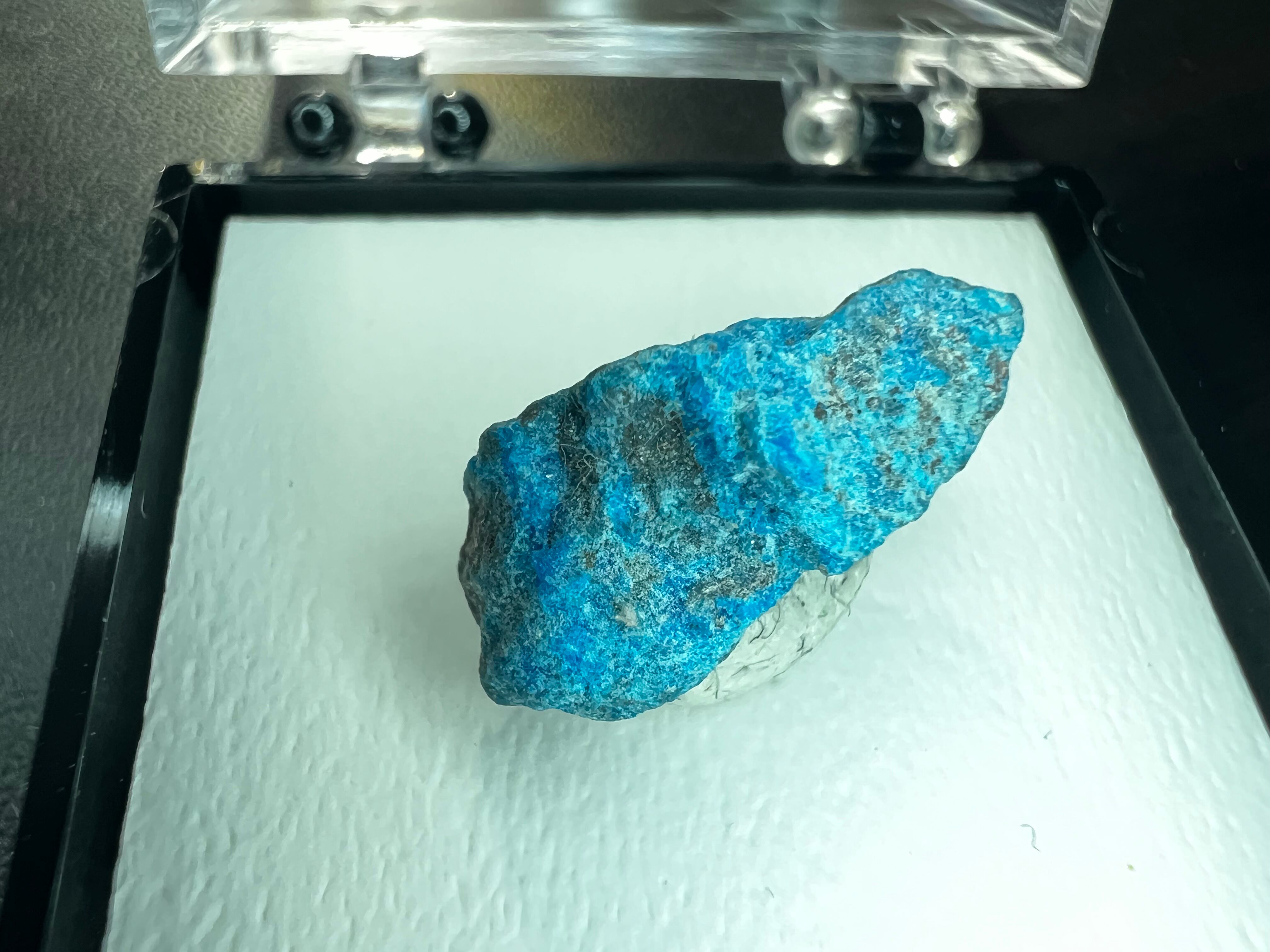 本品は肉眼で結晶が確認できるものではありませんが、銅の二次鉱物らしいパパゴ石のブルーが映える、コレクションし易い小さなサムネイルサイズの標本です。