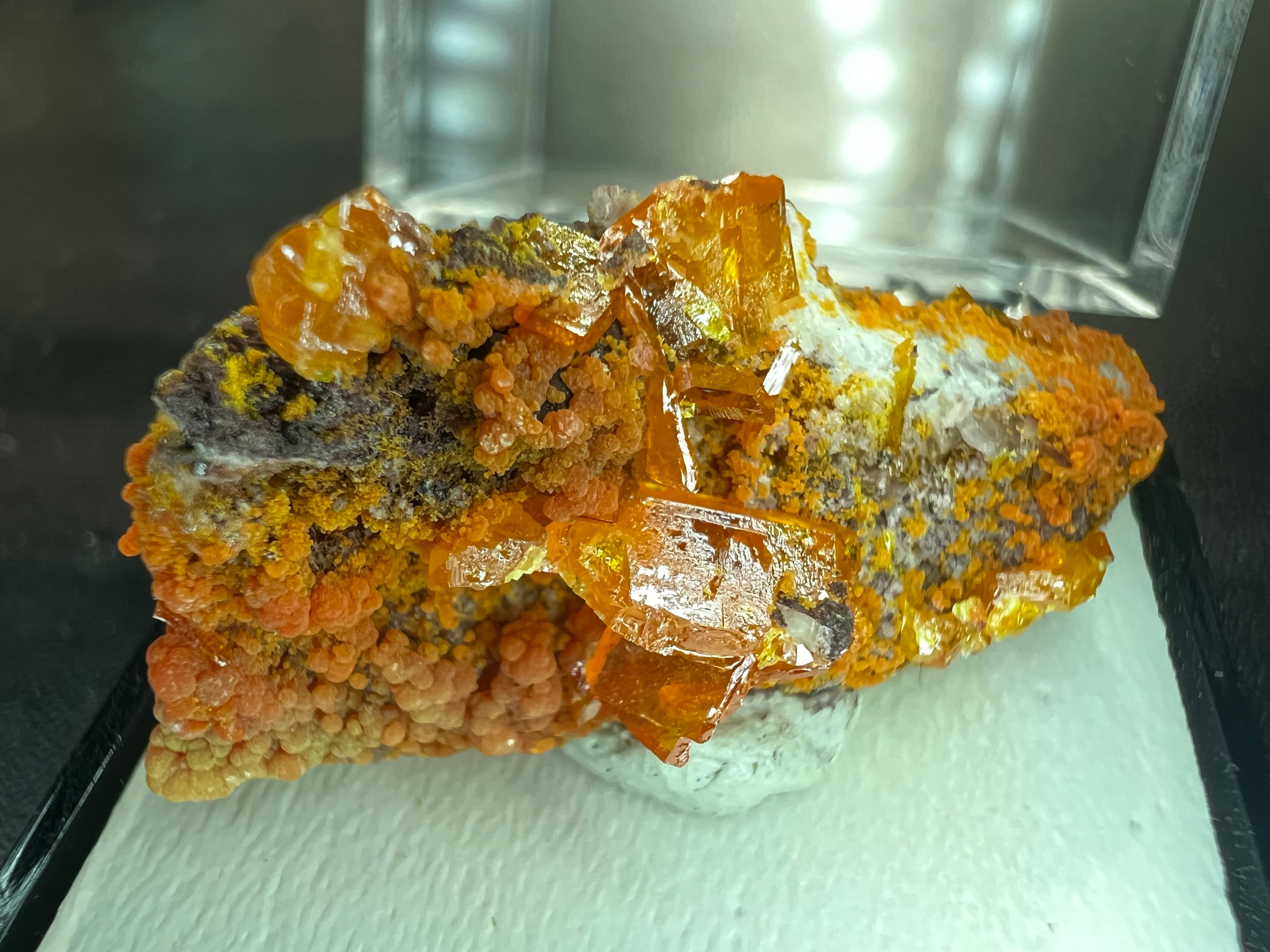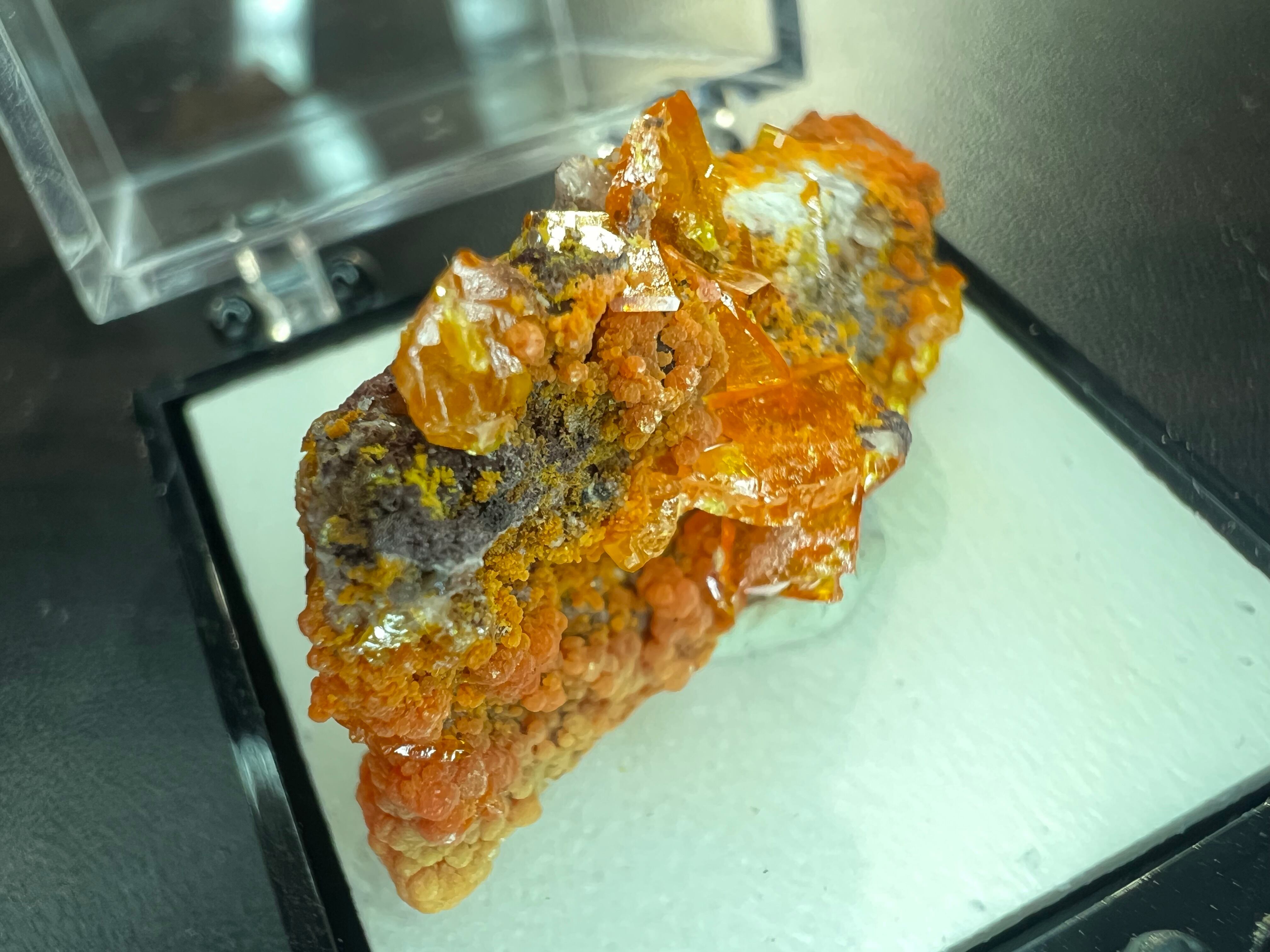 鮮やかなオレンジ色をした板状の綺麗な結晶が母岩上に複数見られます。この産地ではミメット鉱を伴って産することが良く見られ、本品も球状集合体のミメット鉱が見られます。