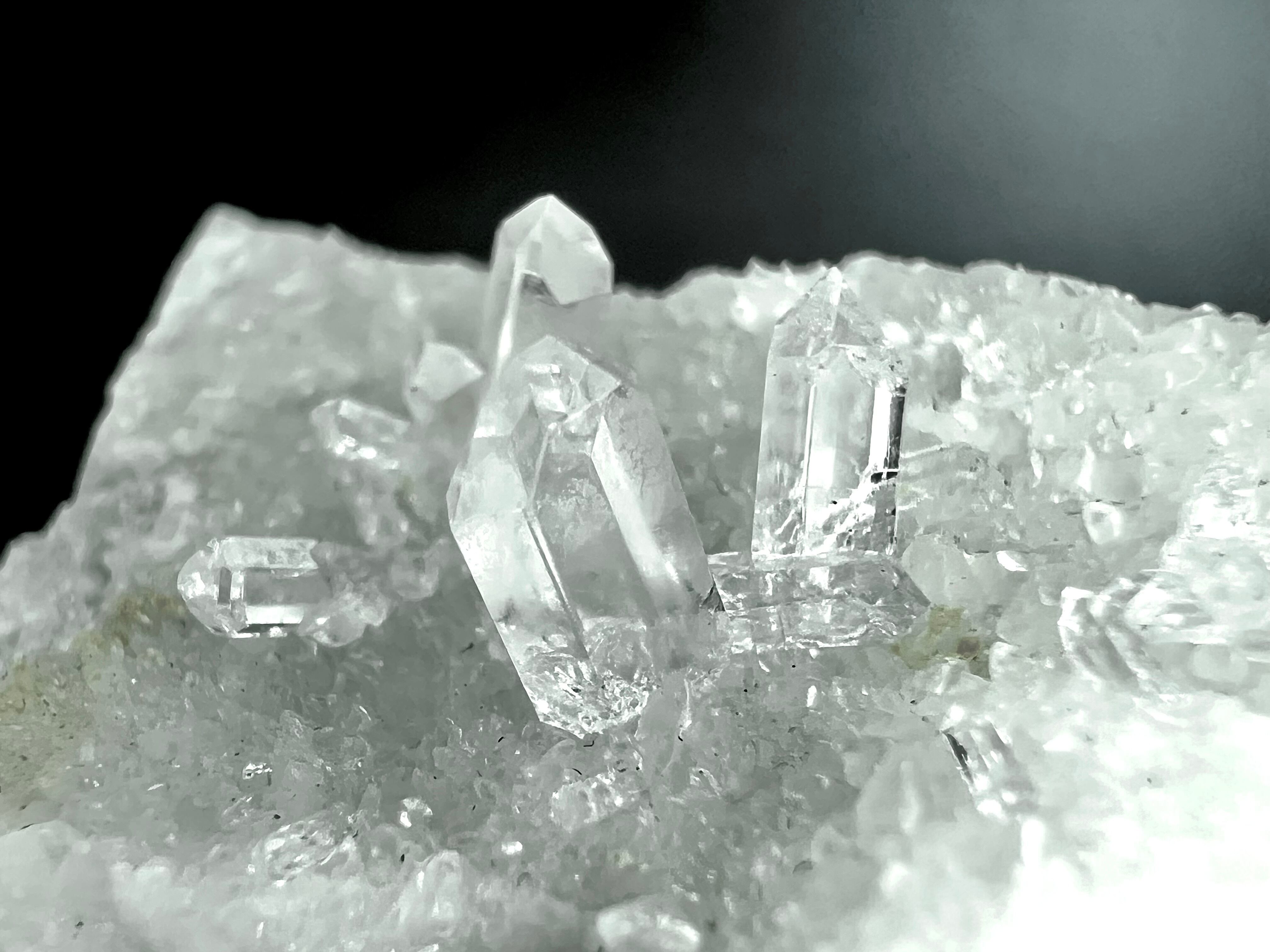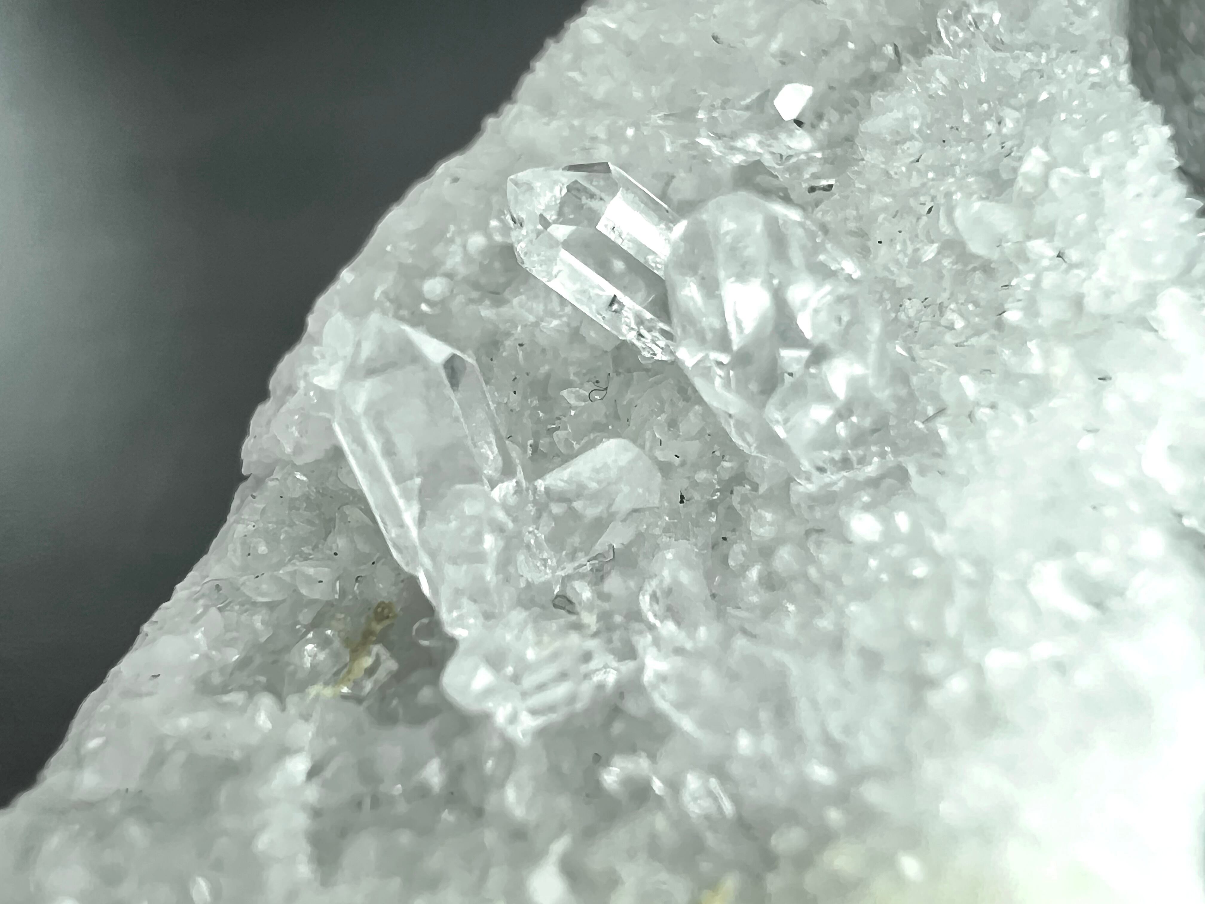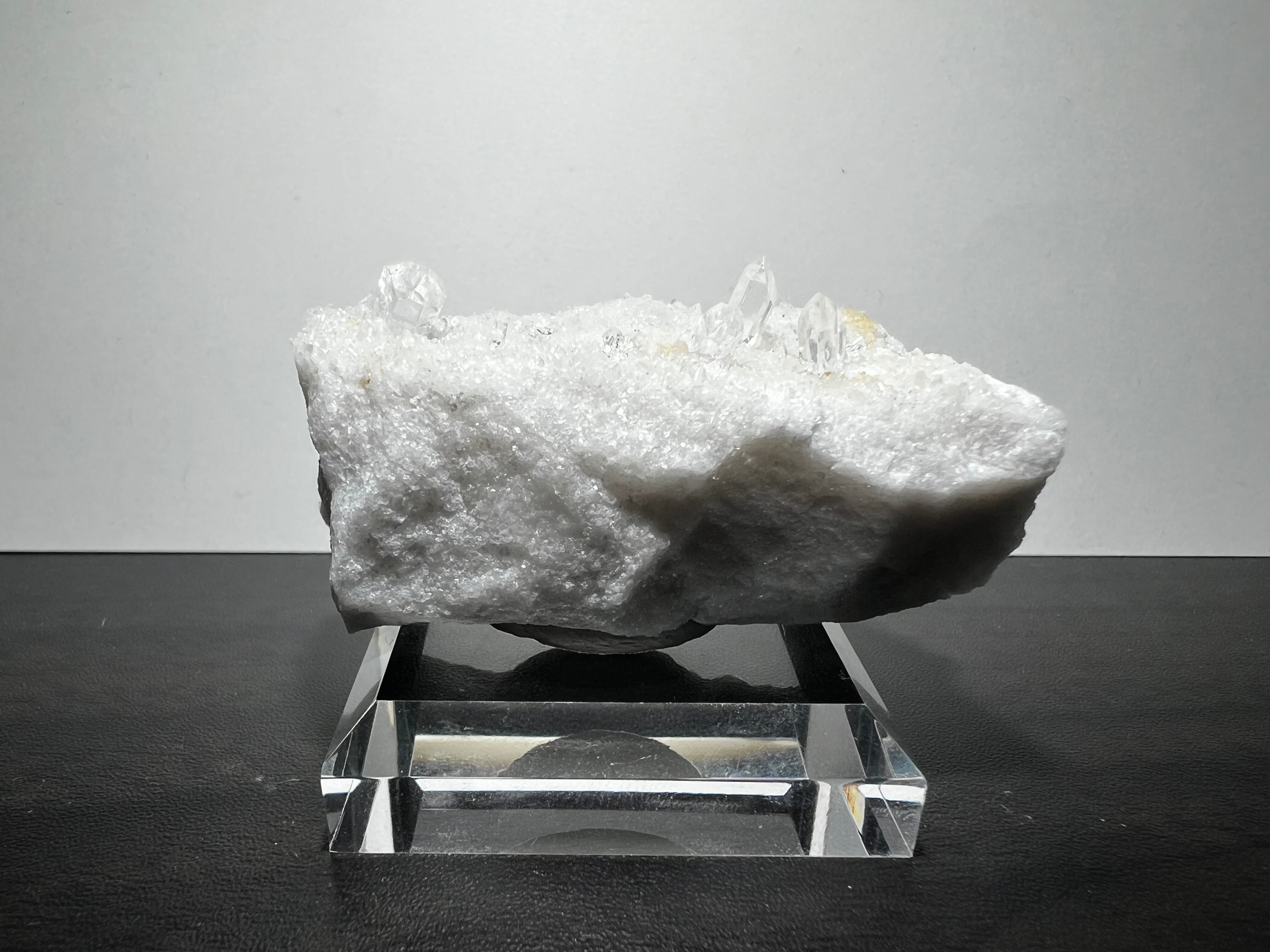 ニューヨークのハーキマー水晶に似ていますが、こちらは純白の大理石を母岩としているのが特徴的で、本品も大理石上に何本も小さな水晶が立っています。