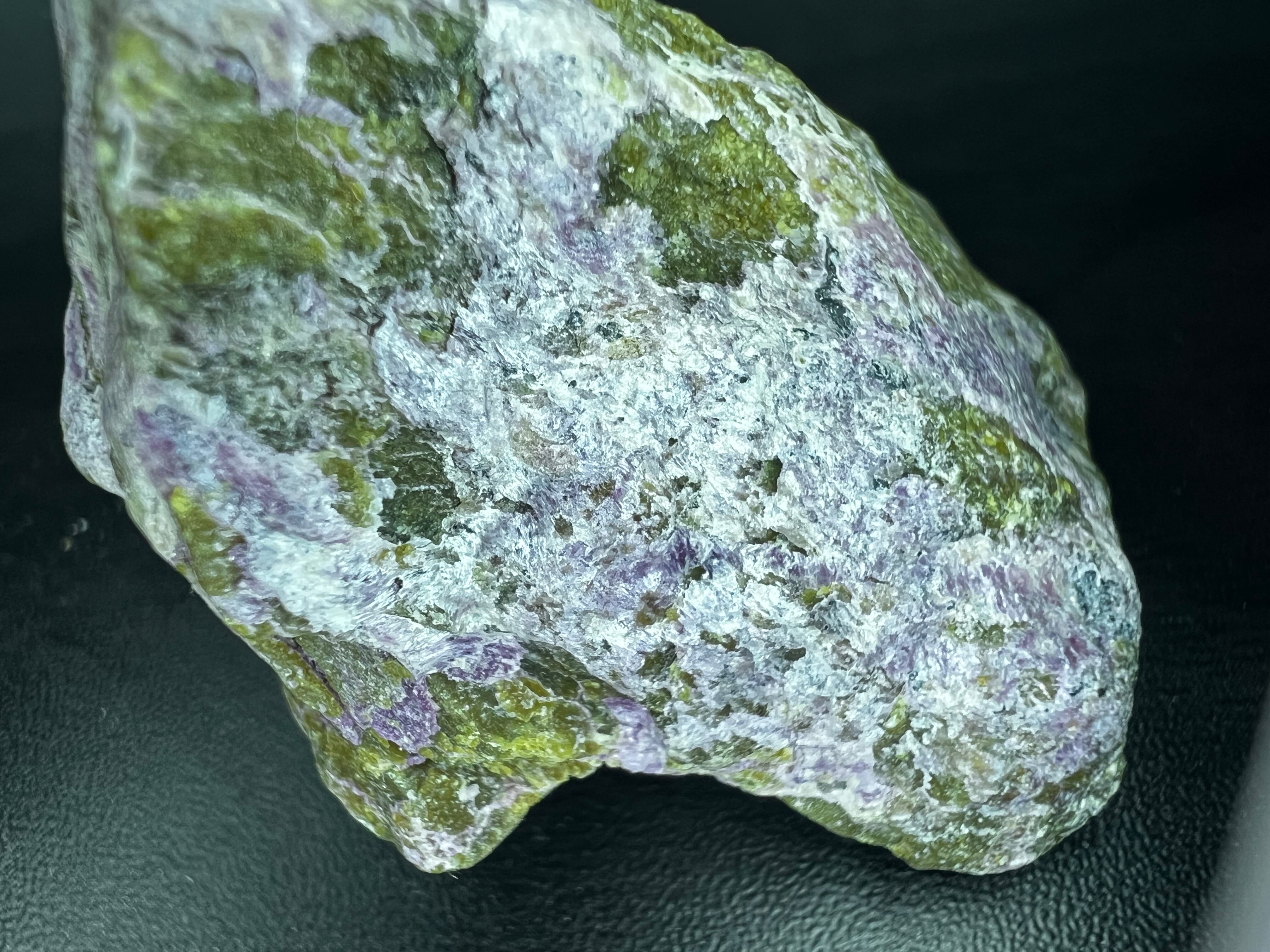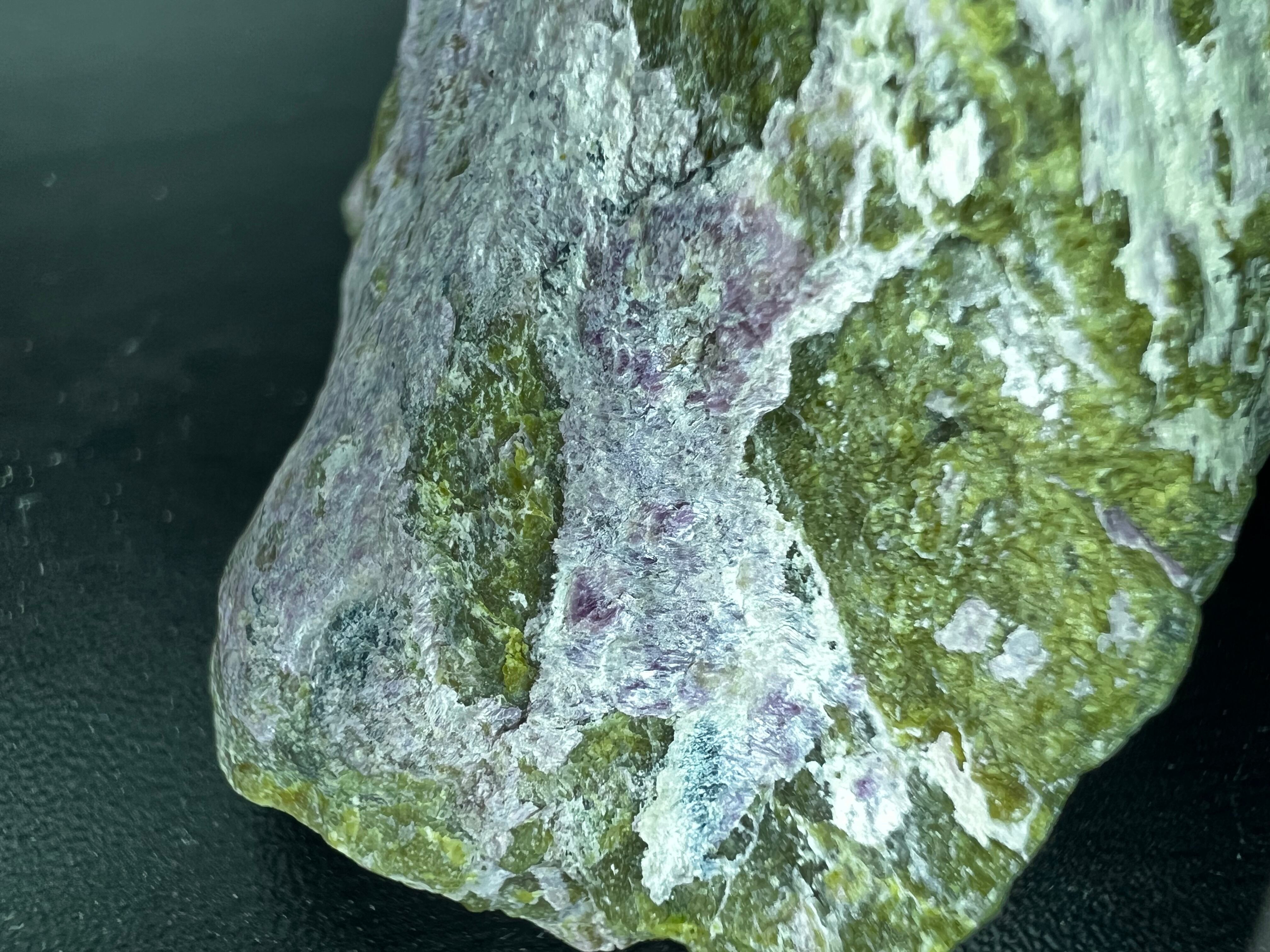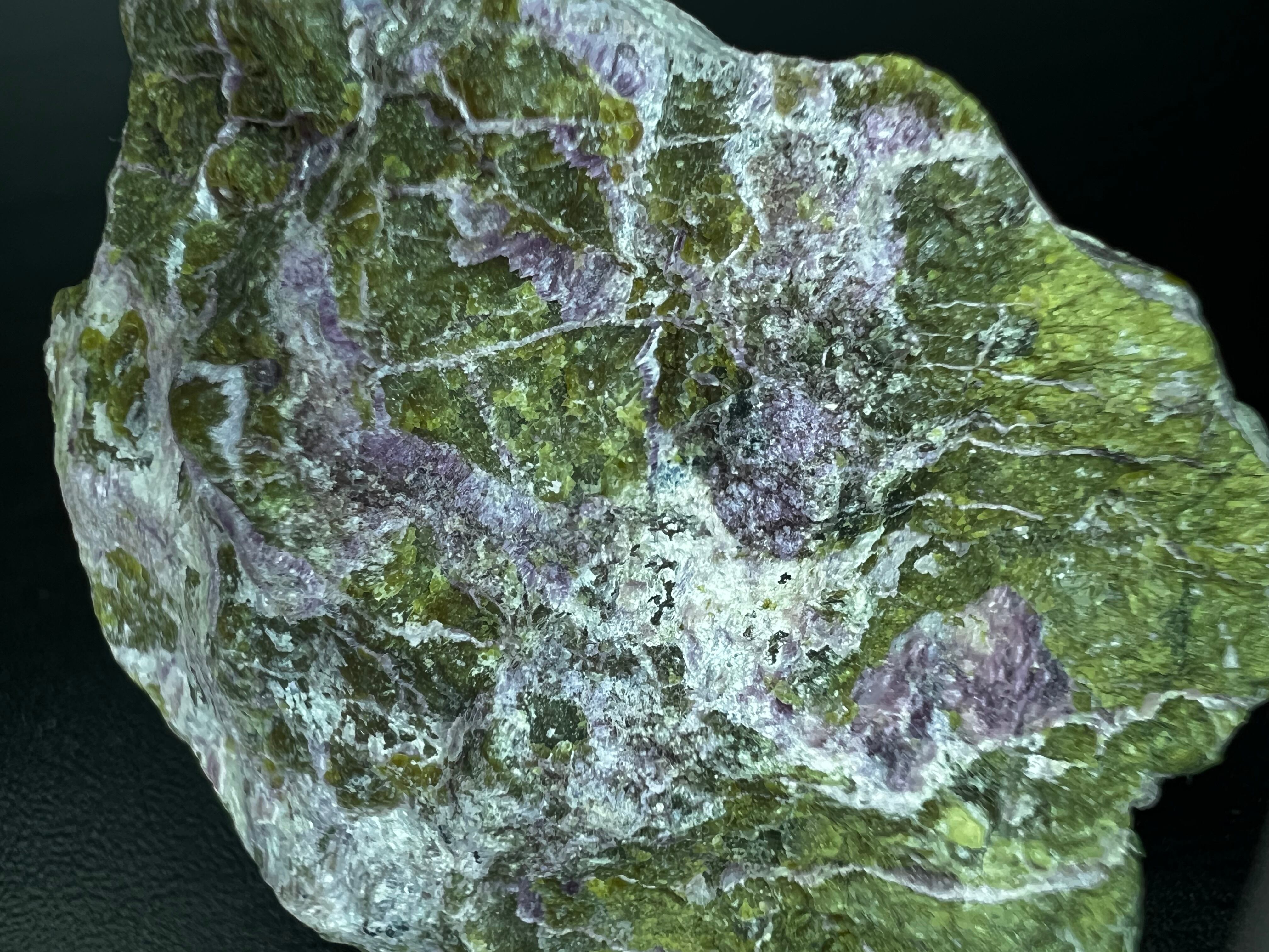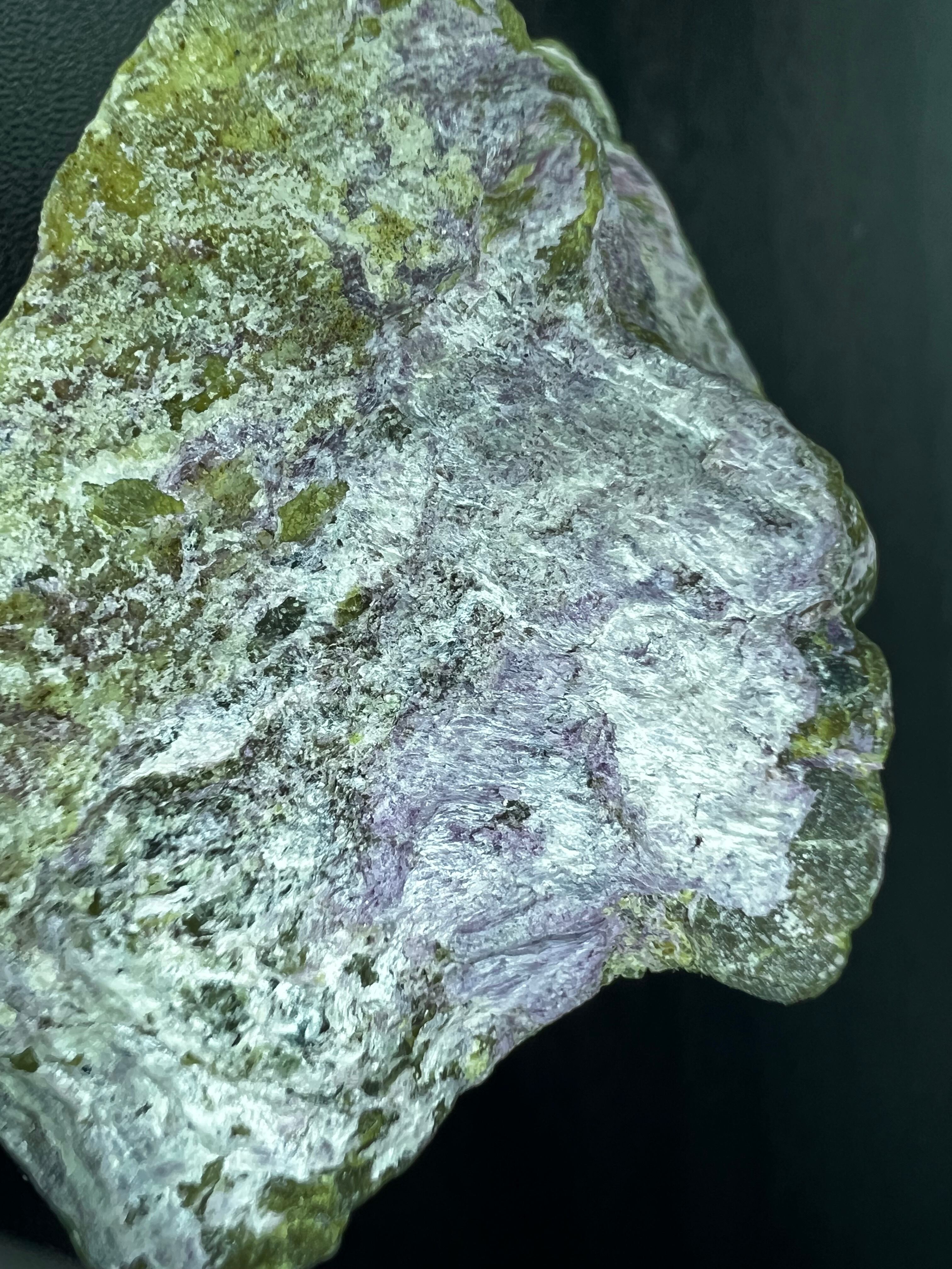 本品もやはり暗緑色をした蛇紋岩上に皮膜状に生じていてクロムを含むためか紫色をしています。
