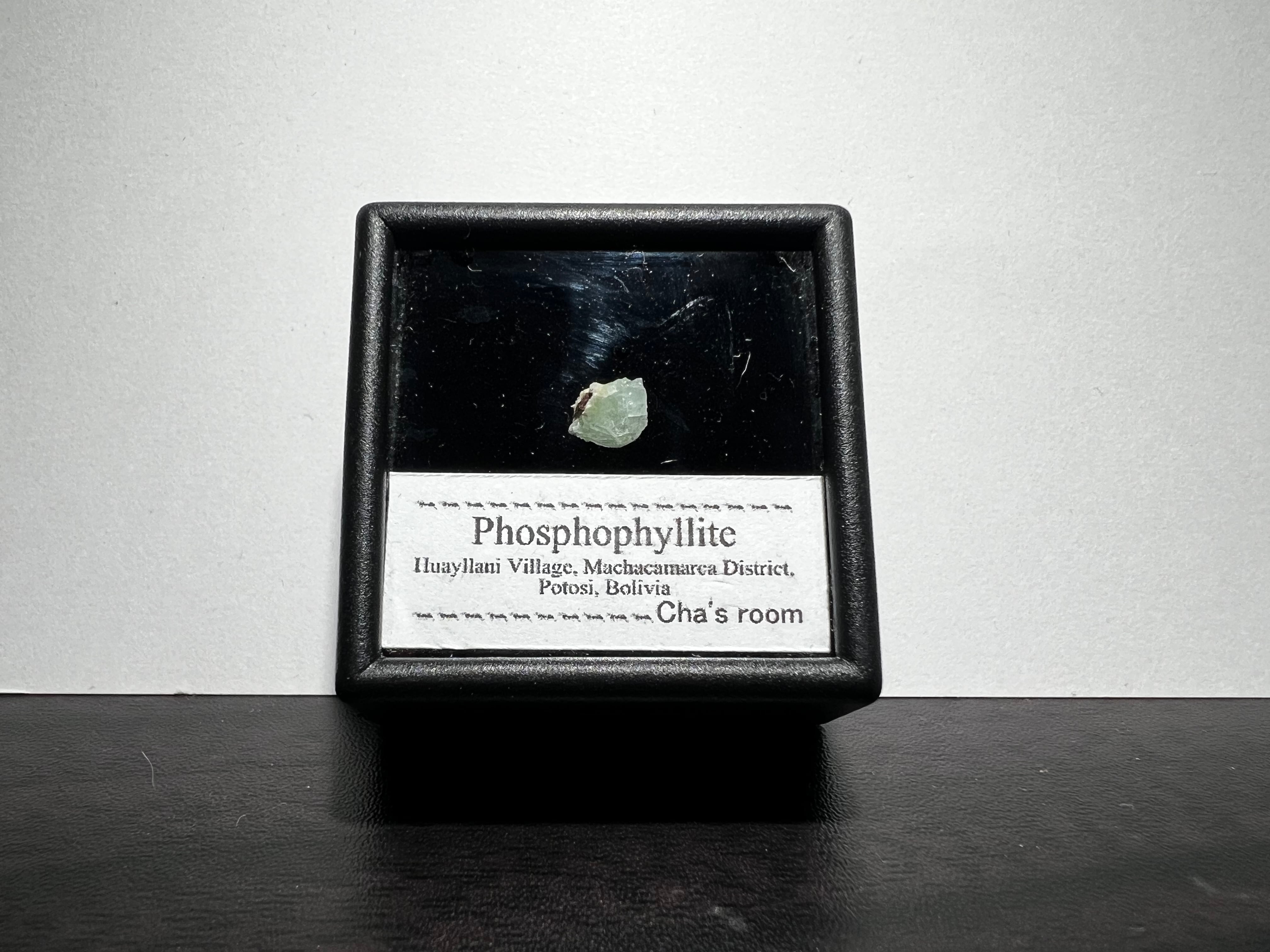本品は小さな小さな結晶片ですが、フォスフォフィライトらしい色がよくわかる標本となっています。