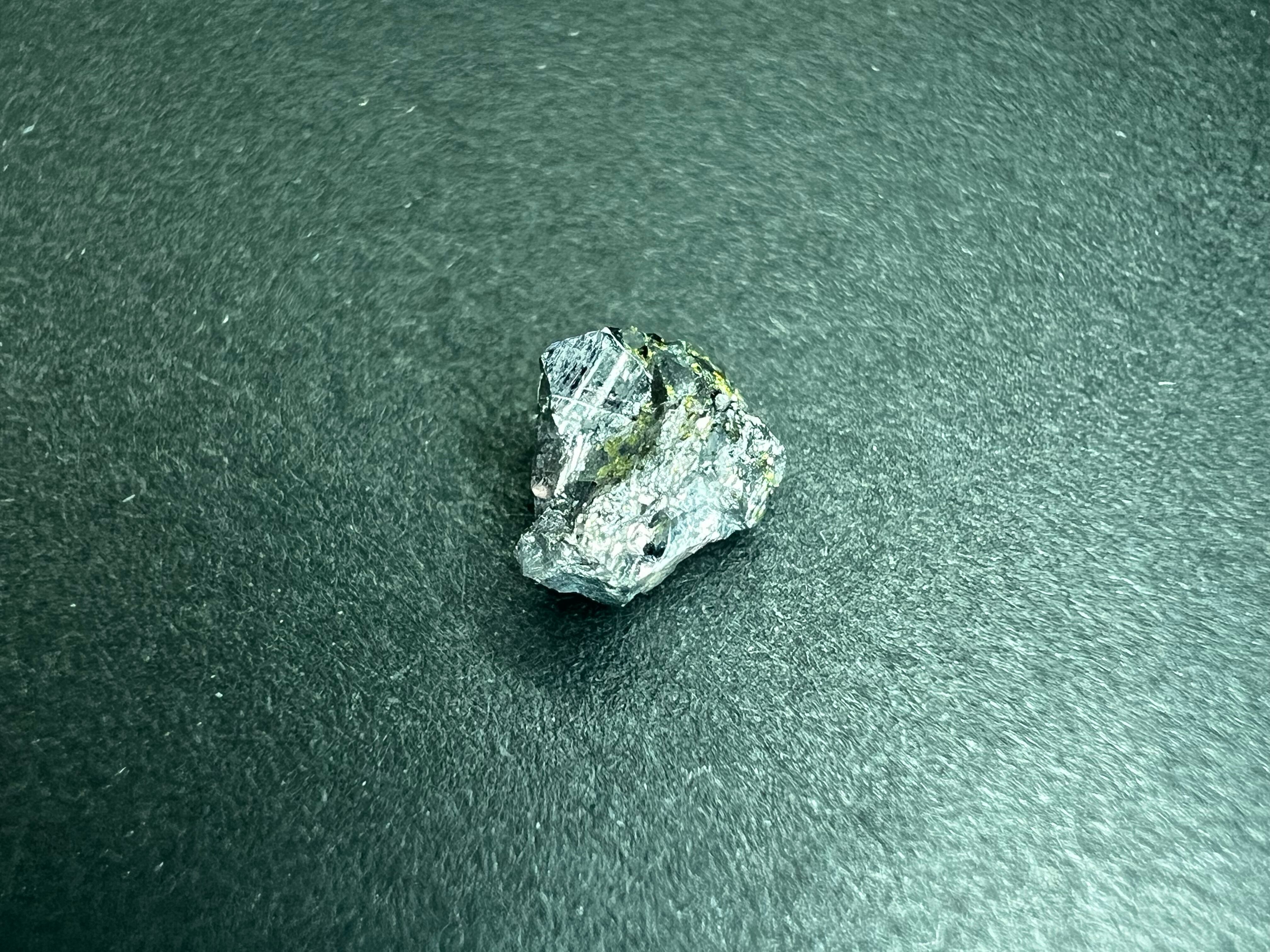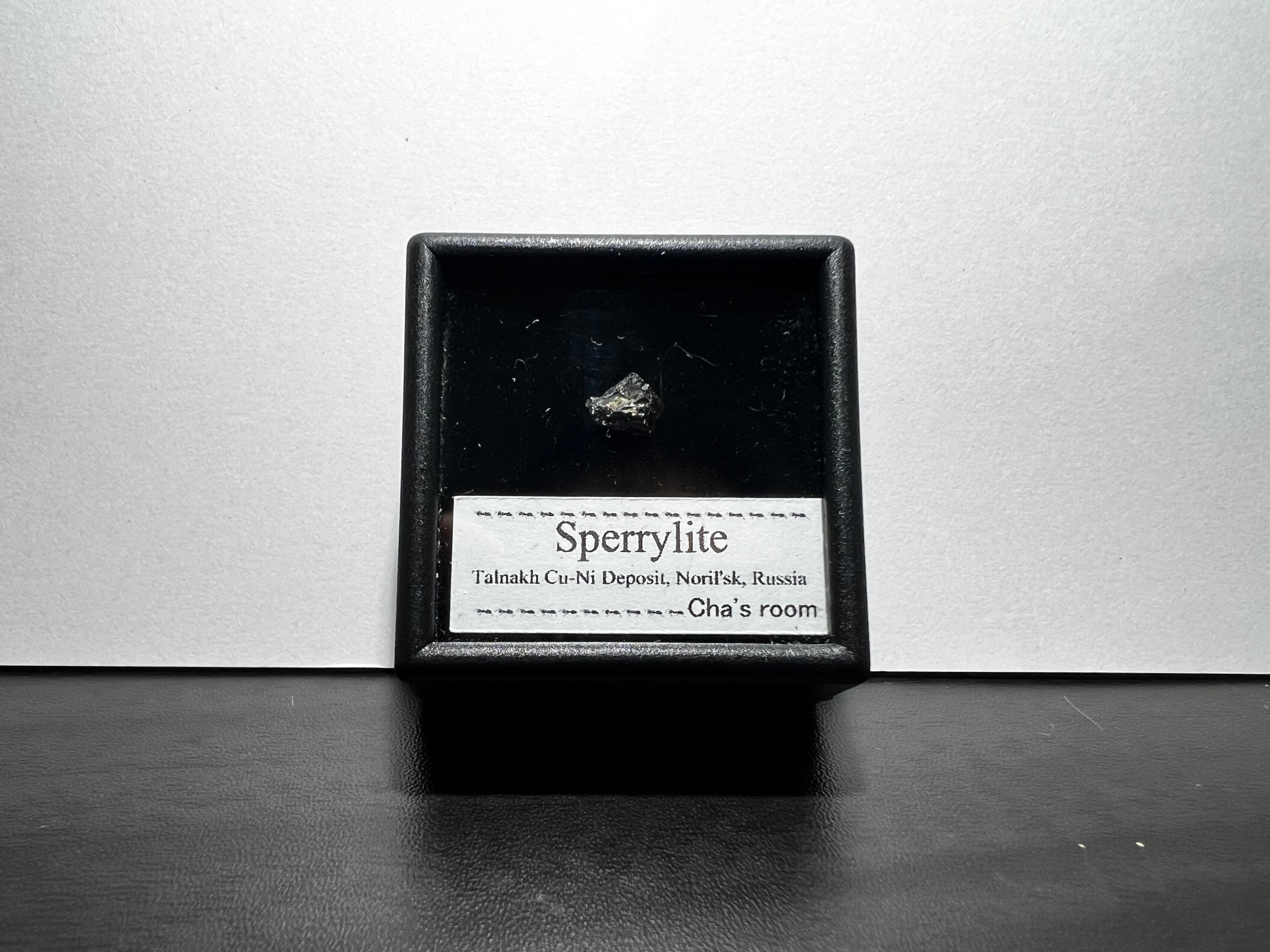 海外でも人気のある鉱物で、大きな物になると数十万〜数百万円はざらという、さすがプラチナの鉱物といった感じでしょうか。本品はロシア産で結晶のサイズは小さいですがほぼ全体がスペリー鉱で非常に強い光輝があり、結晶面も確認できます。わずかながら真鍮色のおそらく黄銅鉱が付着しています。