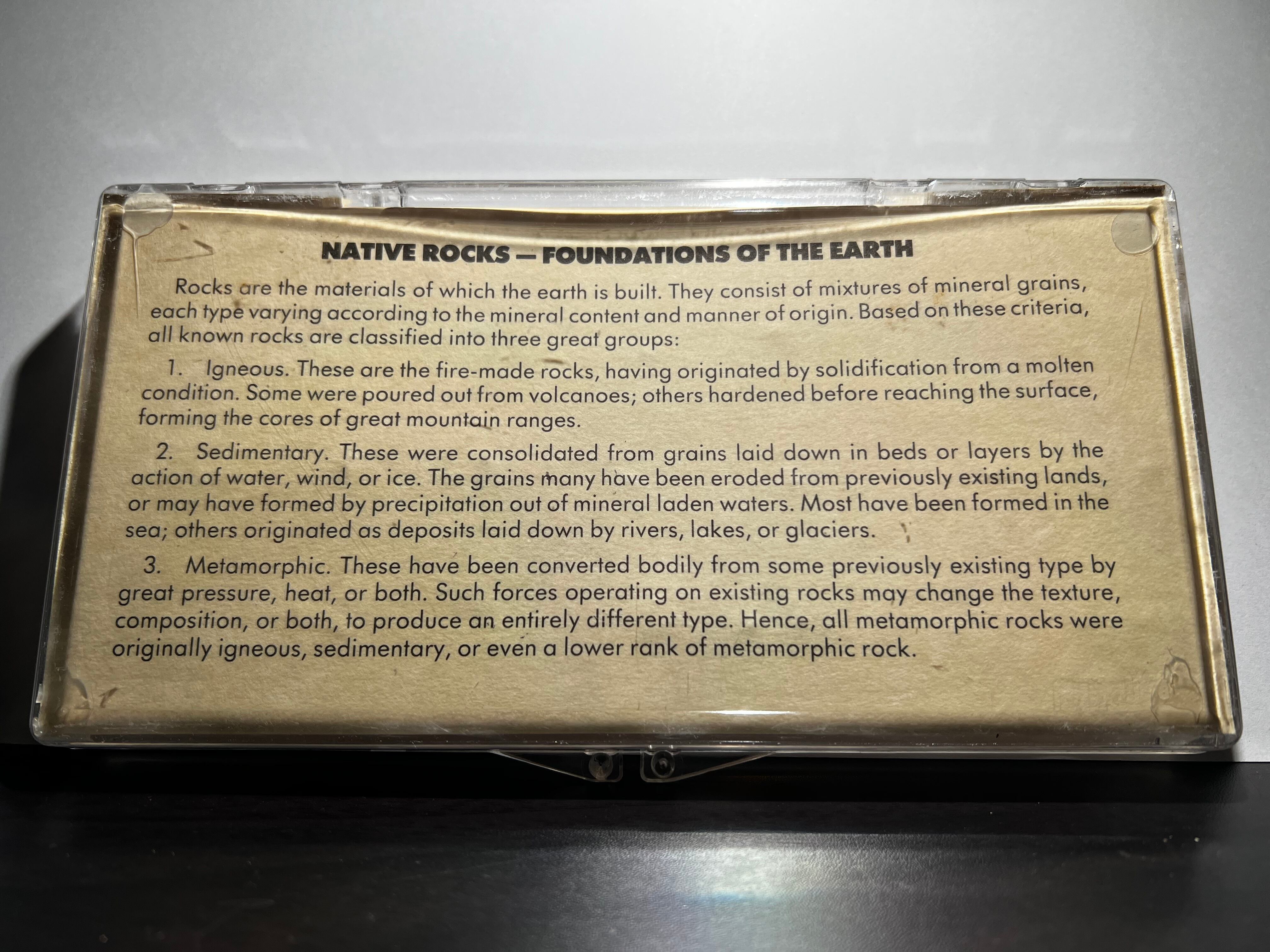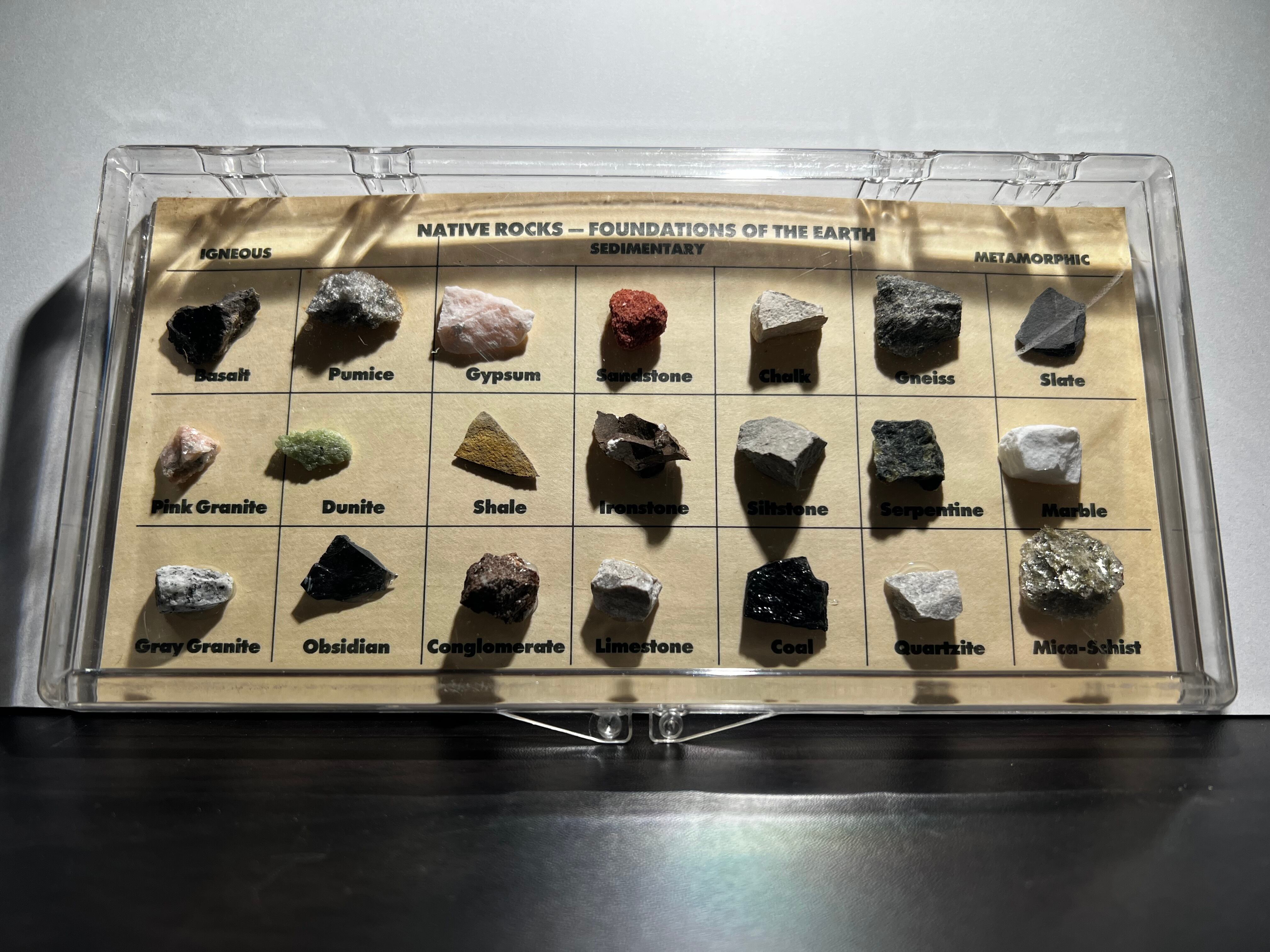 プラスチック製の薄いケースに21種の小さな鉱物や岩石がセットされた組標本で、約30年前ほど前の古いものです。