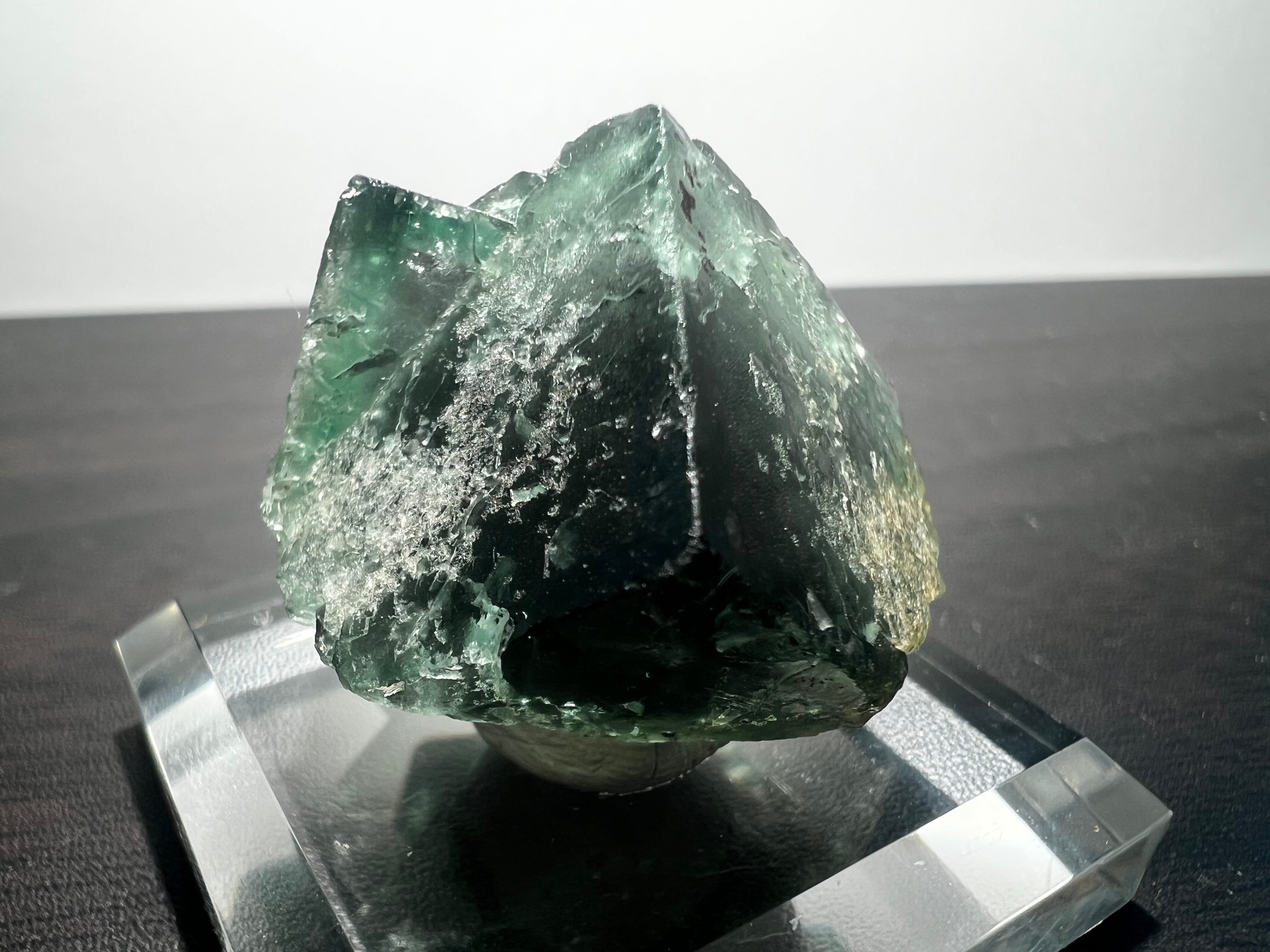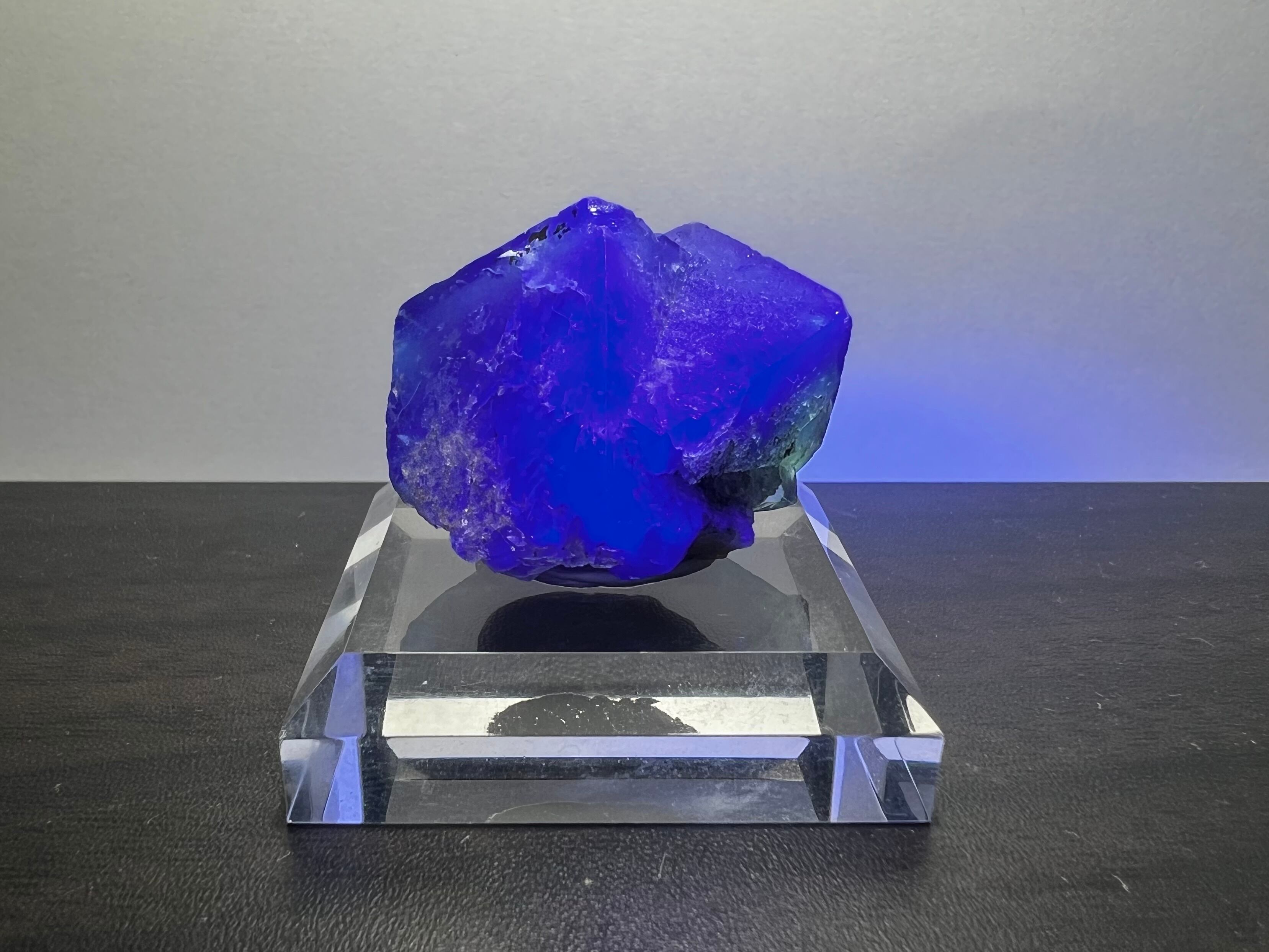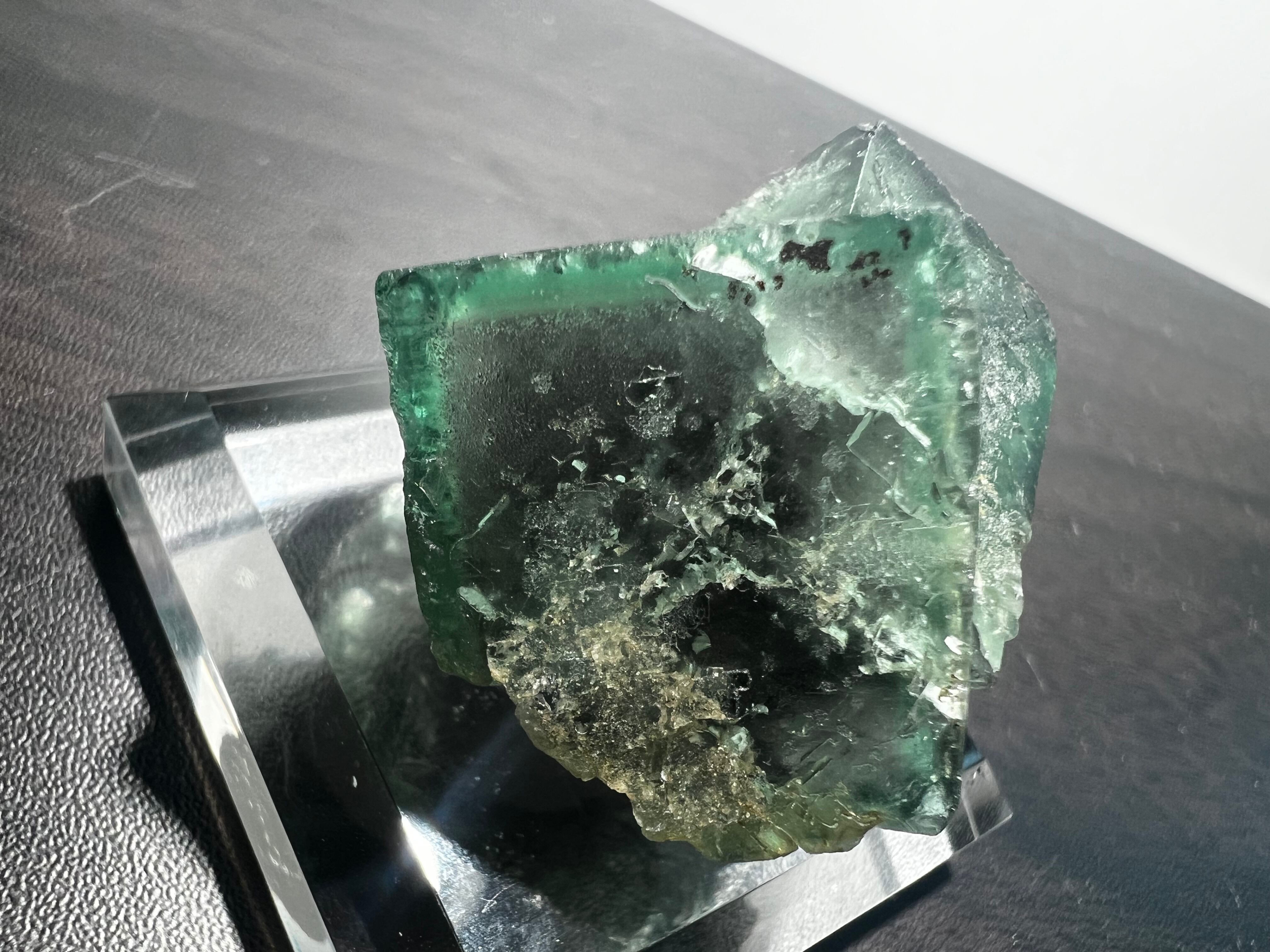 非常に多数の蛍石を産しているイギリス有名鉱山のグリーンに薄いパープルのゾーニングの蛍石で、紫外線長波(365nm)で強烈な蛍光(画像7枚目)を示すことでも有名です。窓際の太陽光でも蛍光します。