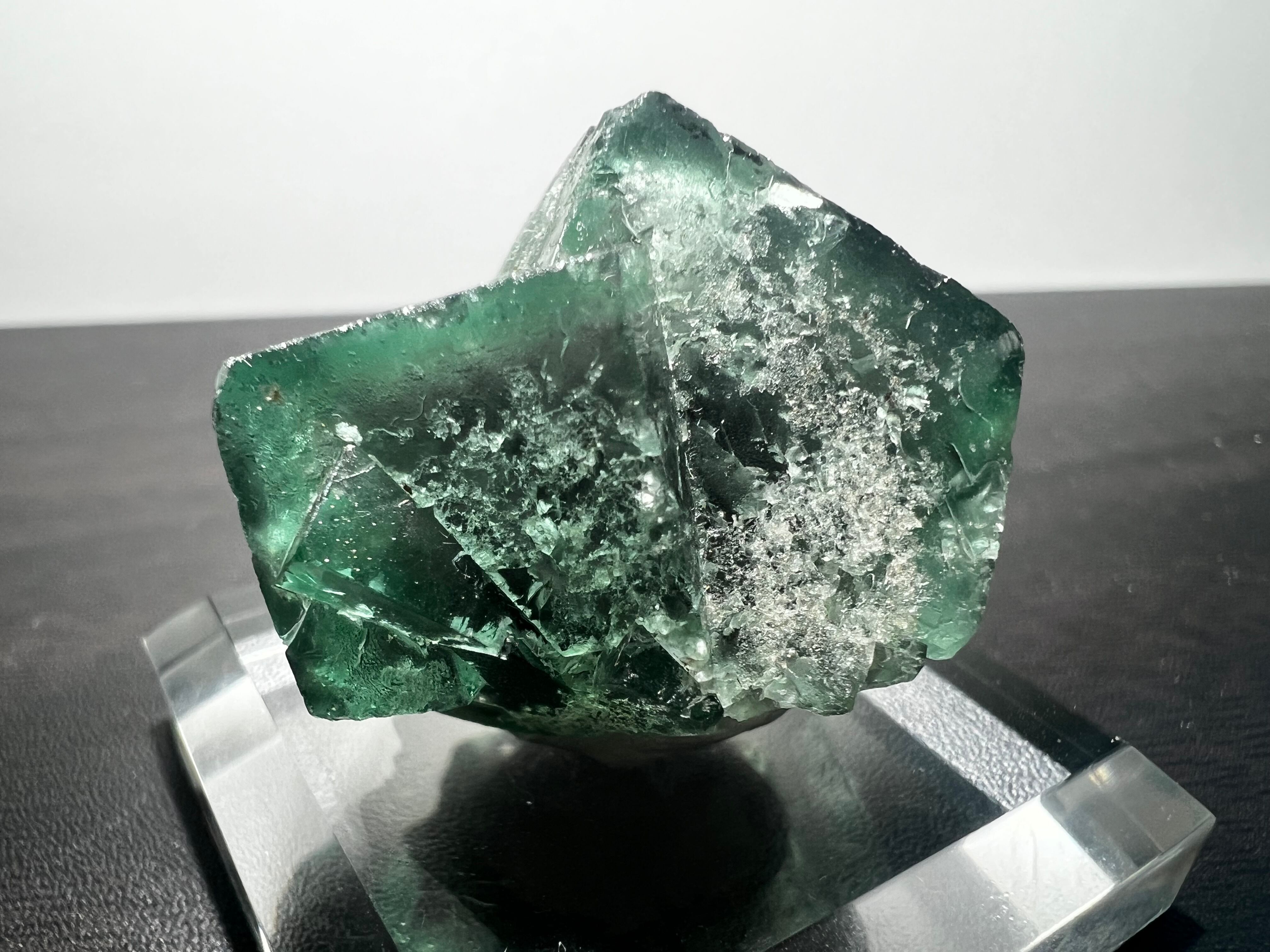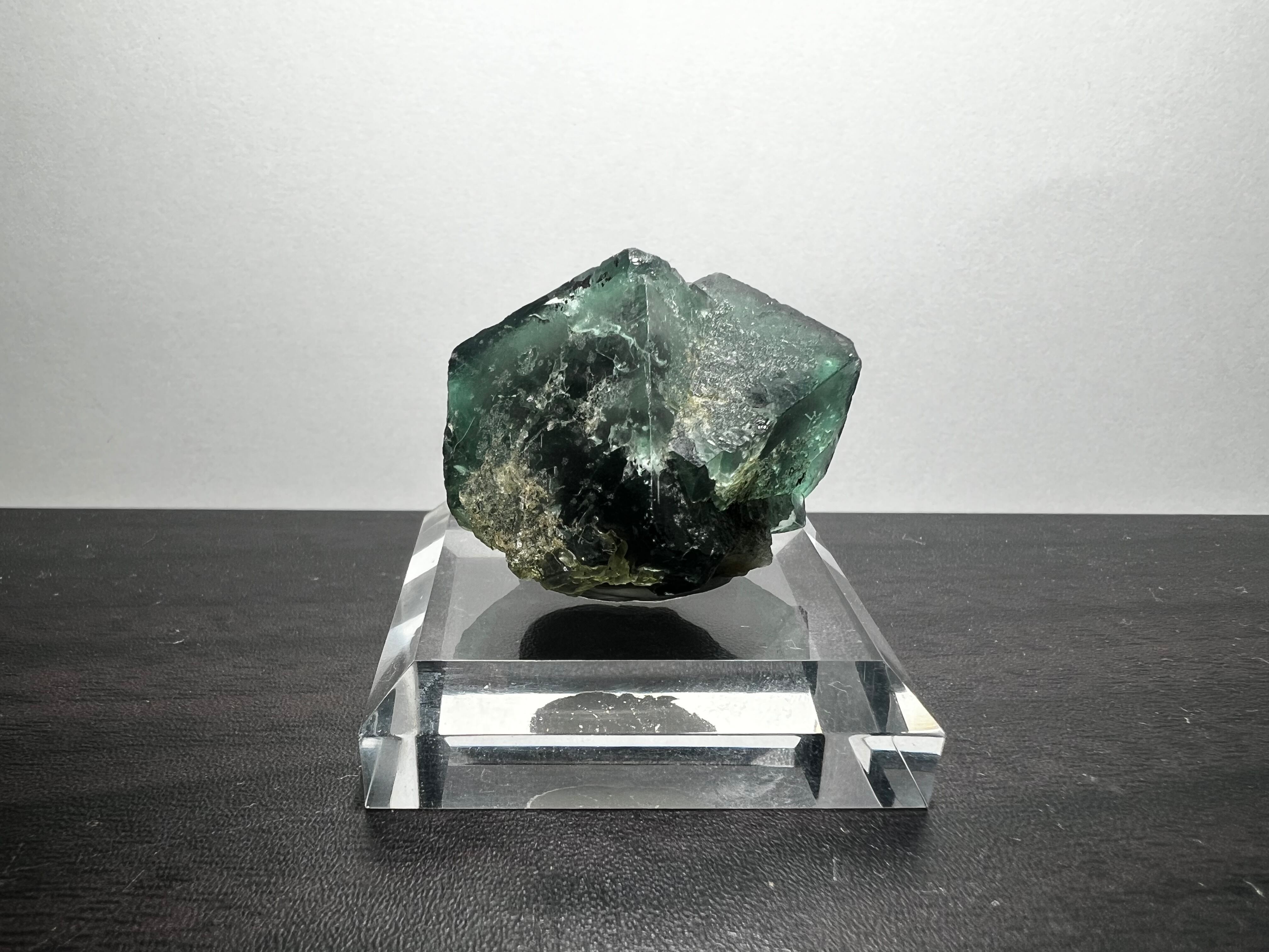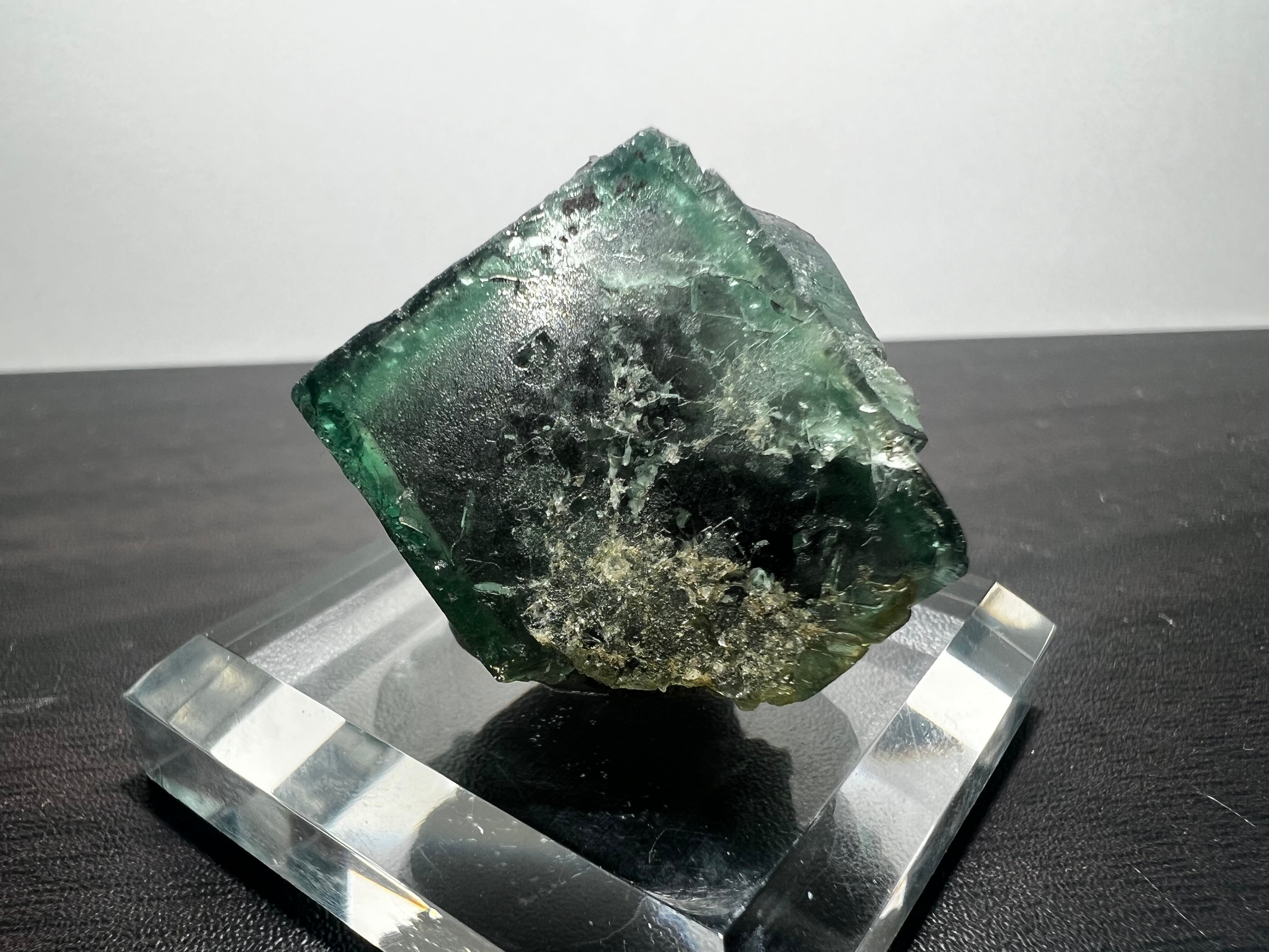 非常に多数の蛍石を産しているイギリス有名鉱山のグリーンに薄いパープルのゾーニングの蛍石で、紫外線長波(365nm)で強烈な蛍光(画像7枚目)を示すことでも有名です。窓際の太陽光でも蛍光します。