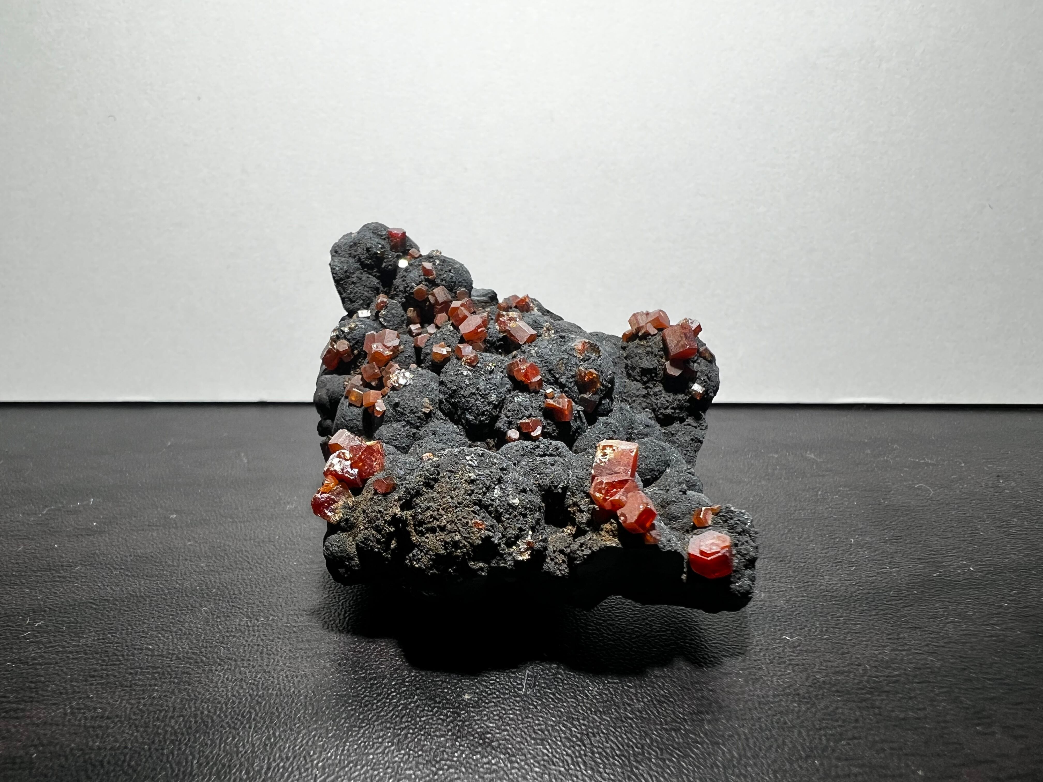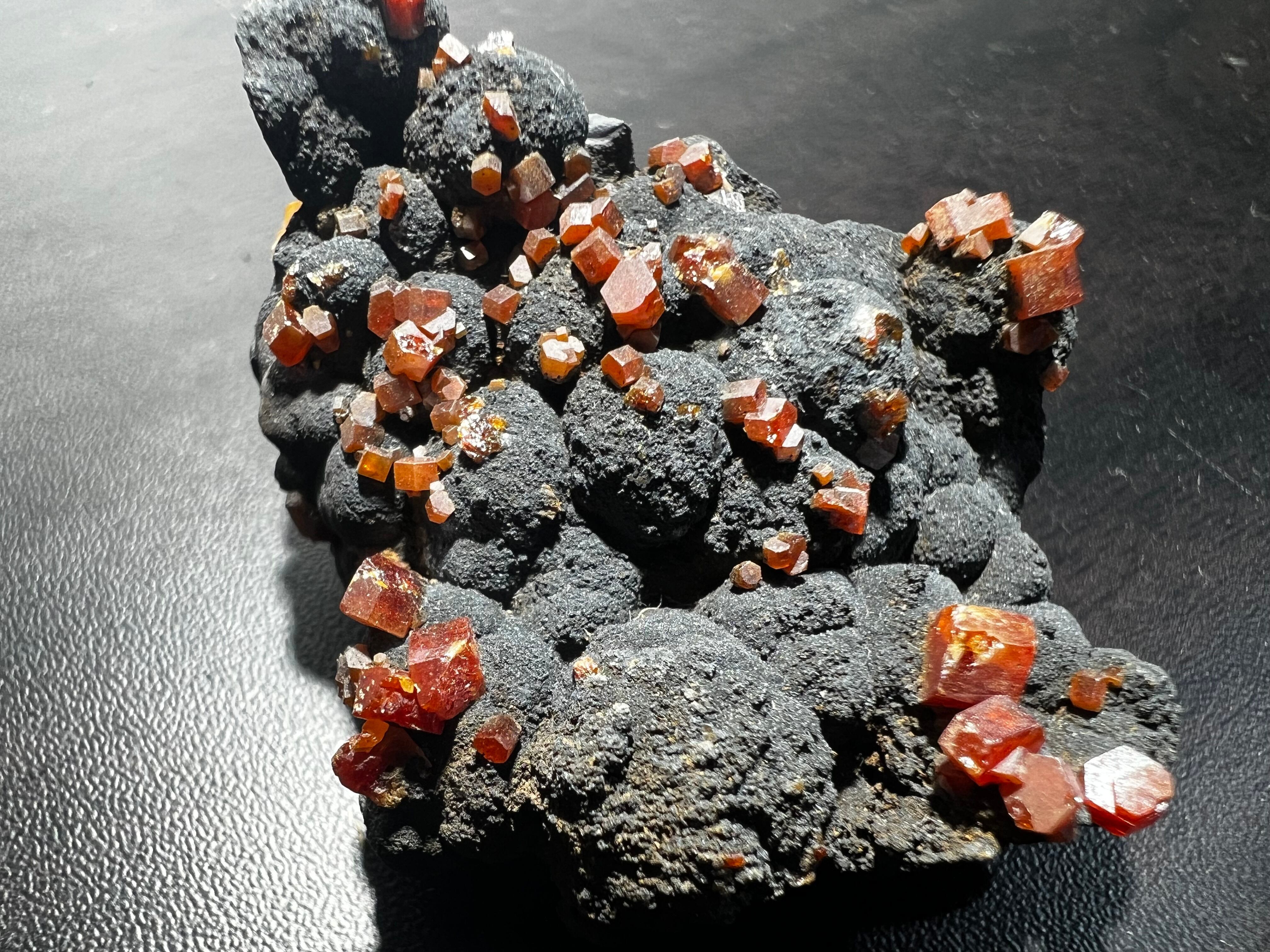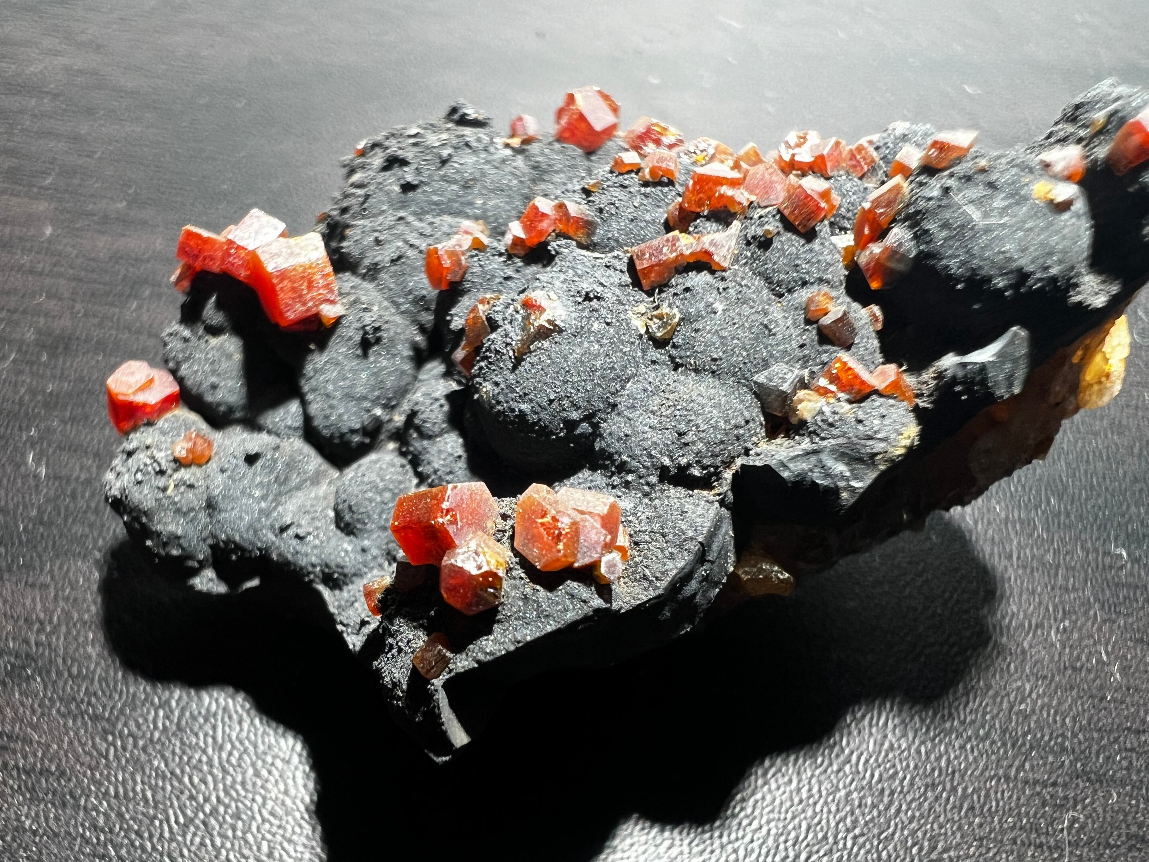 様々な産状で出回っているバナジン鉛鉱で人気のあるタイプの物で、黒いモコモコとしたマンガン鉱物(含鉛ホランド鉱)上に端正なバナジン鉛鉱が散らばるタイプになります。黒と赤のコントラストが映える好標本です。
