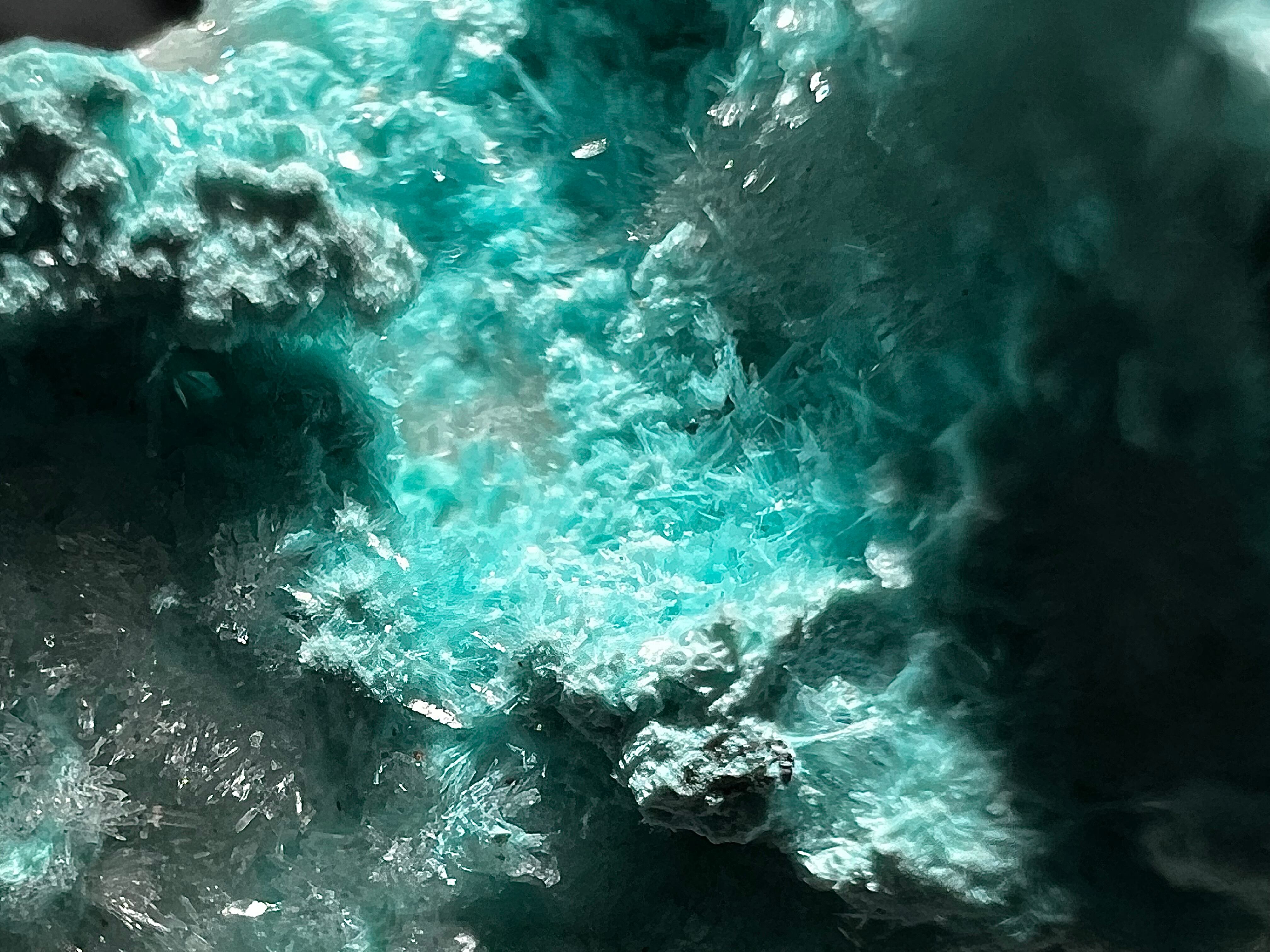 水色のクリソコラ上に銅の二次鉱物である鮮やかな緑色をした針状の水亜鉛銅鉱が生じています。