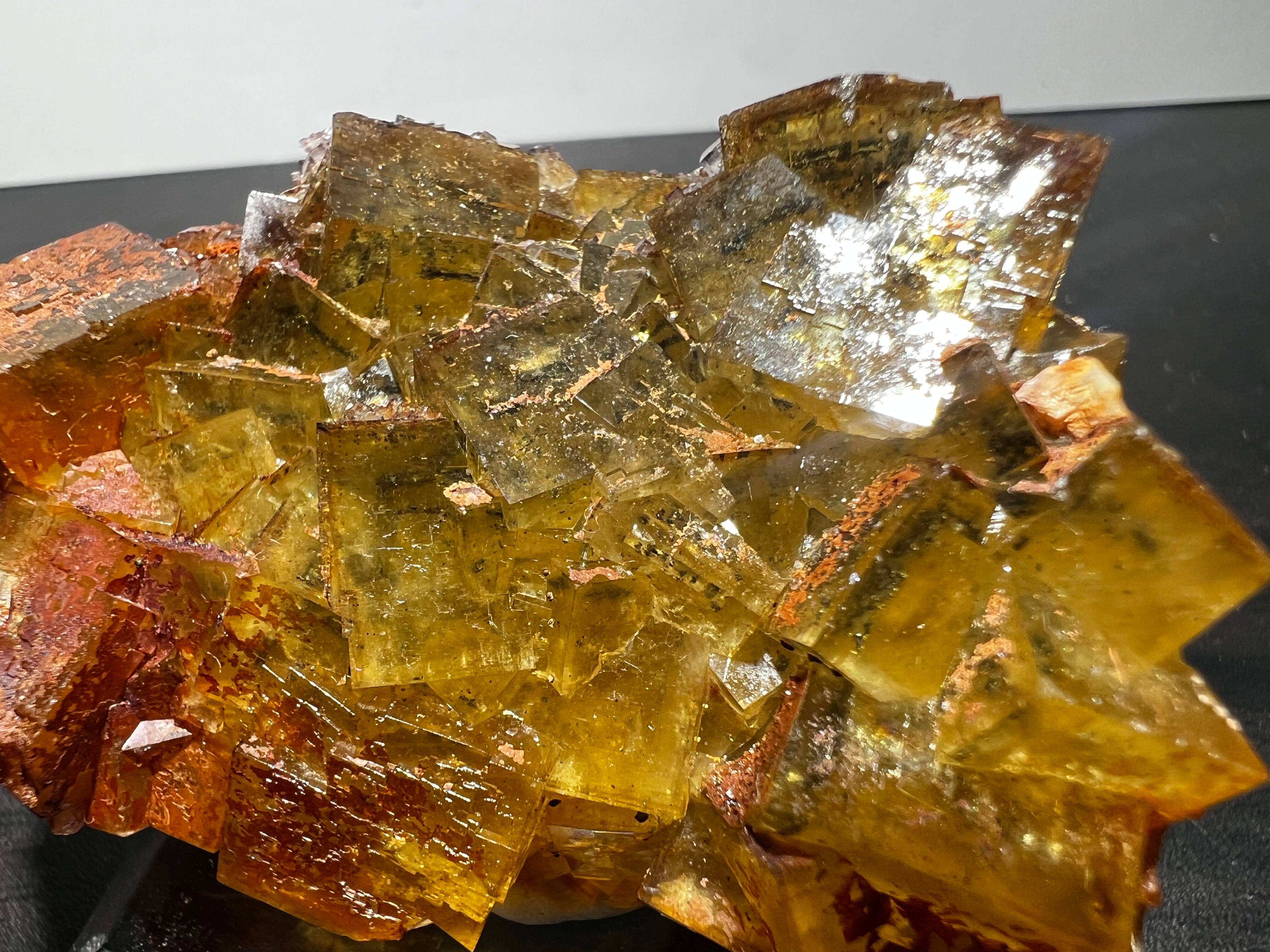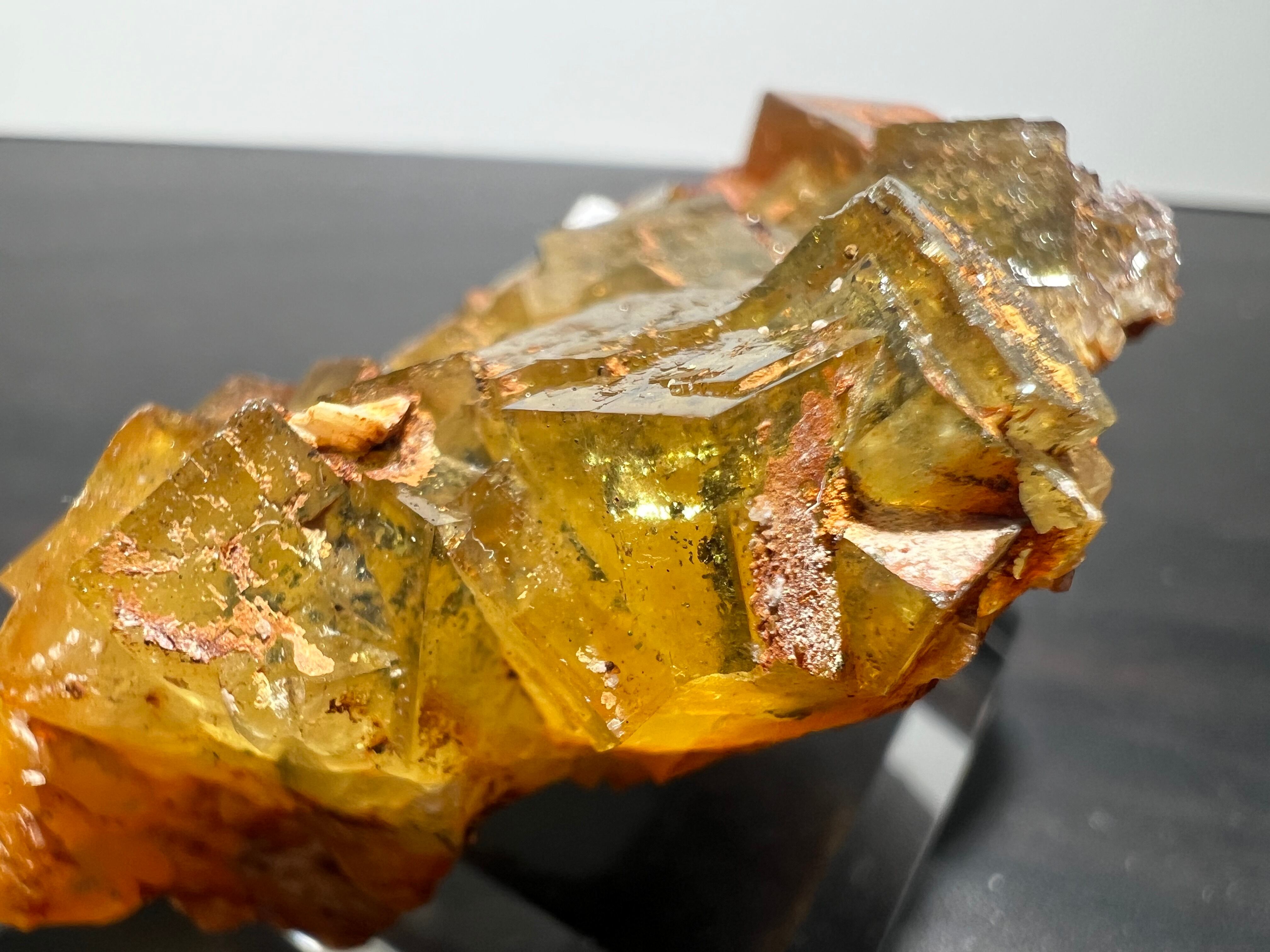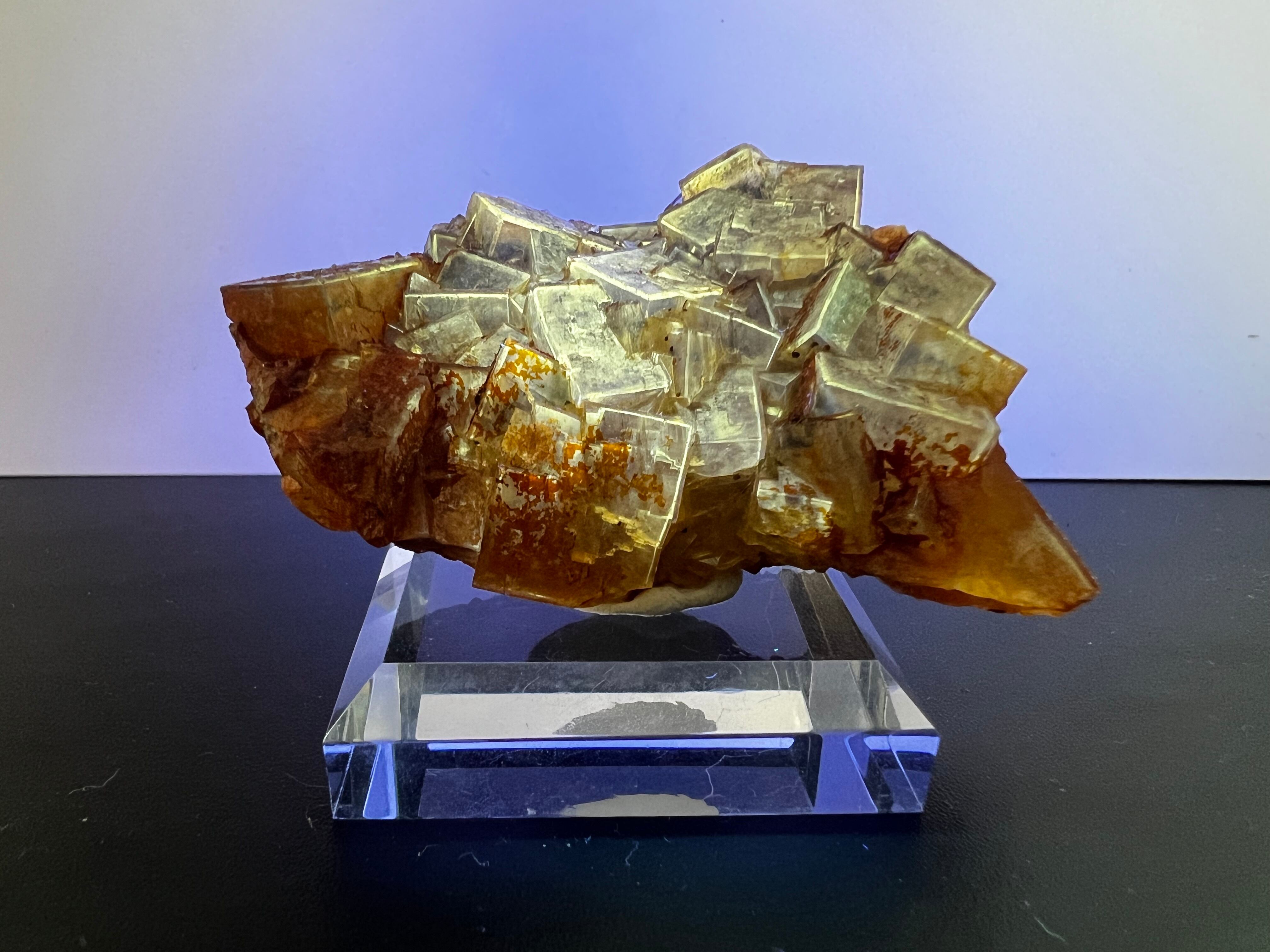 多数の蛍石の産地を有するスペインですが、このモスコーナ地方では本品のような黄色〜橙色の物が有名で、紫外線により白色蛍光します。