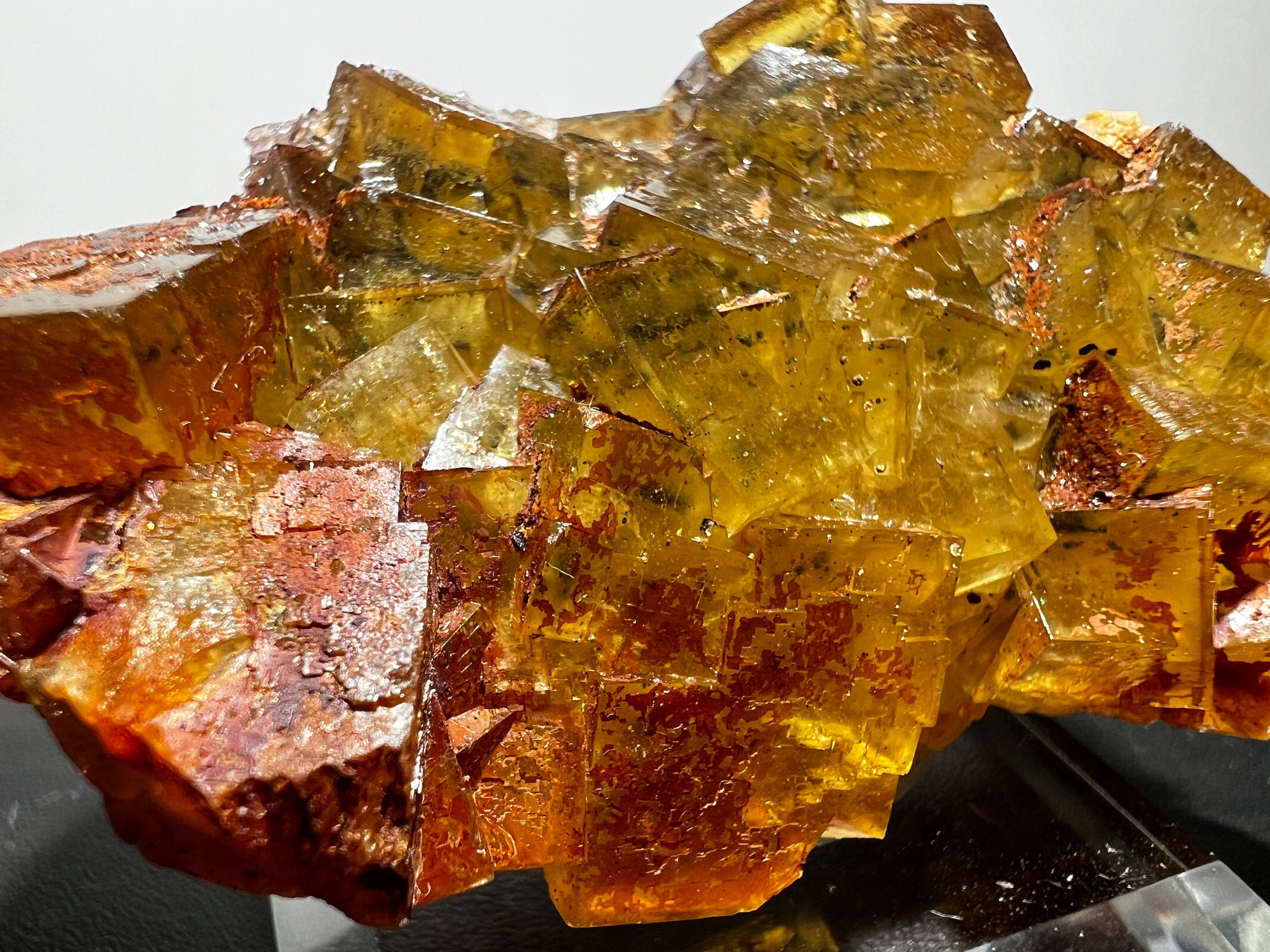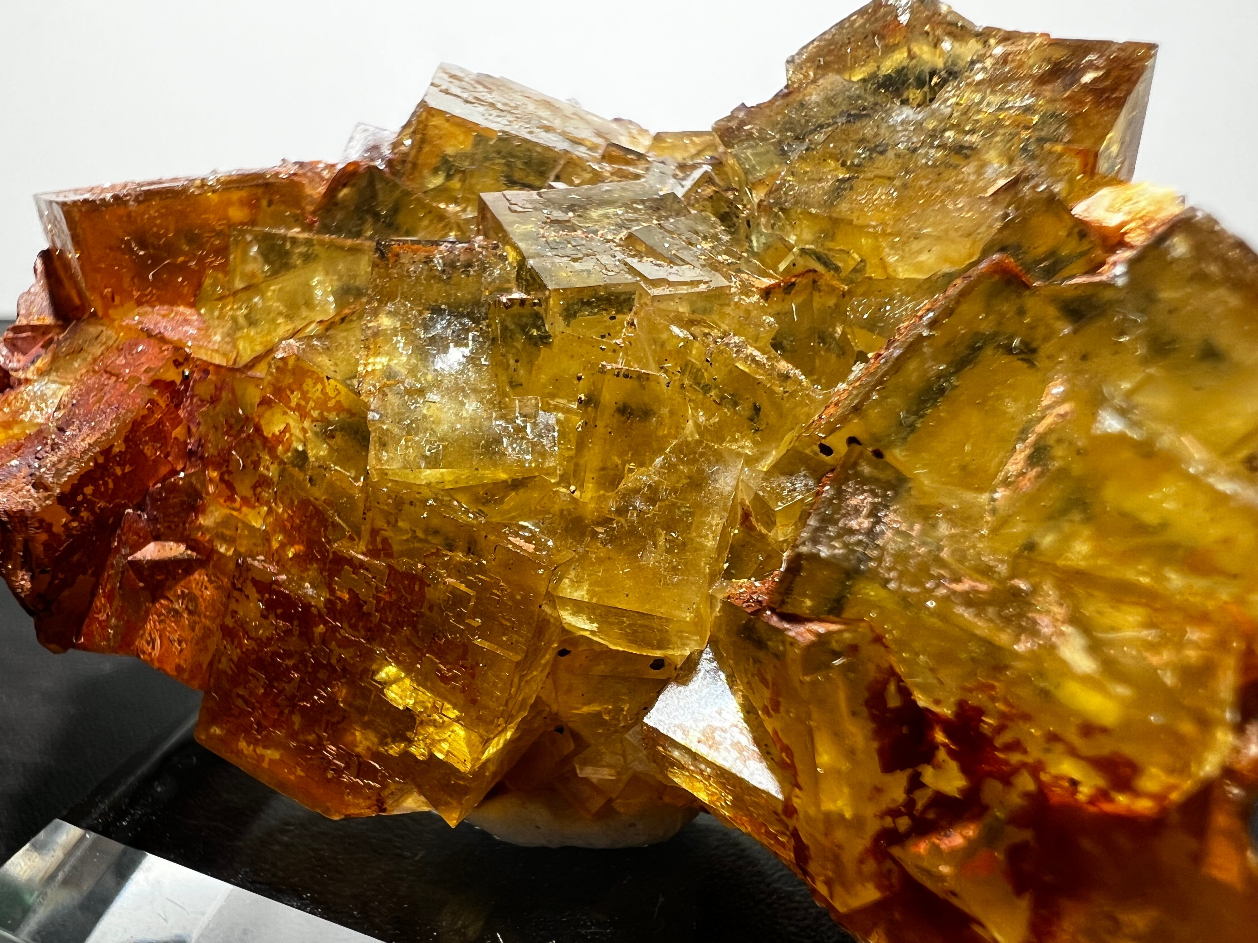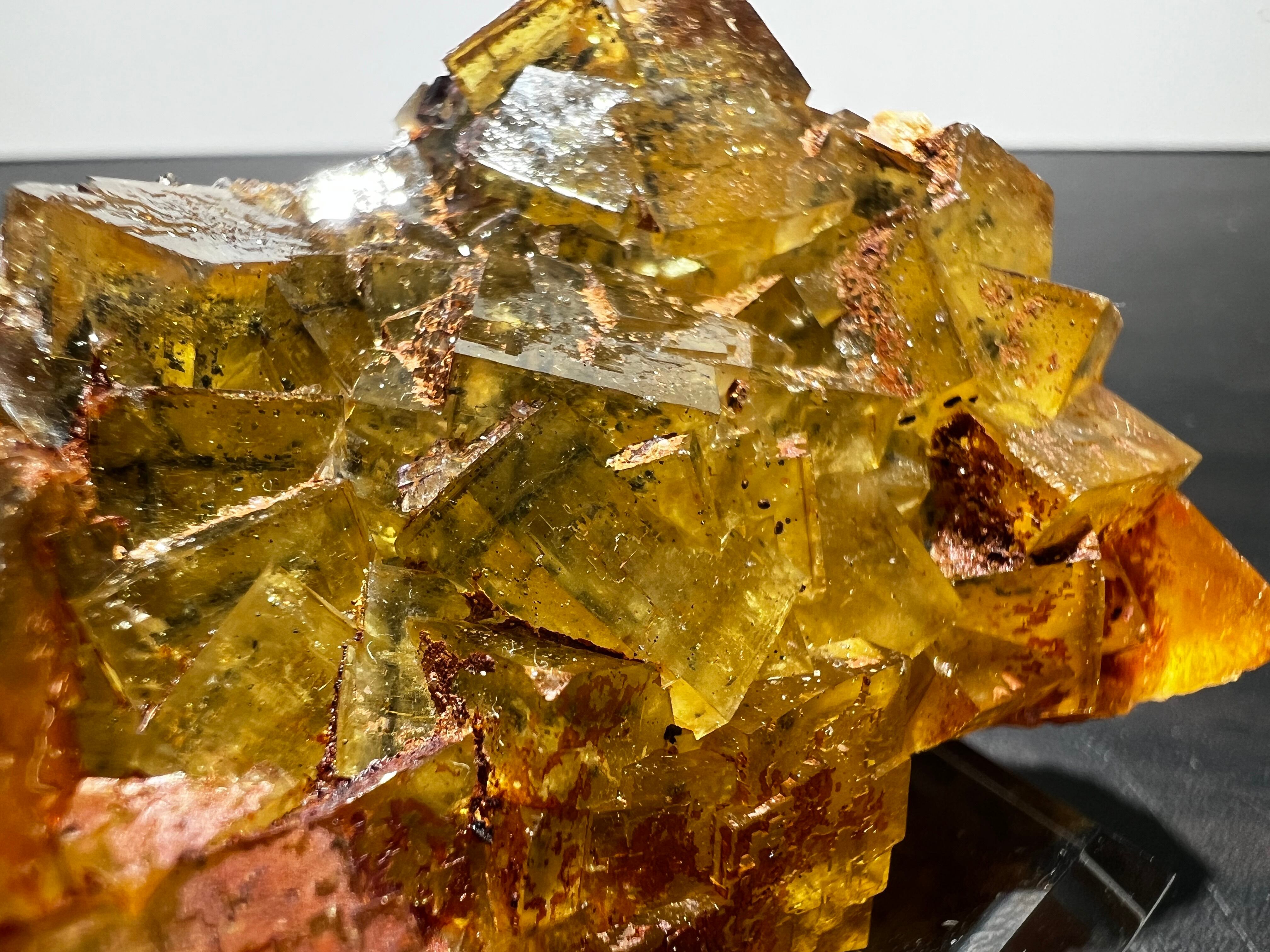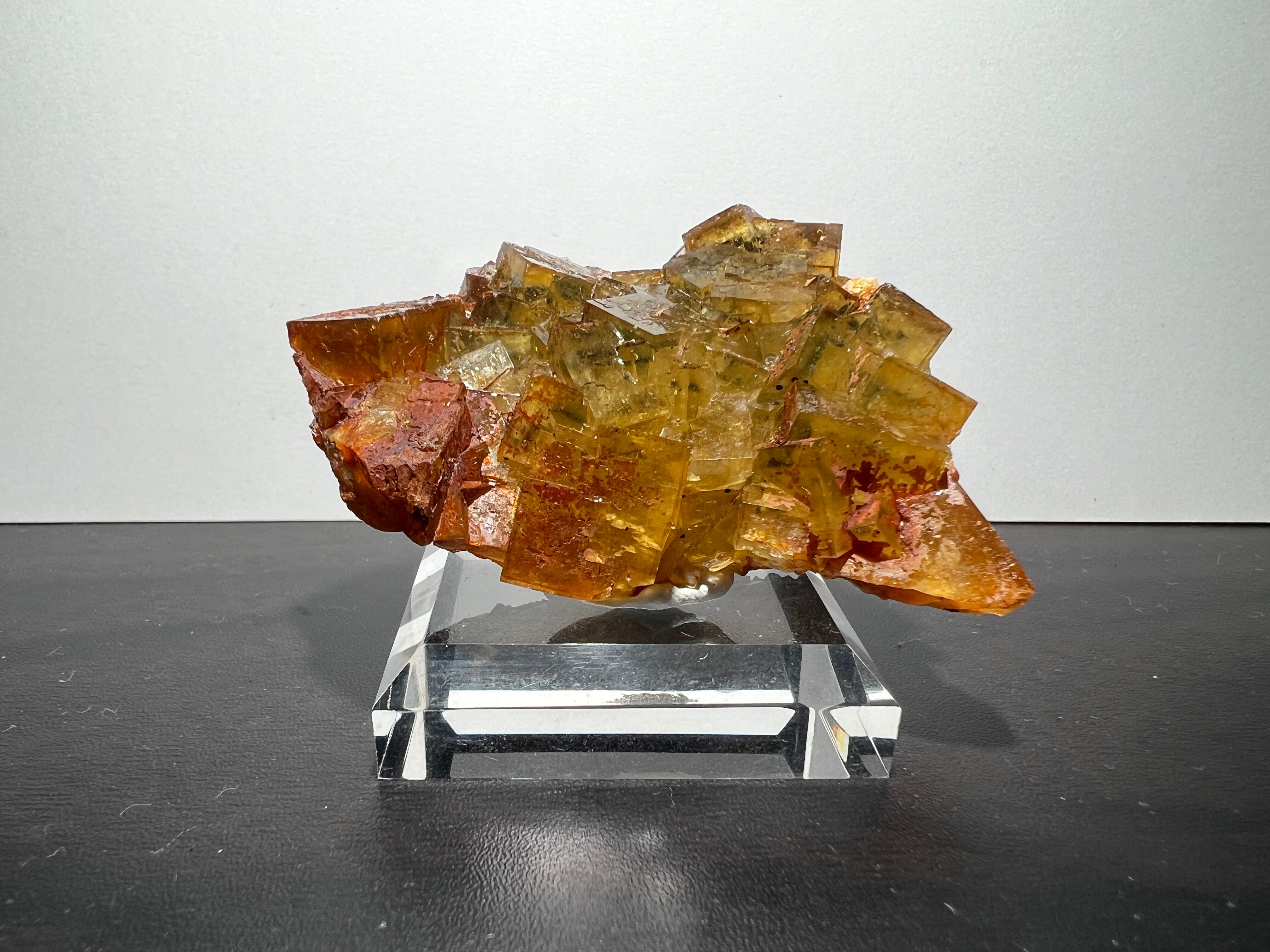 多数の蛍石の産地を有するスペインですが、このモスコーナ地方では本品のような黄色〜橙色の物が有名で、紫外線により白色蛍光します。