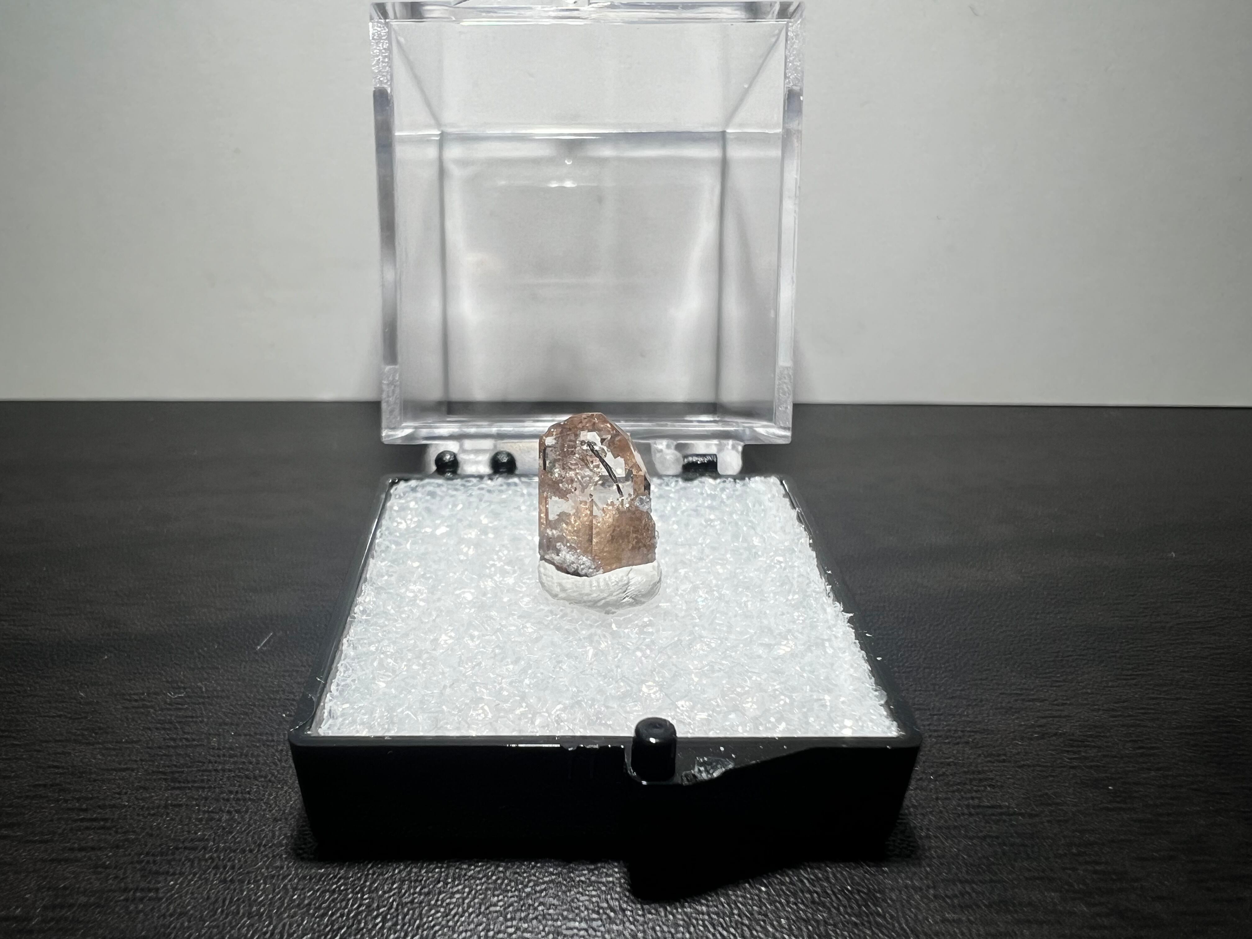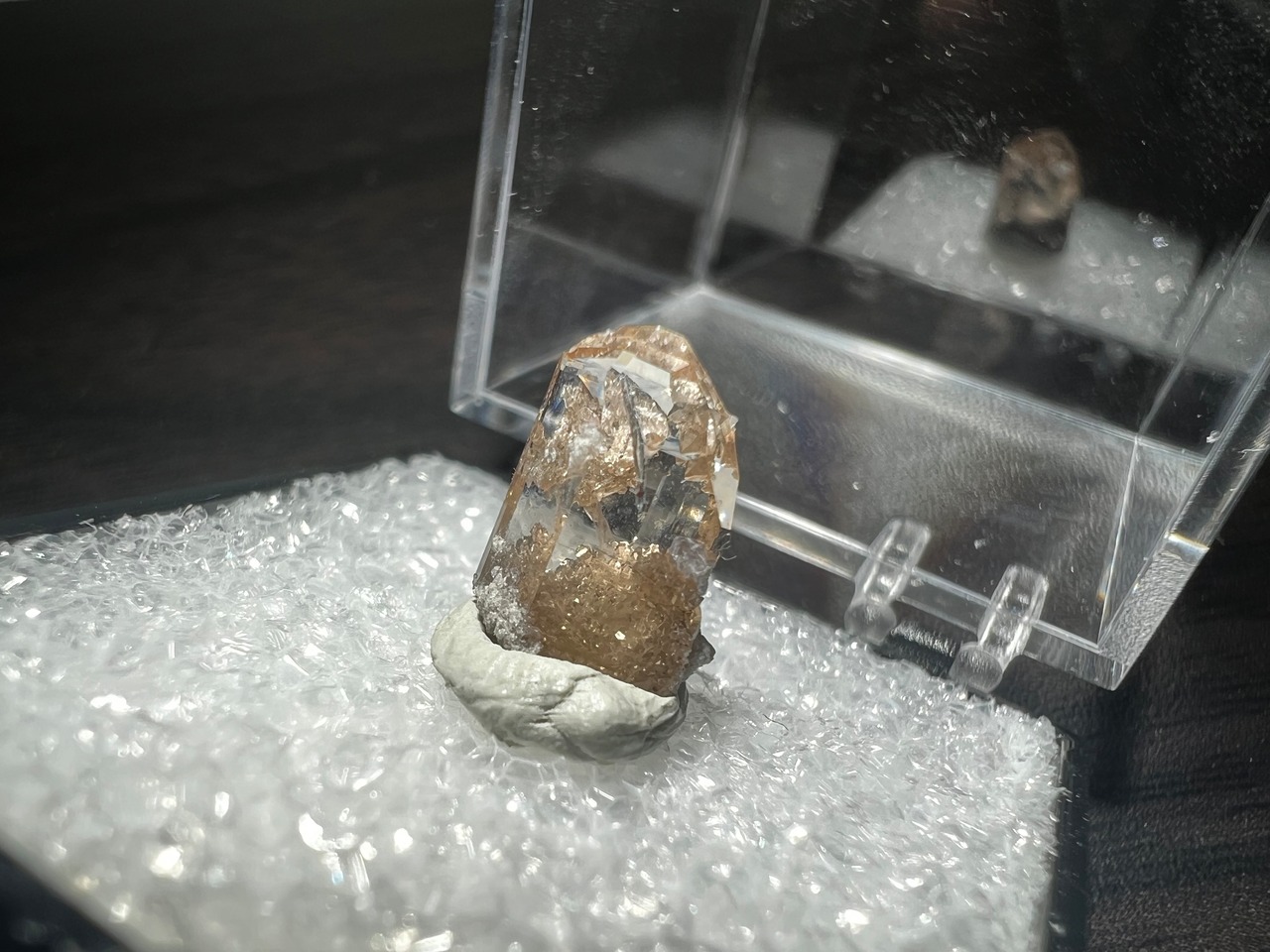 その中でも本品はサイズは小さいですが、淡いシェリー色をしていてカットせずとも宝石と言えるような照りと透明度がある分離結晶だと思います。