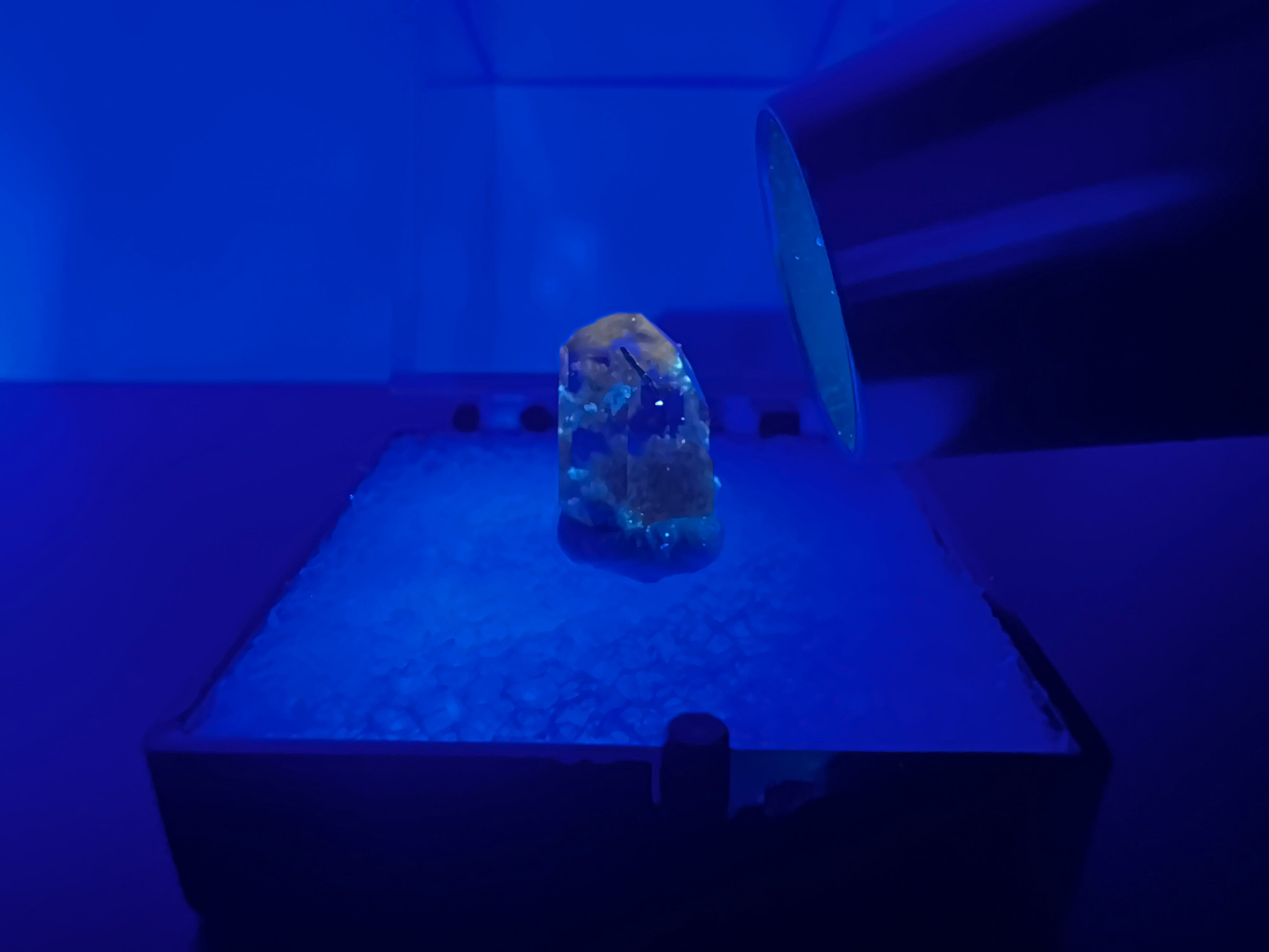 長波紫外線で先端部が黄色に蛍光いたします(褪色の恐れがあるので過度な照射はおすすめいたしません)