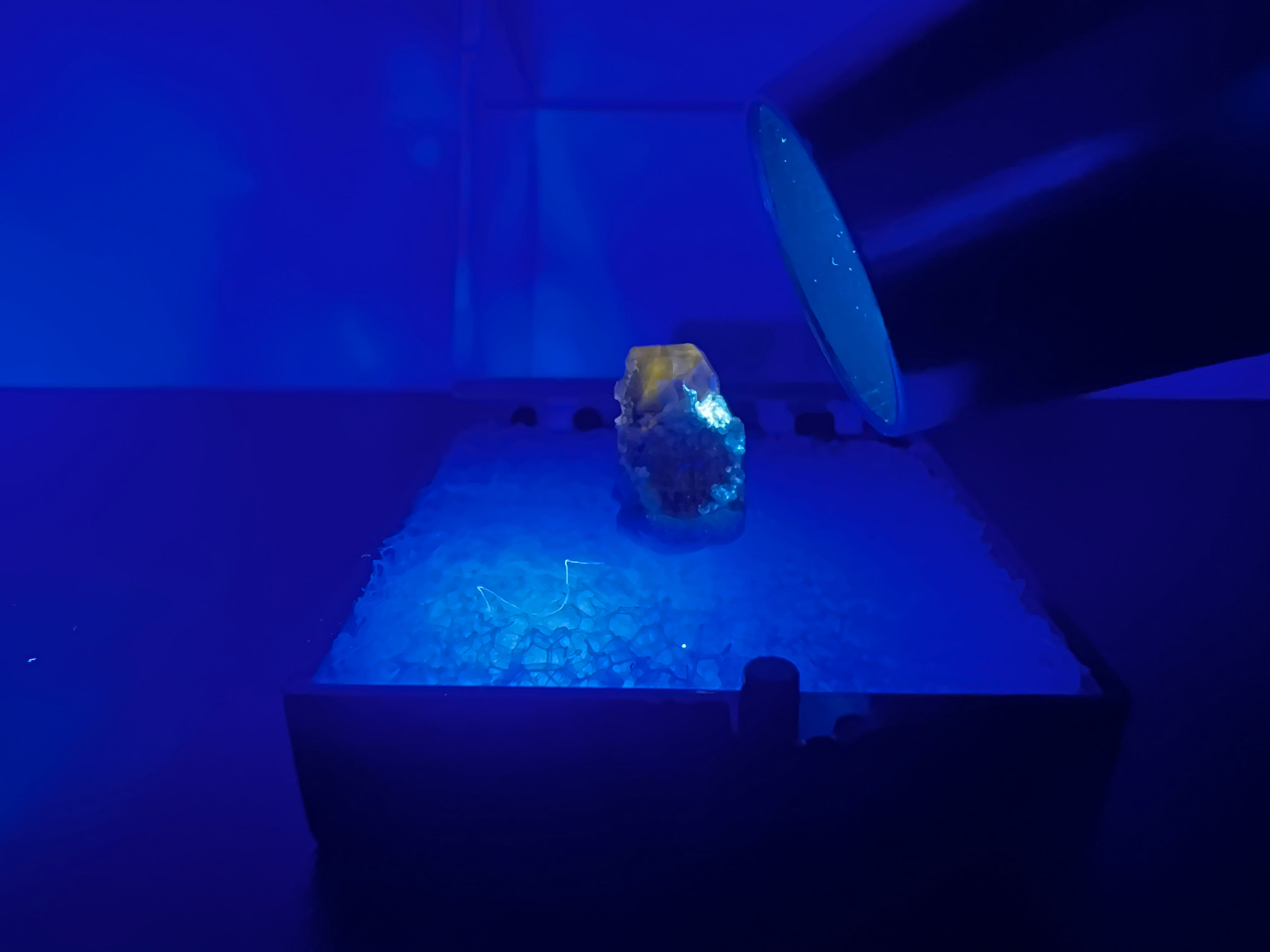 長波紫外線で先端部が黄色に蛍光いたします(褪色の恐れがあるので過度な照射はおすすめいたしません)
