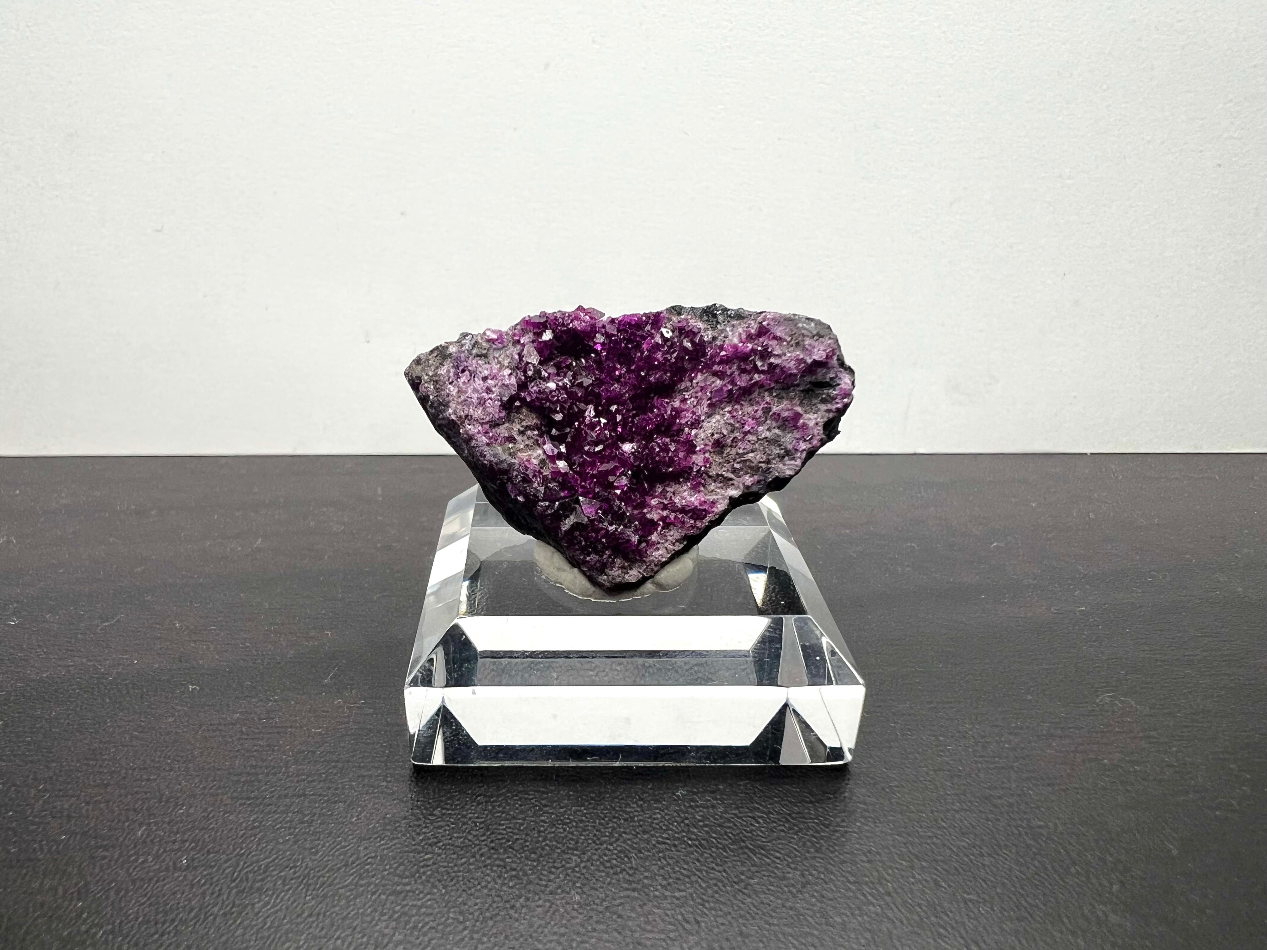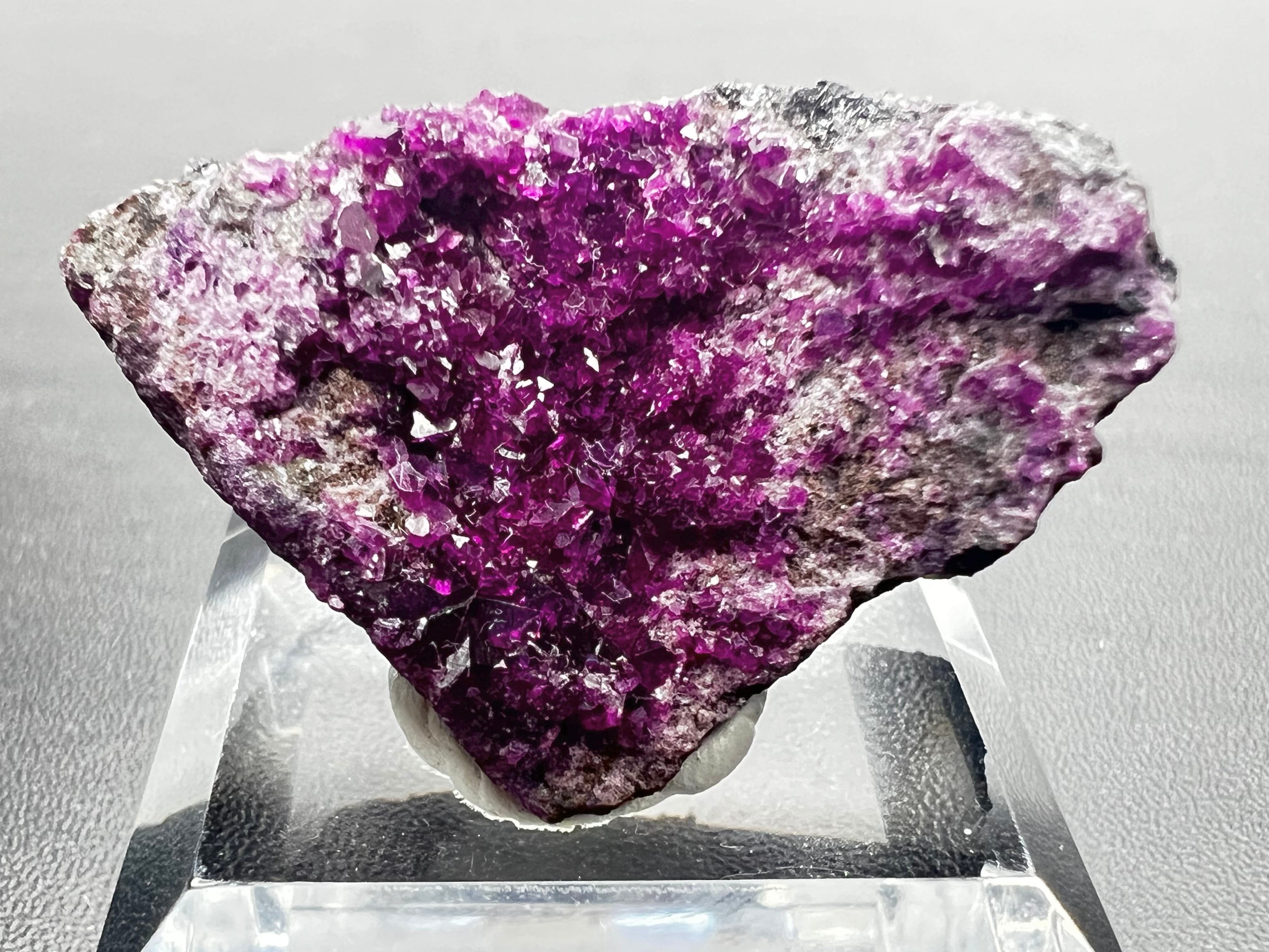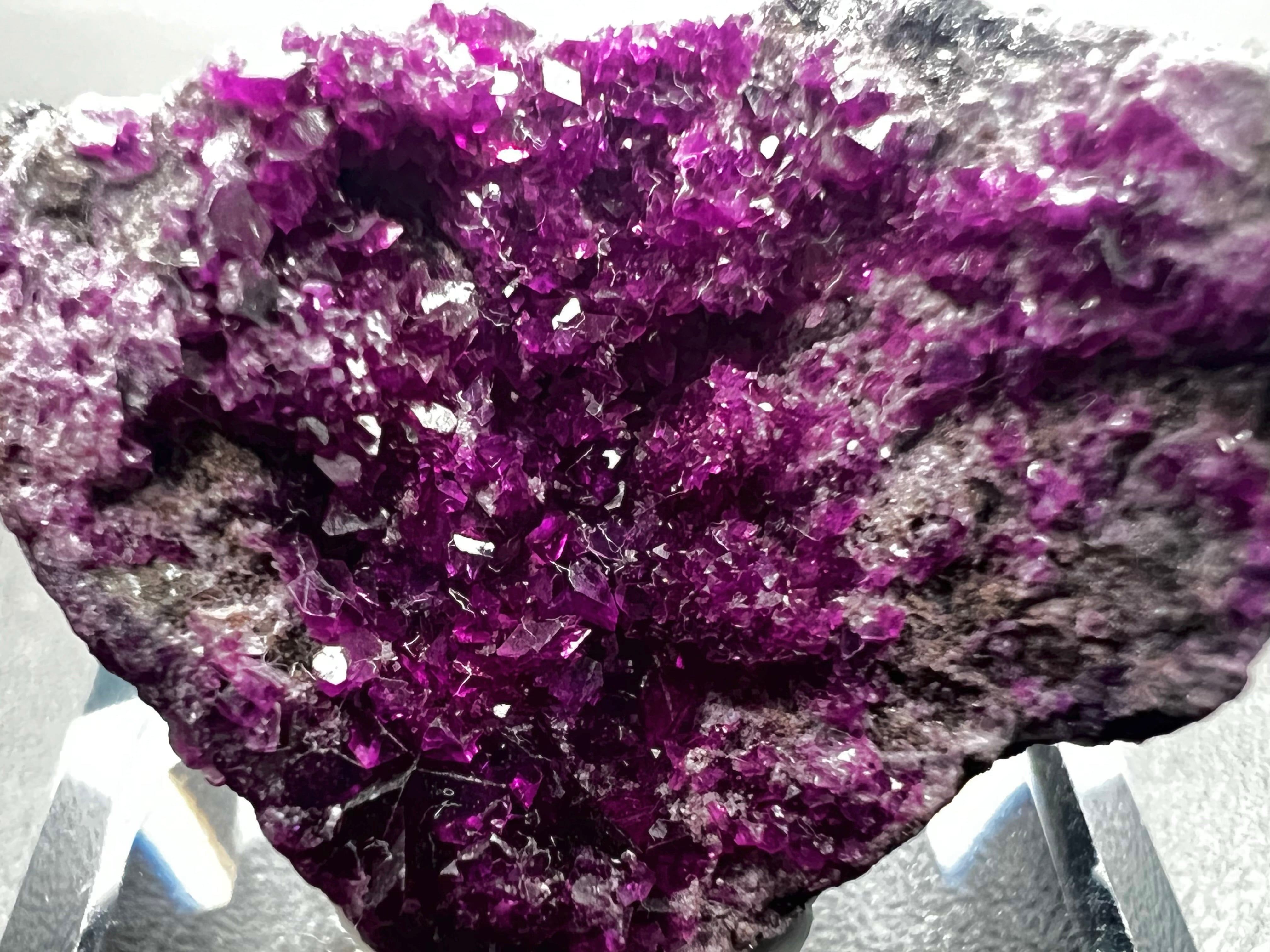 本品は母岩の表面に微細な結晶が密集しており、光を当てることで一面に紫色の細かな煌めきが観察できます。