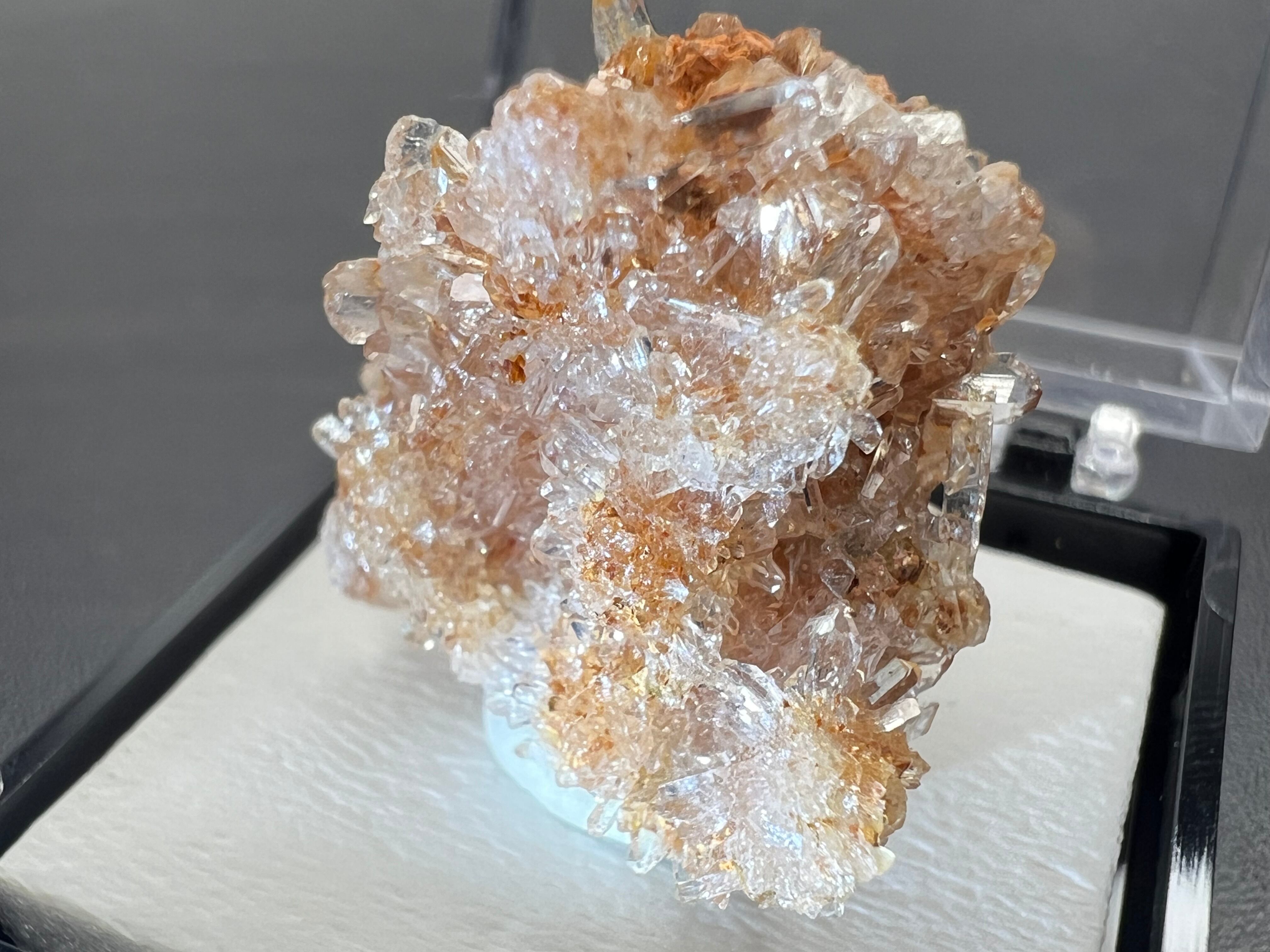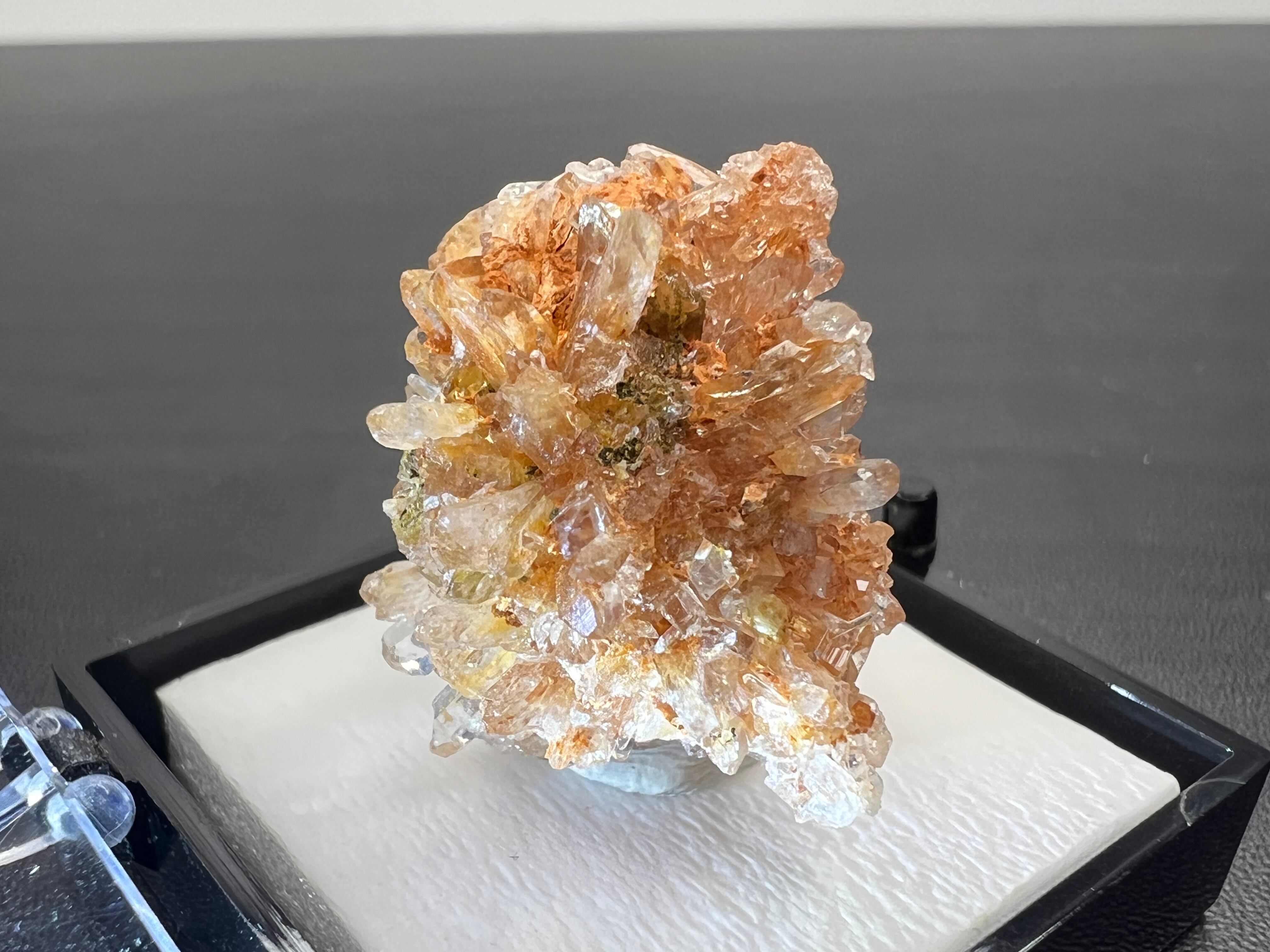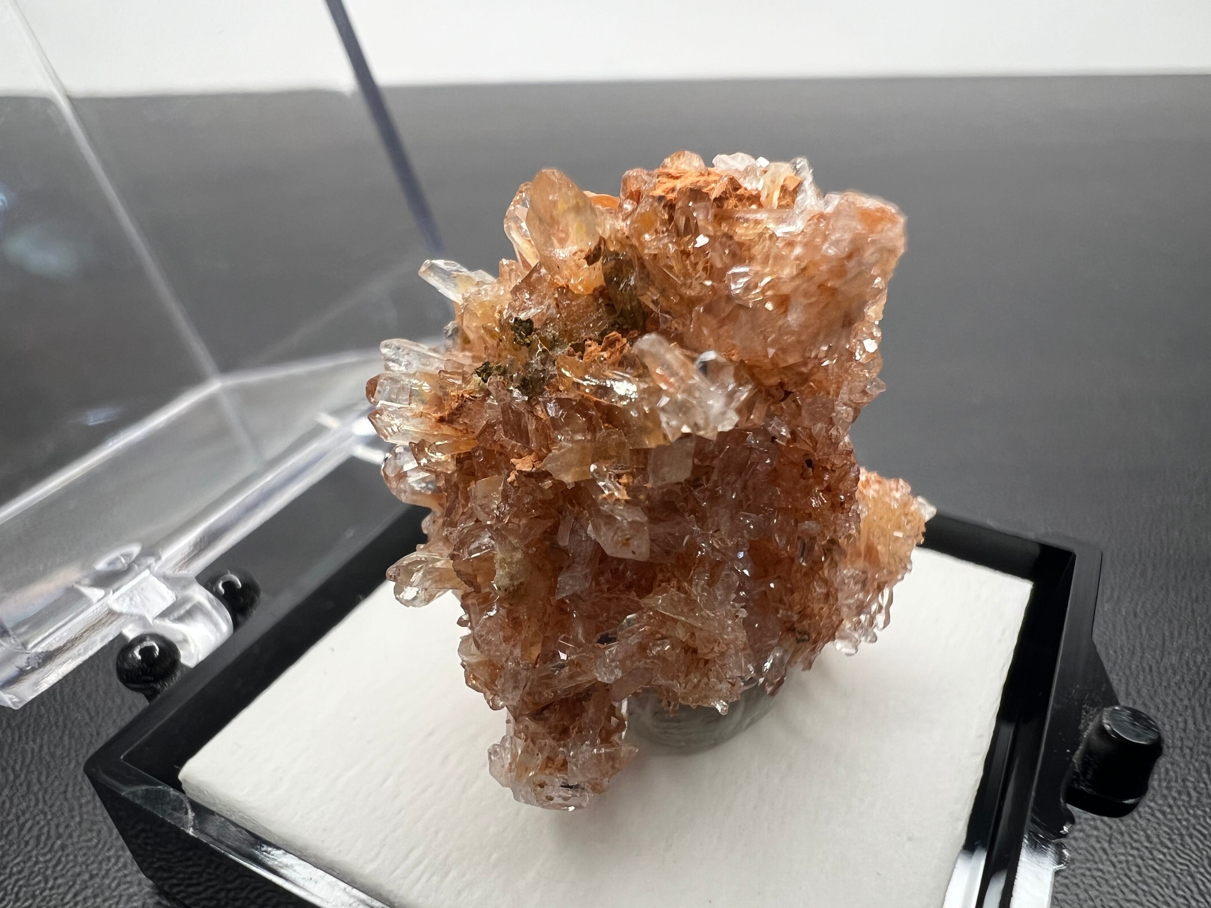 サムネイルサイズのコロンとした小さなクラスターで無色からオレンジ色の結晶が見られます。