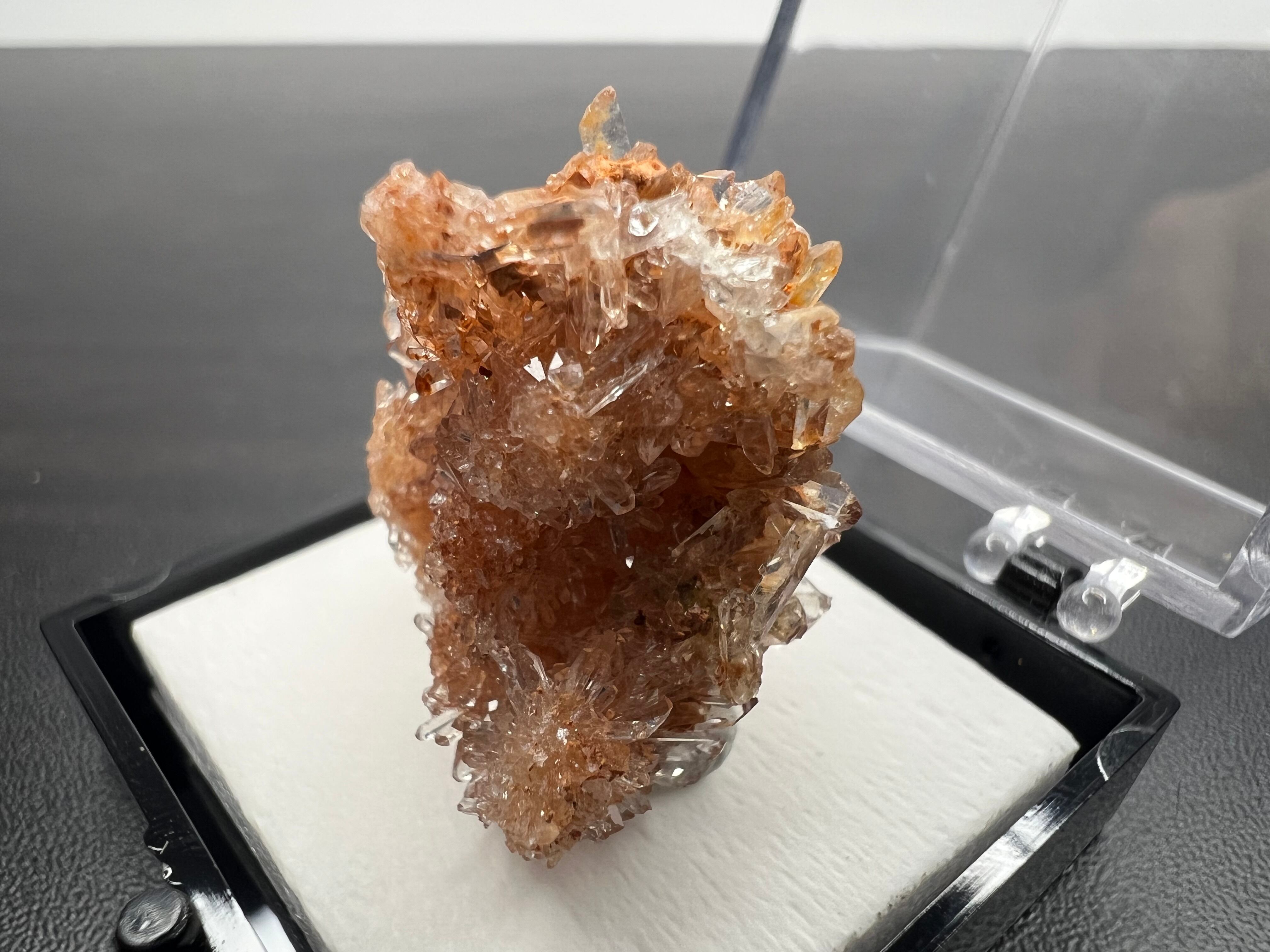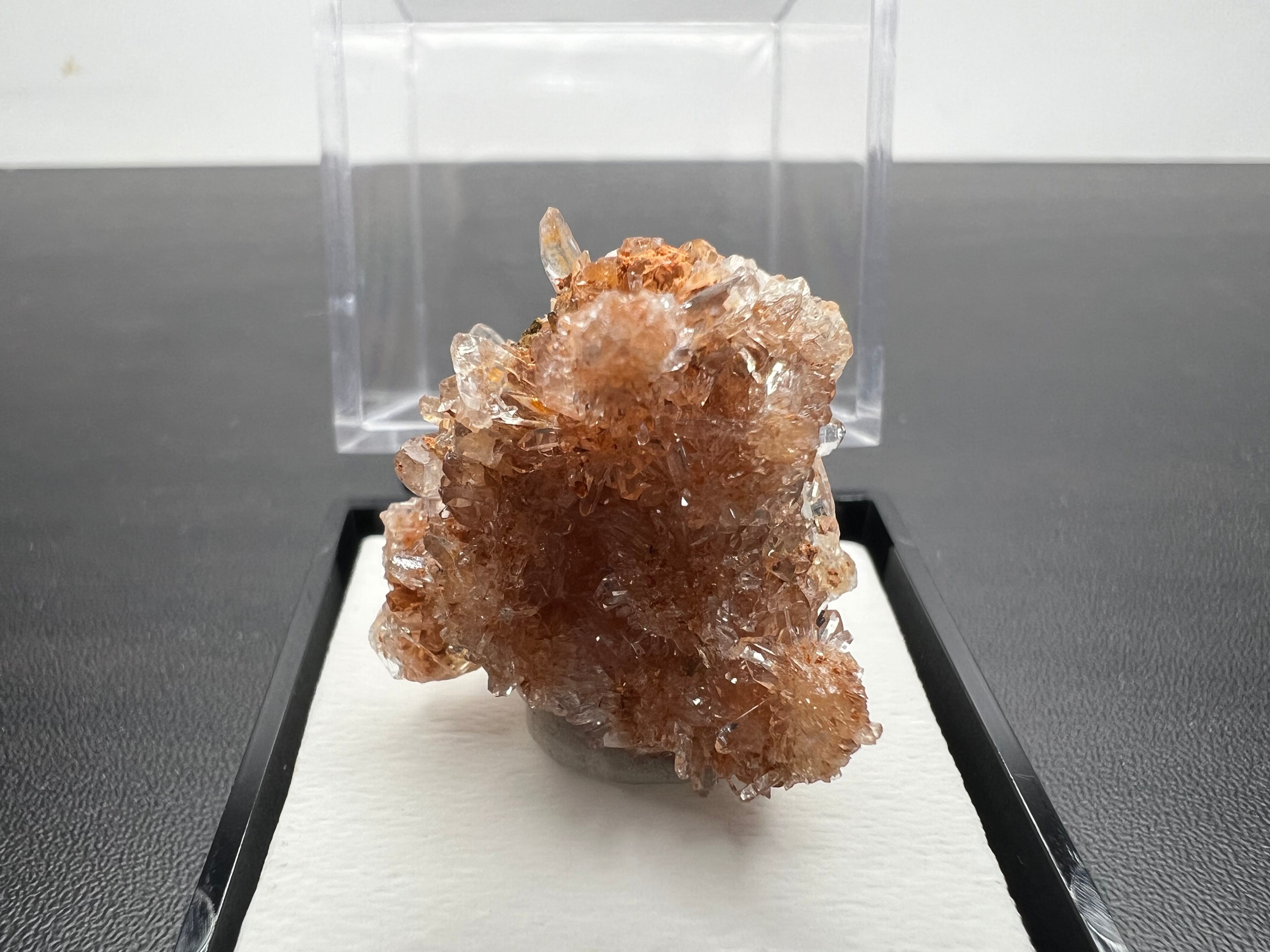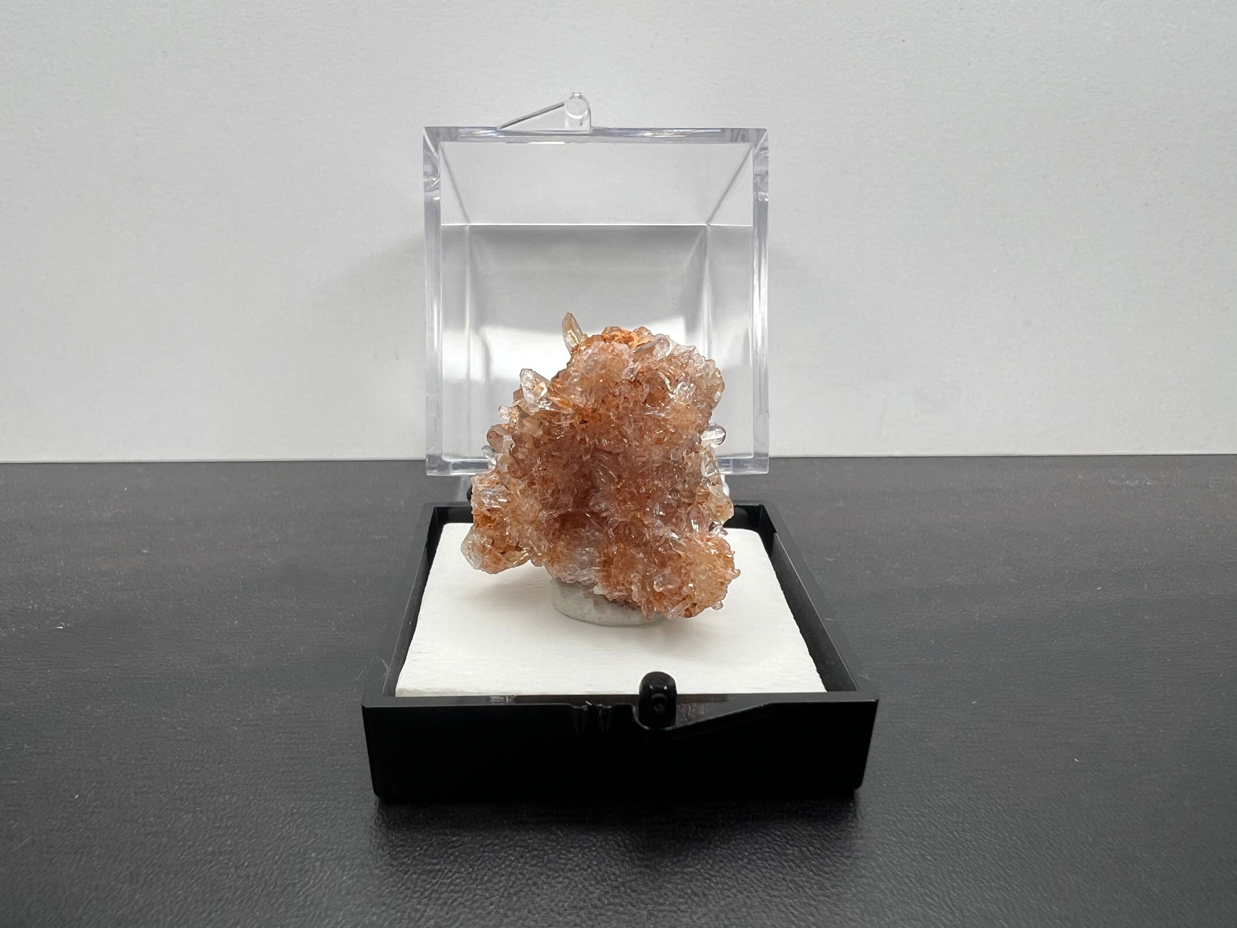 サムネイルサイズのコロンとした小さなクラスターで無色からオレンジ色の結晶が見られます。