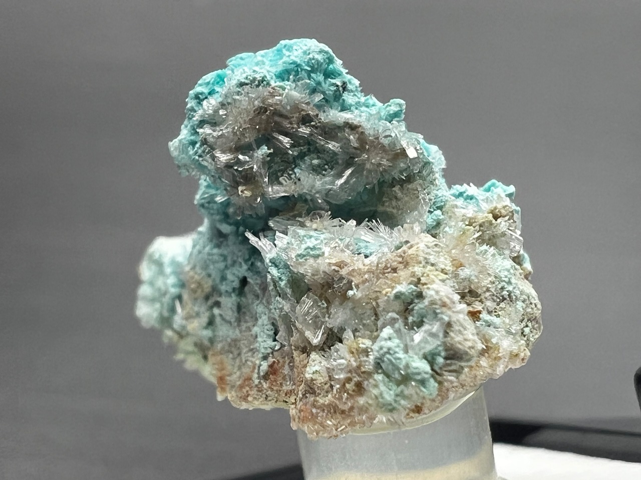 水色のクリソコラ上に銅の二次鉱物である鮮やかな緑色をした針状の水亜鉛銅鉱が生じています。