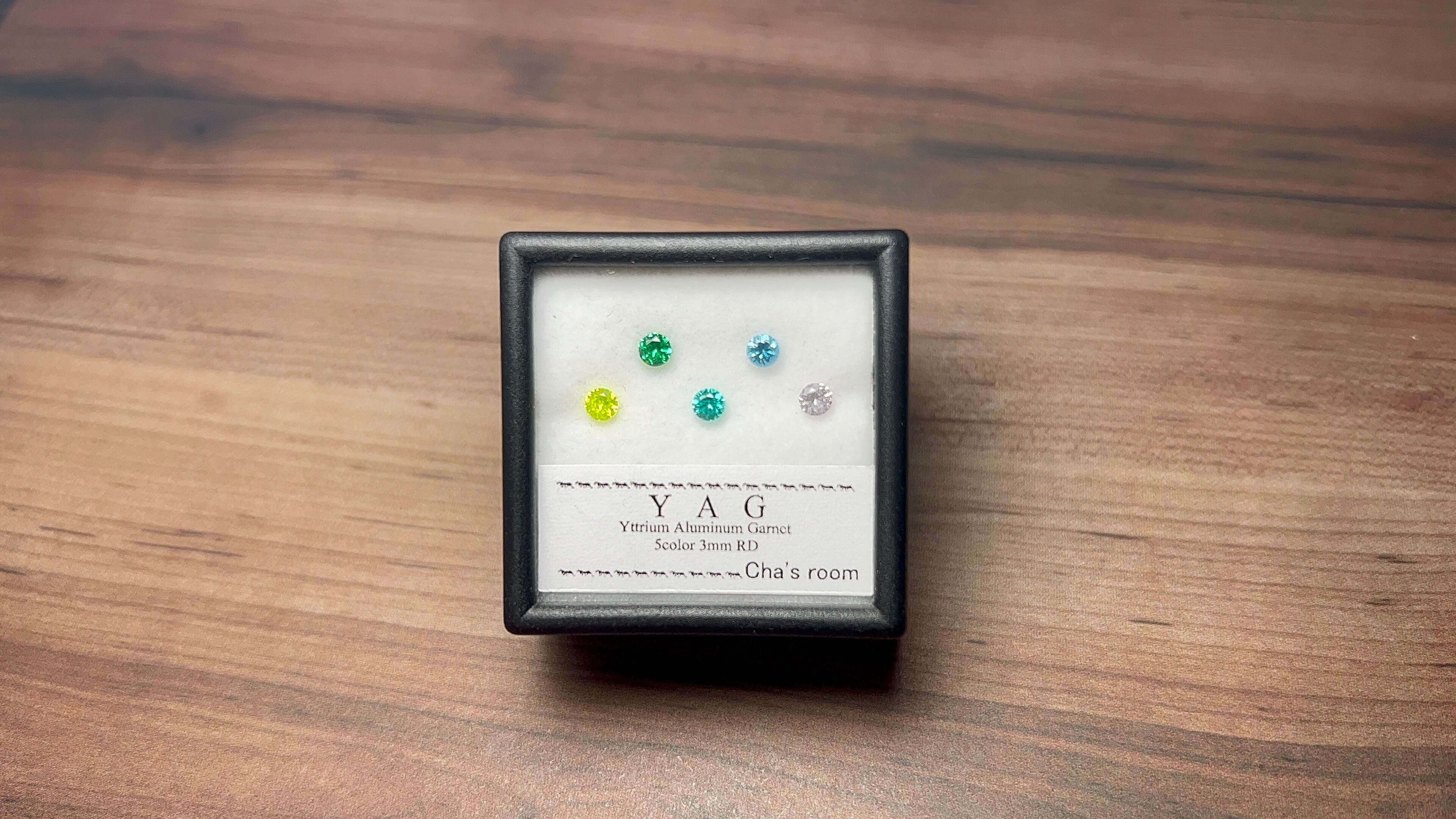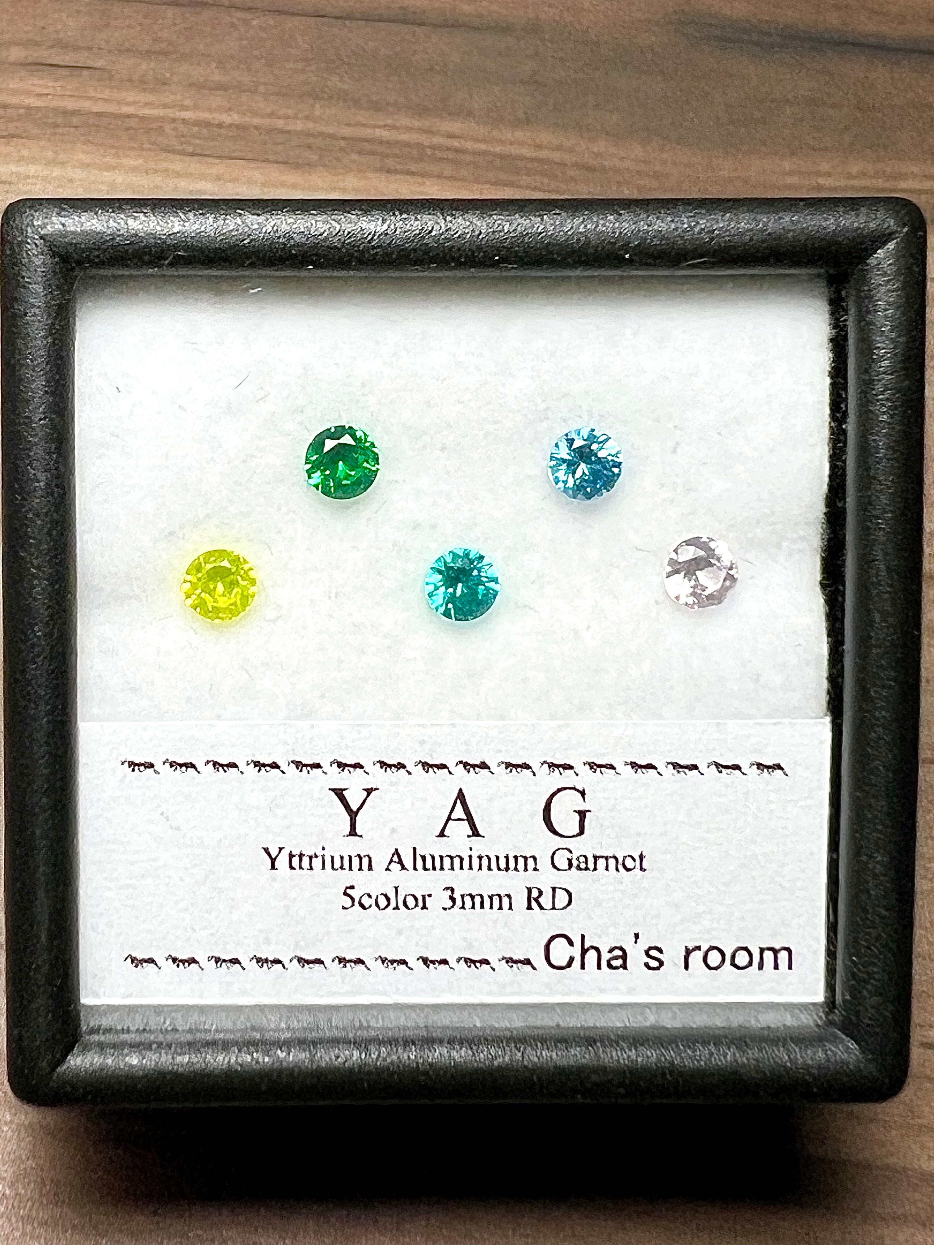 略称のYAGで知られるイットリウムアルミニウムガーネット(Yttrium Aluminum Garnet)の小さなルース(3mmラウンドカット)5色セットになります。