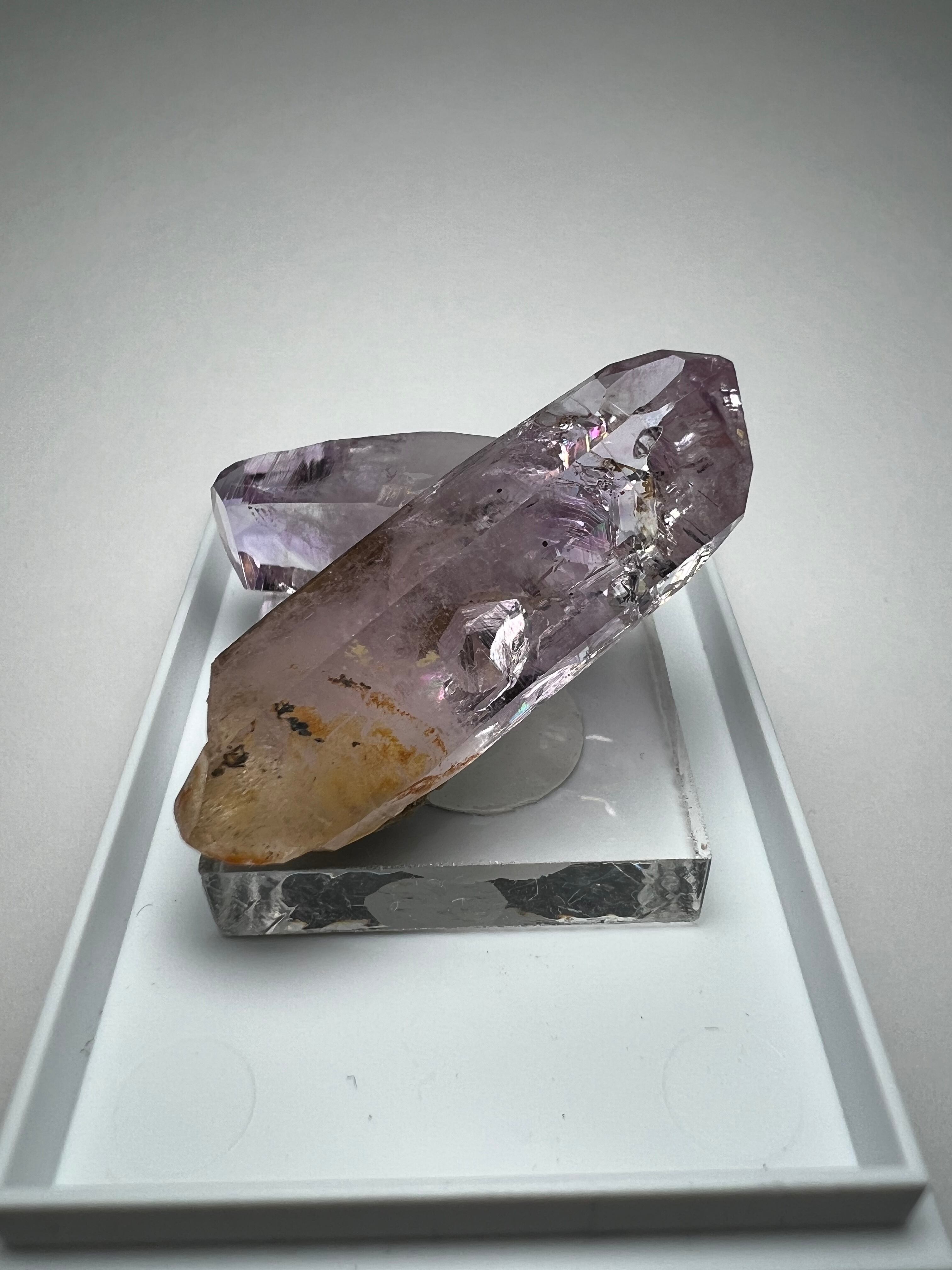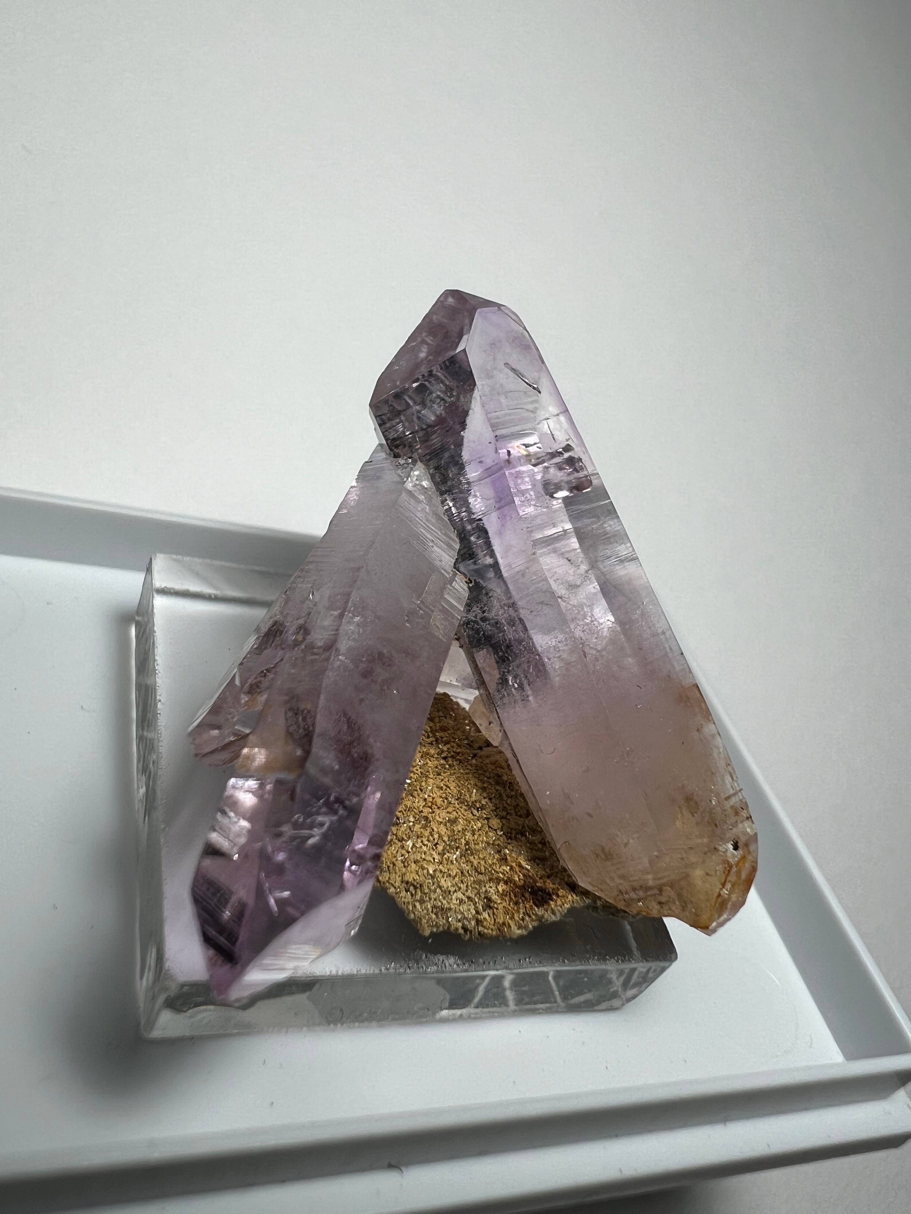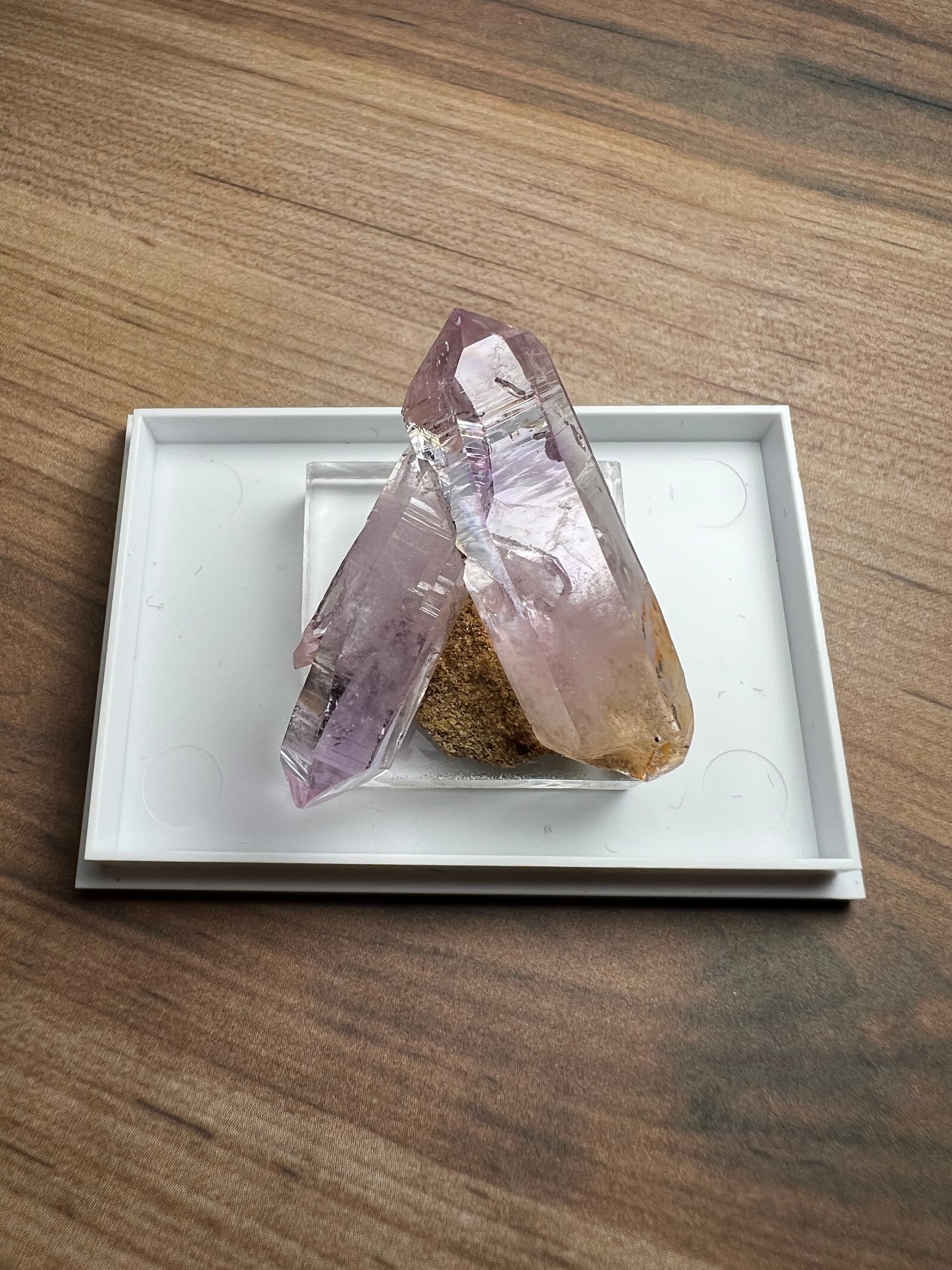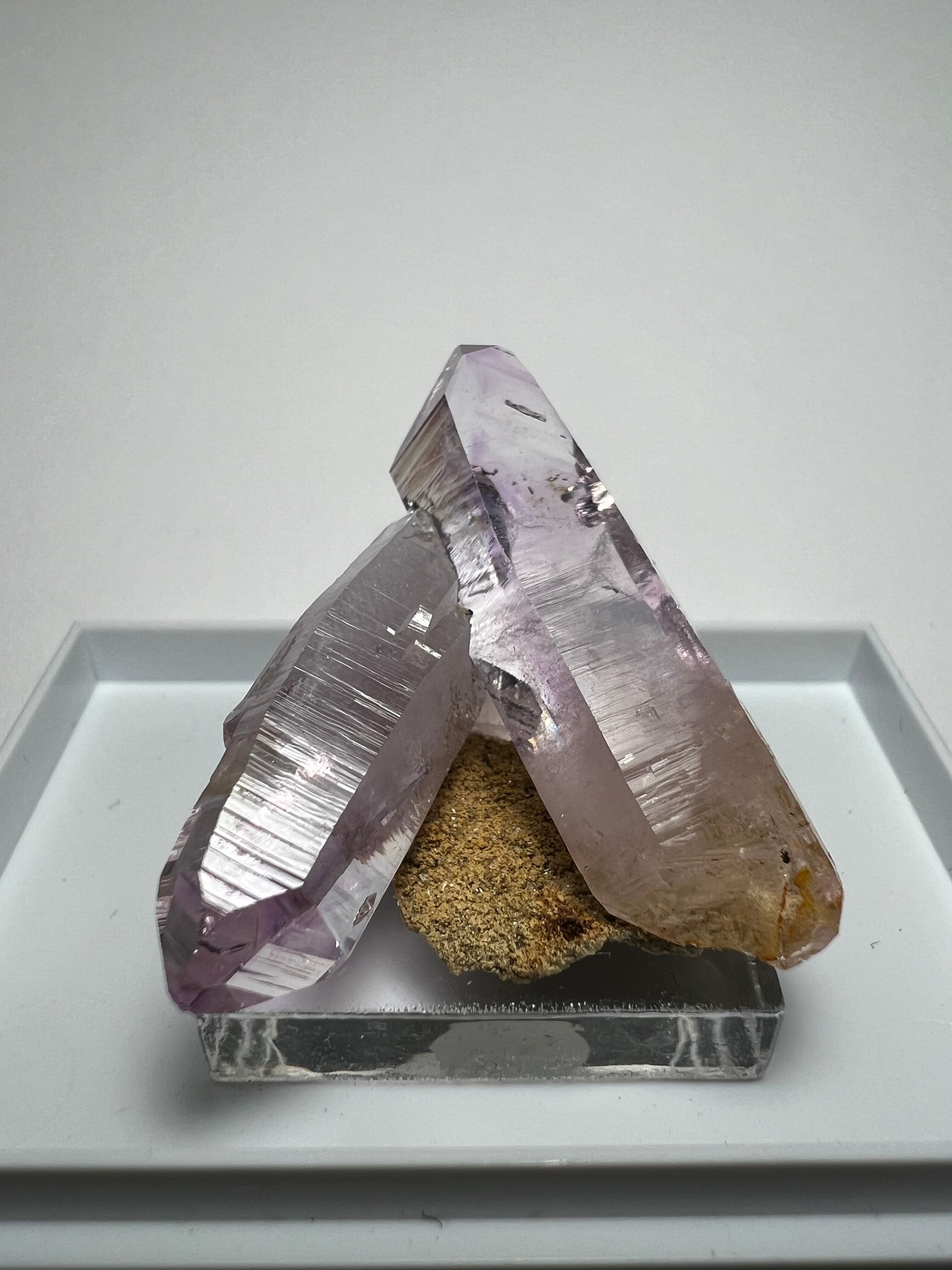 薄い母岩に寄り添うように結晶が立っています。透明度、照りも申し分なく、一見欠けているように見えますが両錐になっています。