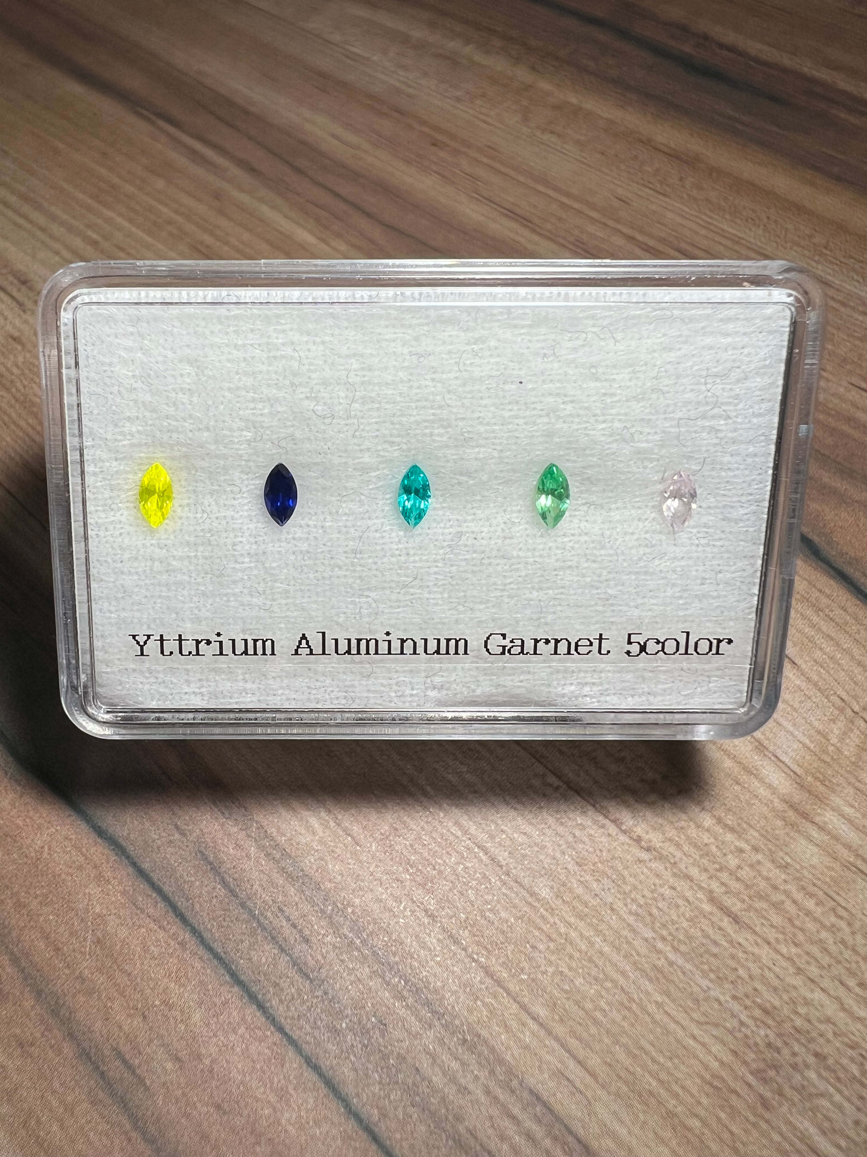 略称のYAGで知られるイットリウムアルミニウムガーネット(Yttrium Aluminum Garnet)の小さなルース(マーキスカット縦約5mm横約2.5mm)5色セットになります。