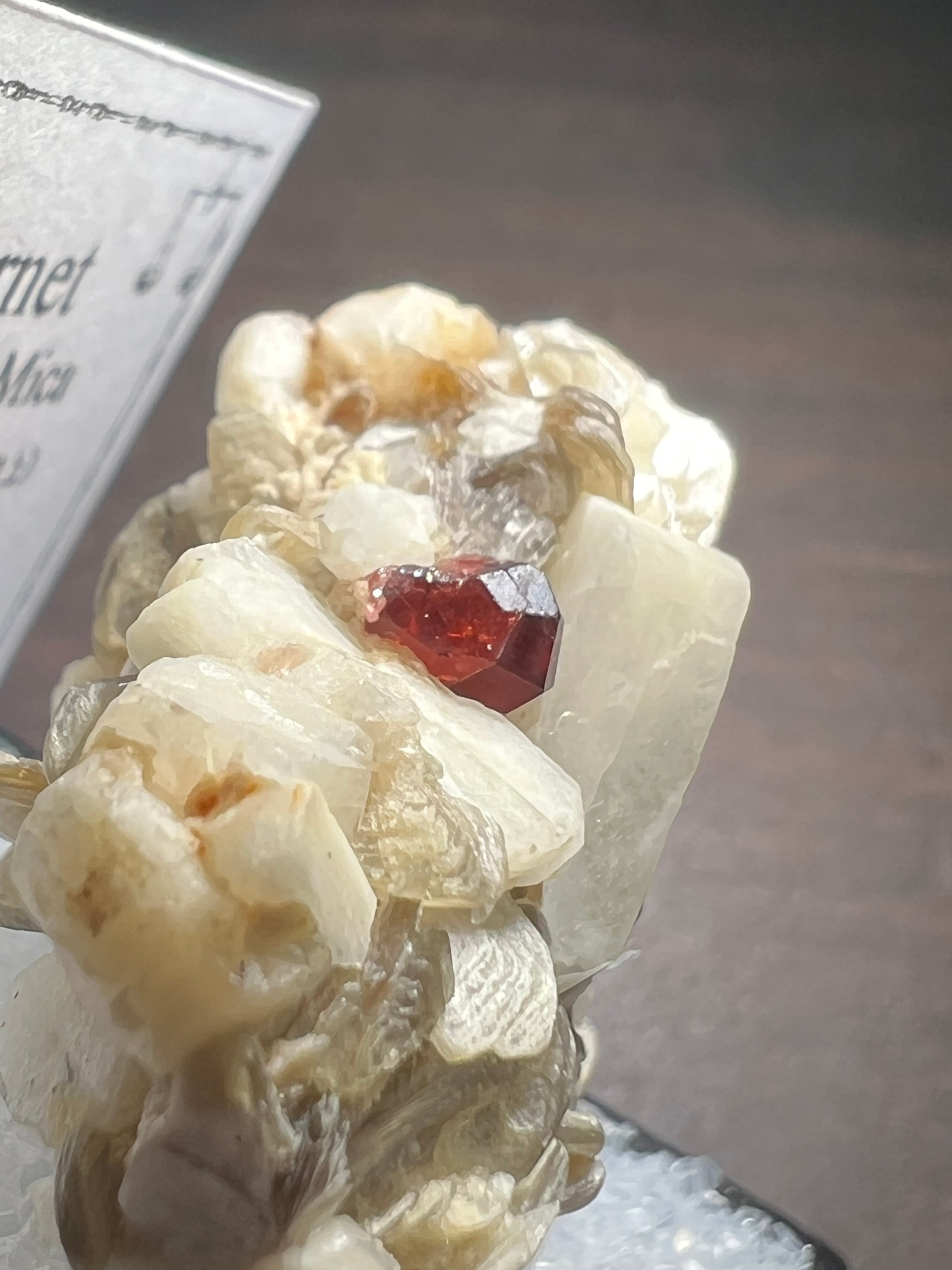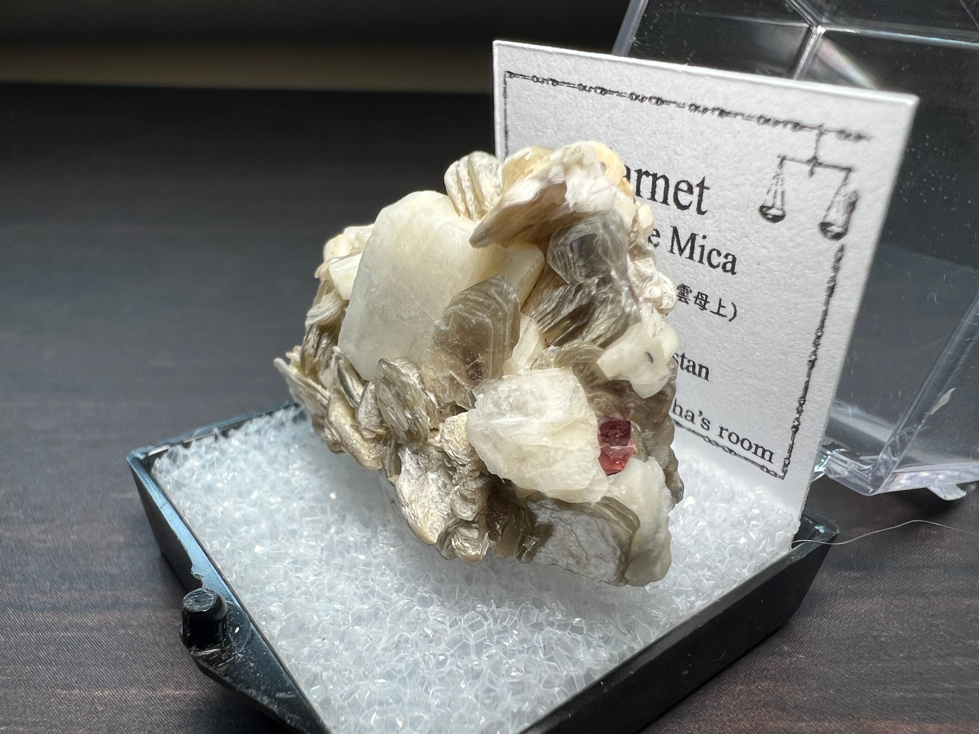 パキスタンのペグマタイトらしいコンビネーションで、透明感のあるガーネットがちょこんと鎮座している可愛らしい標本です。