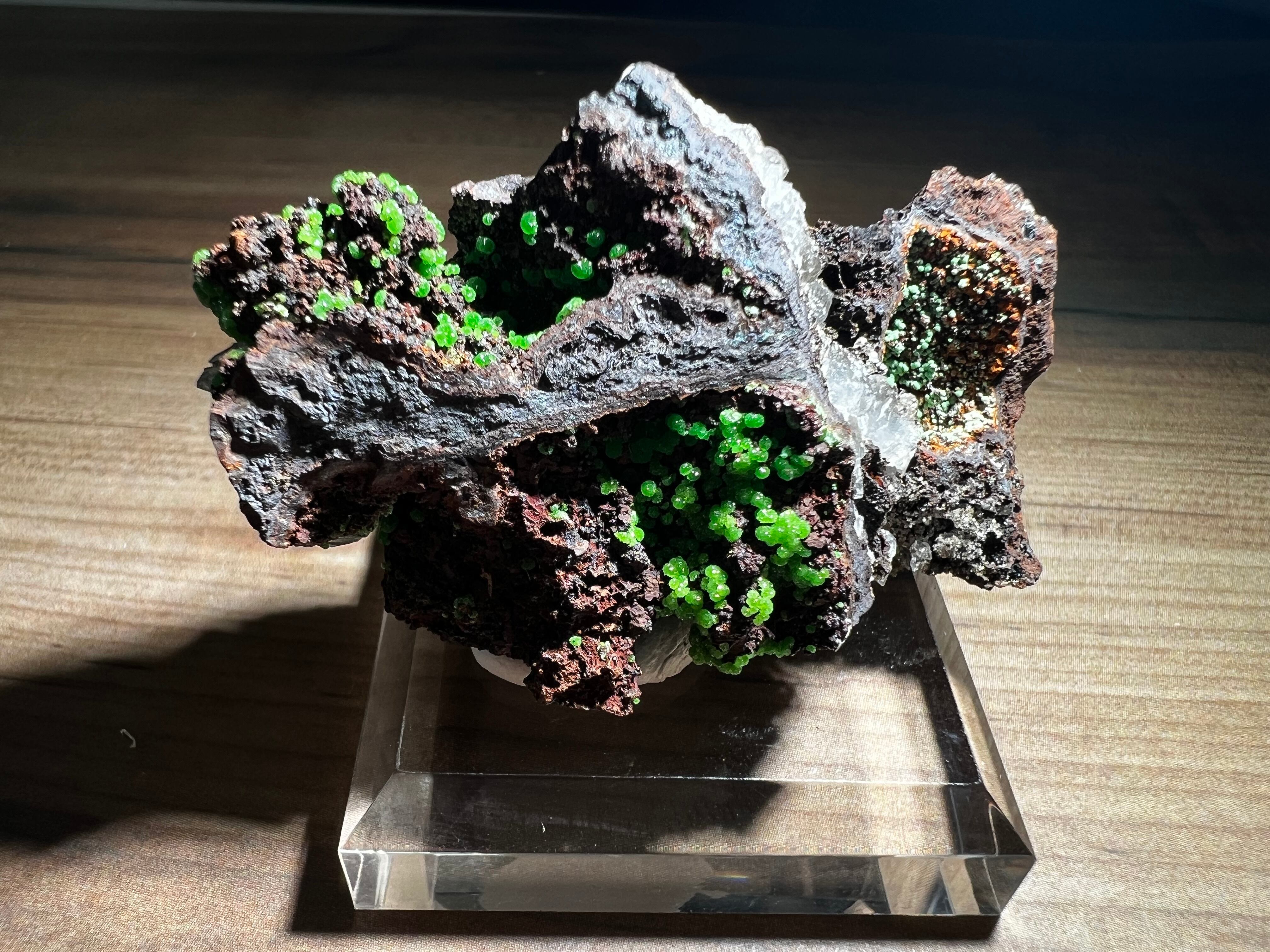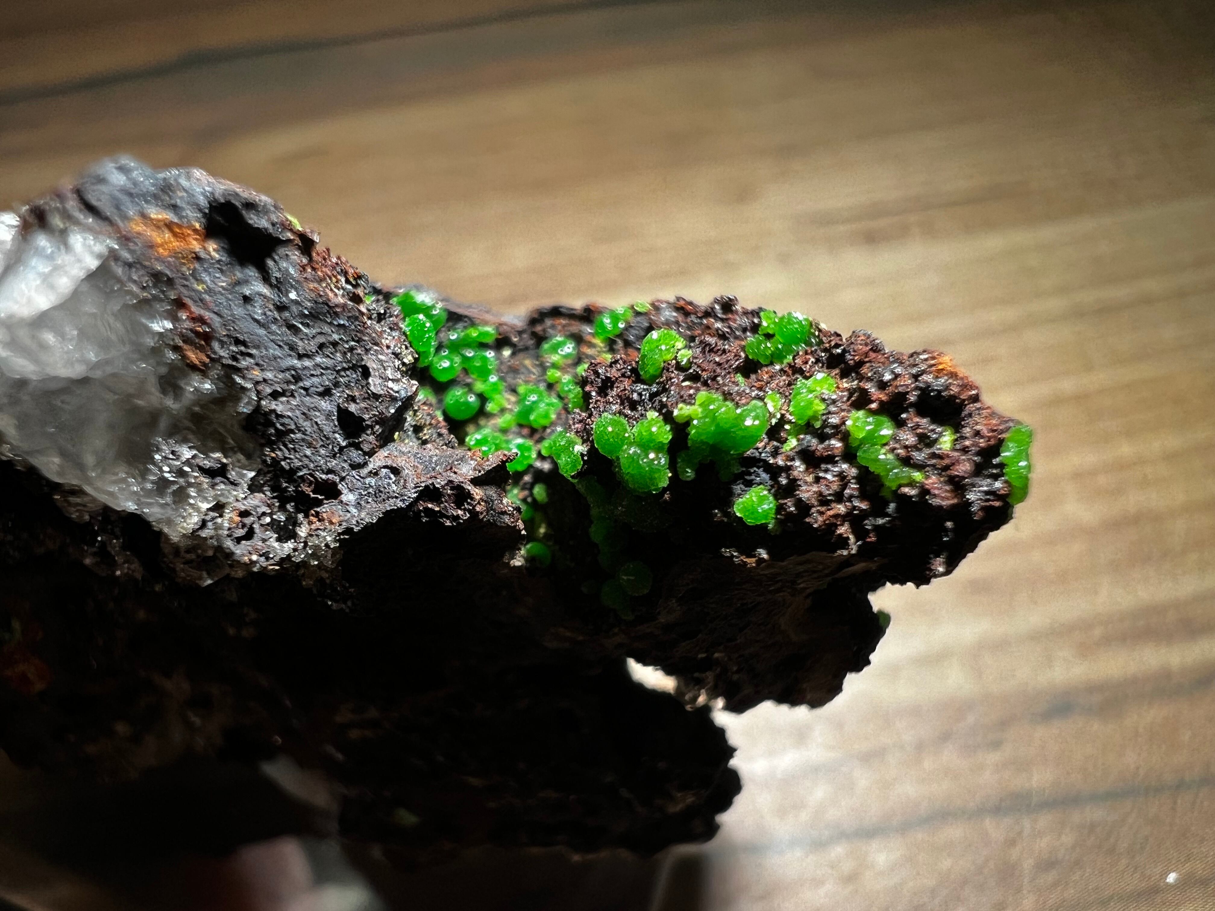 銅による発色と思われる緑に色づいたオースティン石で、小さな結晶が集まった丸い形状をしています。肉眼でも容易に確認できますが、ルーペや顕微鏡等で観察すると非常に美しい鉱物の世界が堪能できると思います。