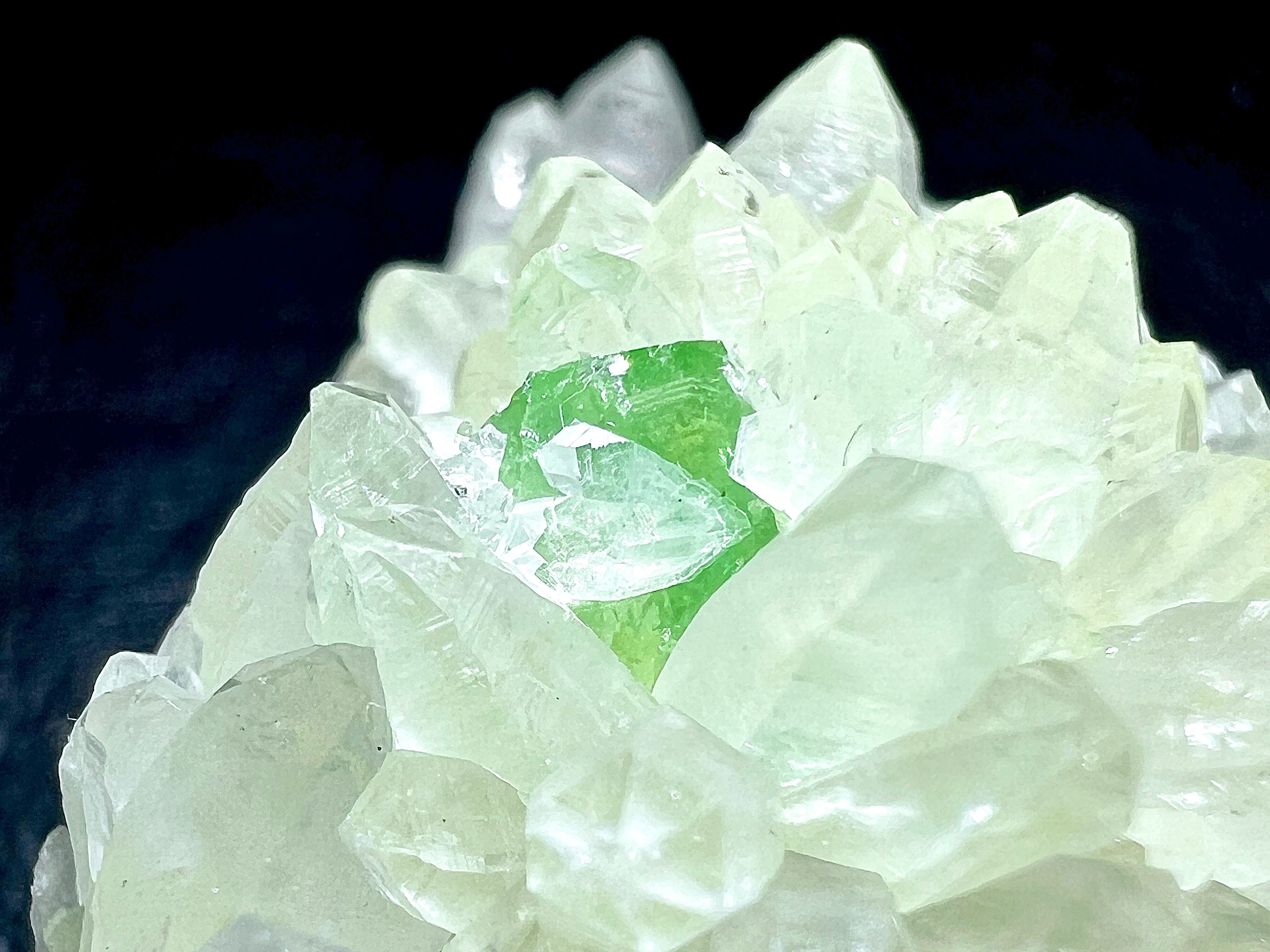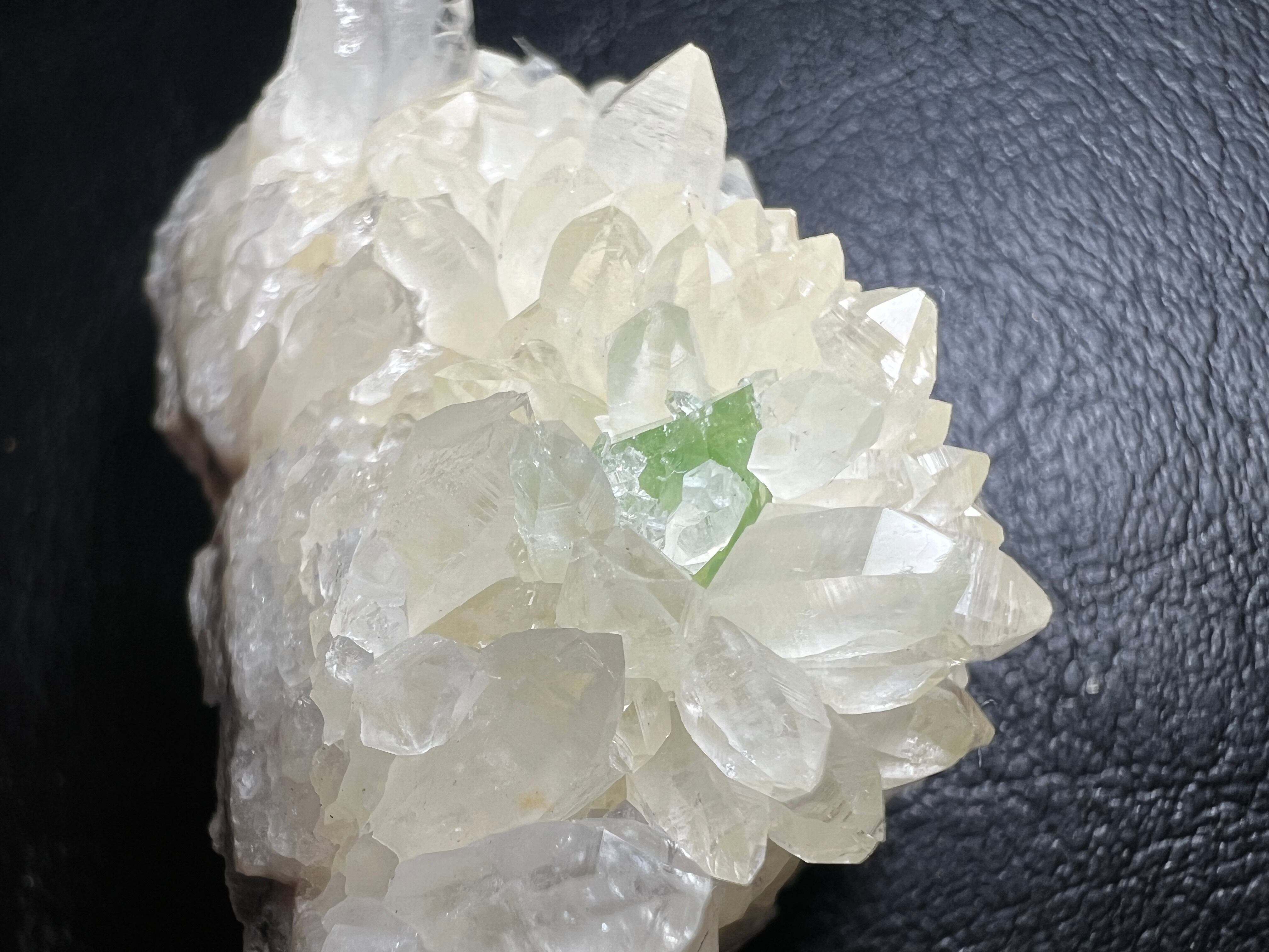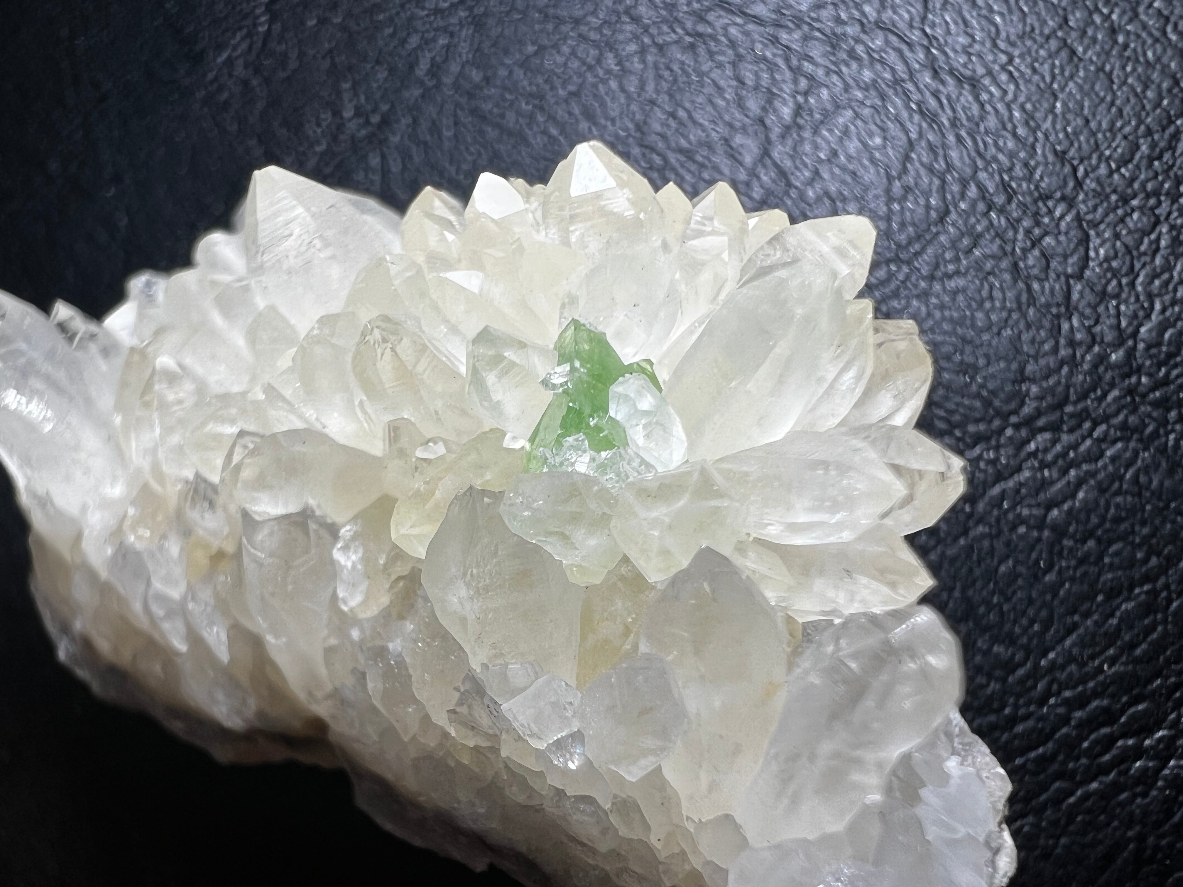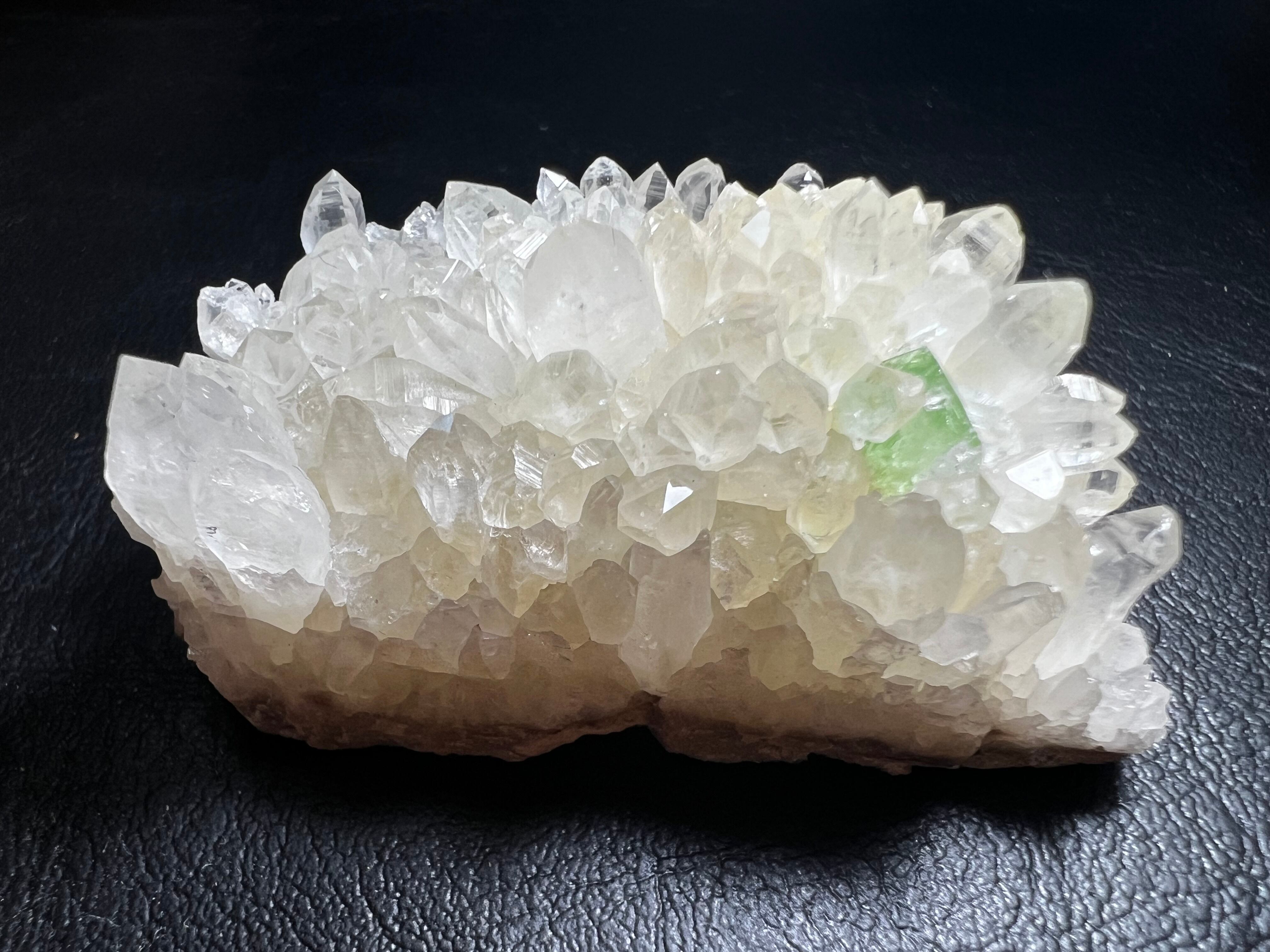 本品も無色の水晶上にアウゲル石がやや埋もれた状態ですが成長していて、ペルー産にしては色が濃く鮮やかな緑をしています。アウゲル石の上にも小さな水晶が付いています。