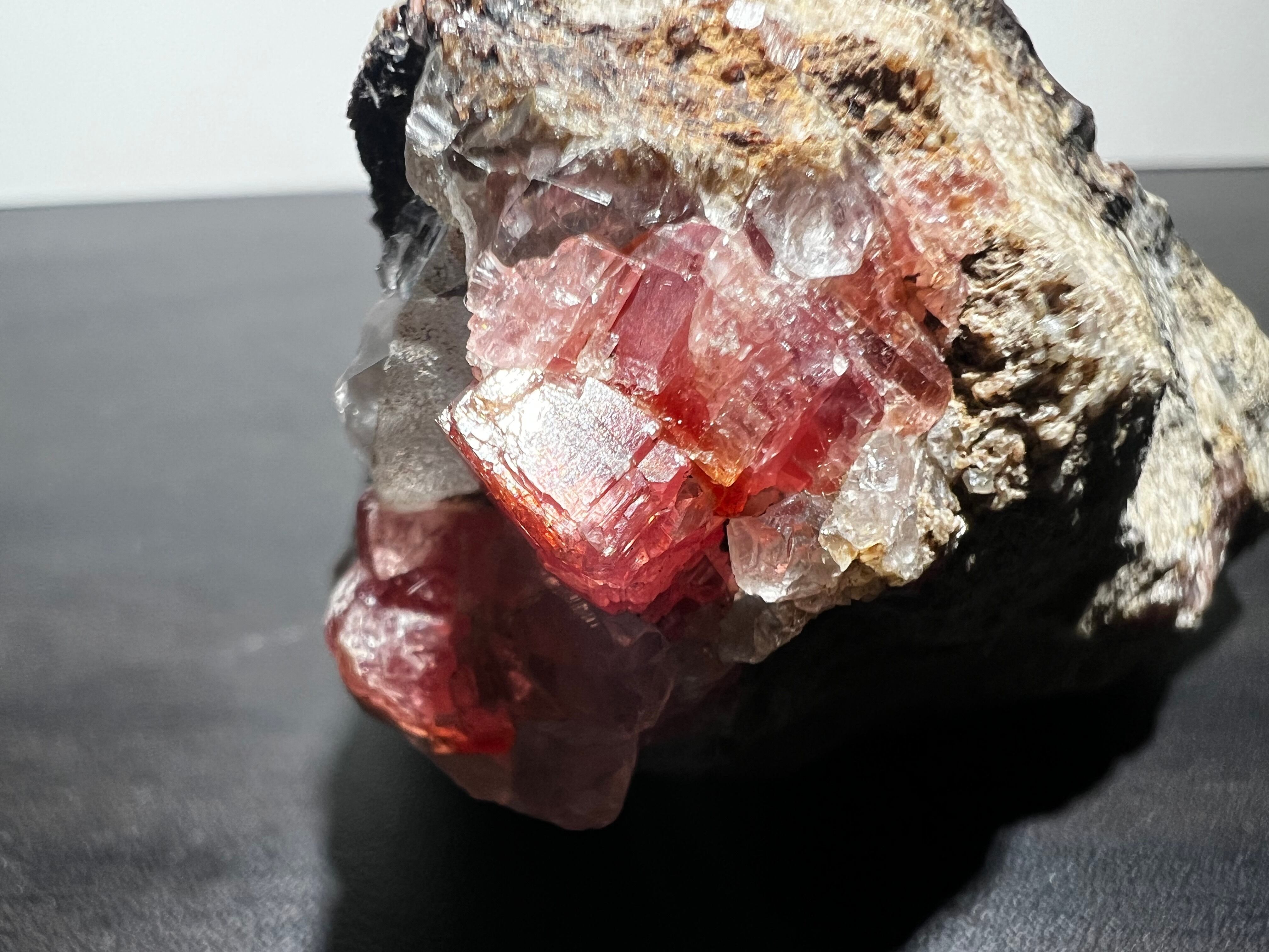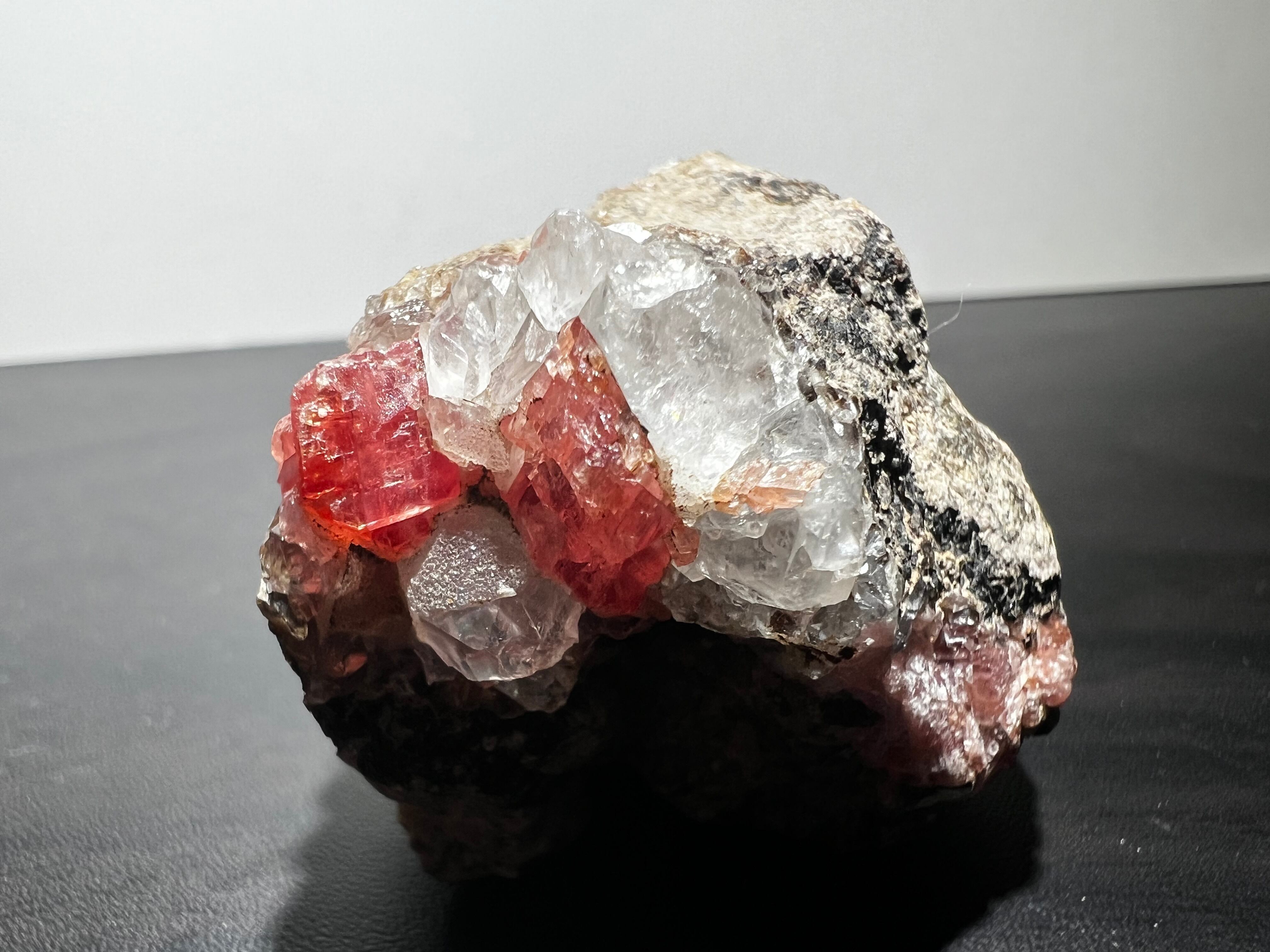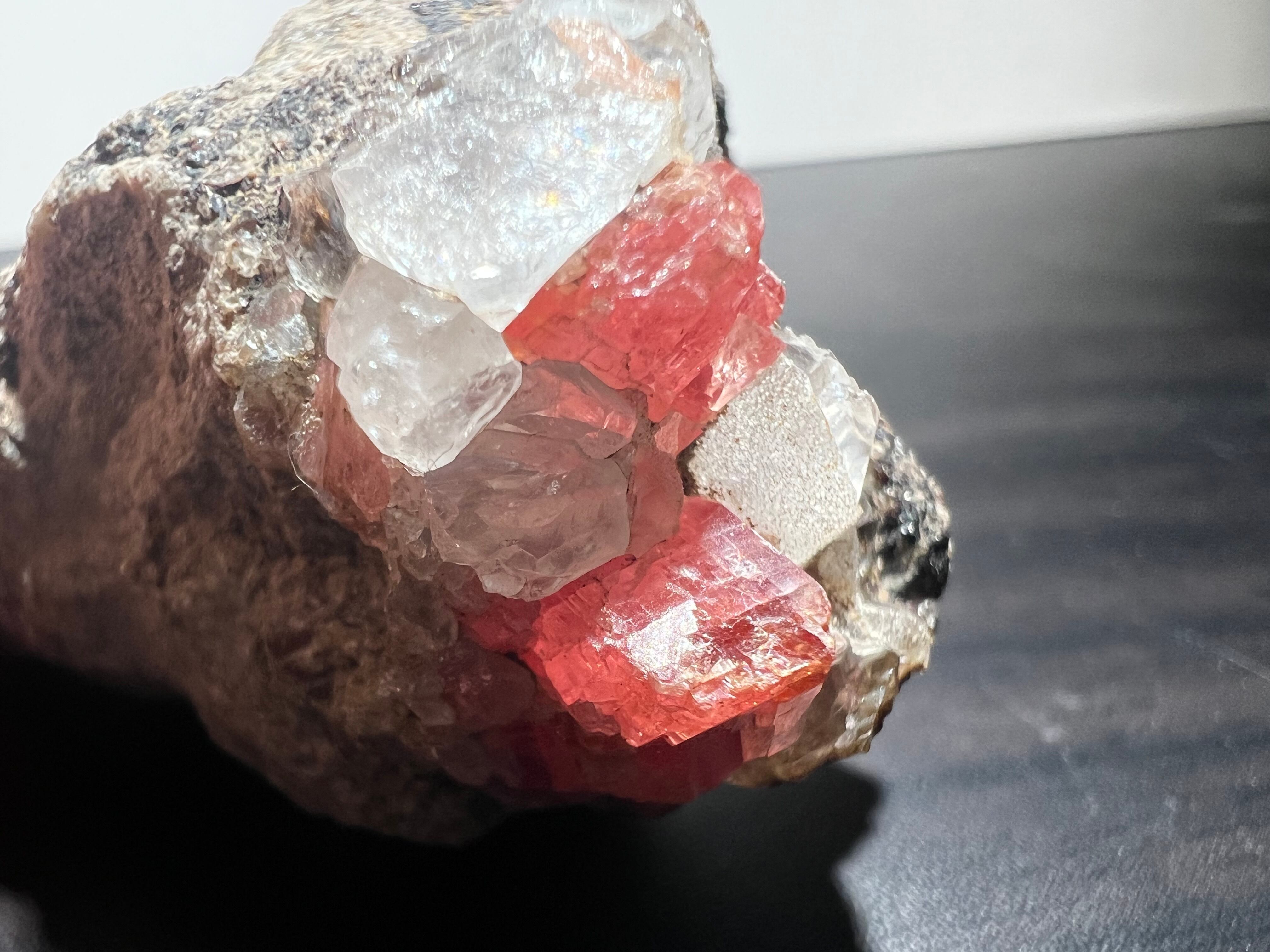 ペルー産の菱マンガン鉱(Rhodochrosite)です。灰色母岩に水晶と共に結晶しているタイプです。