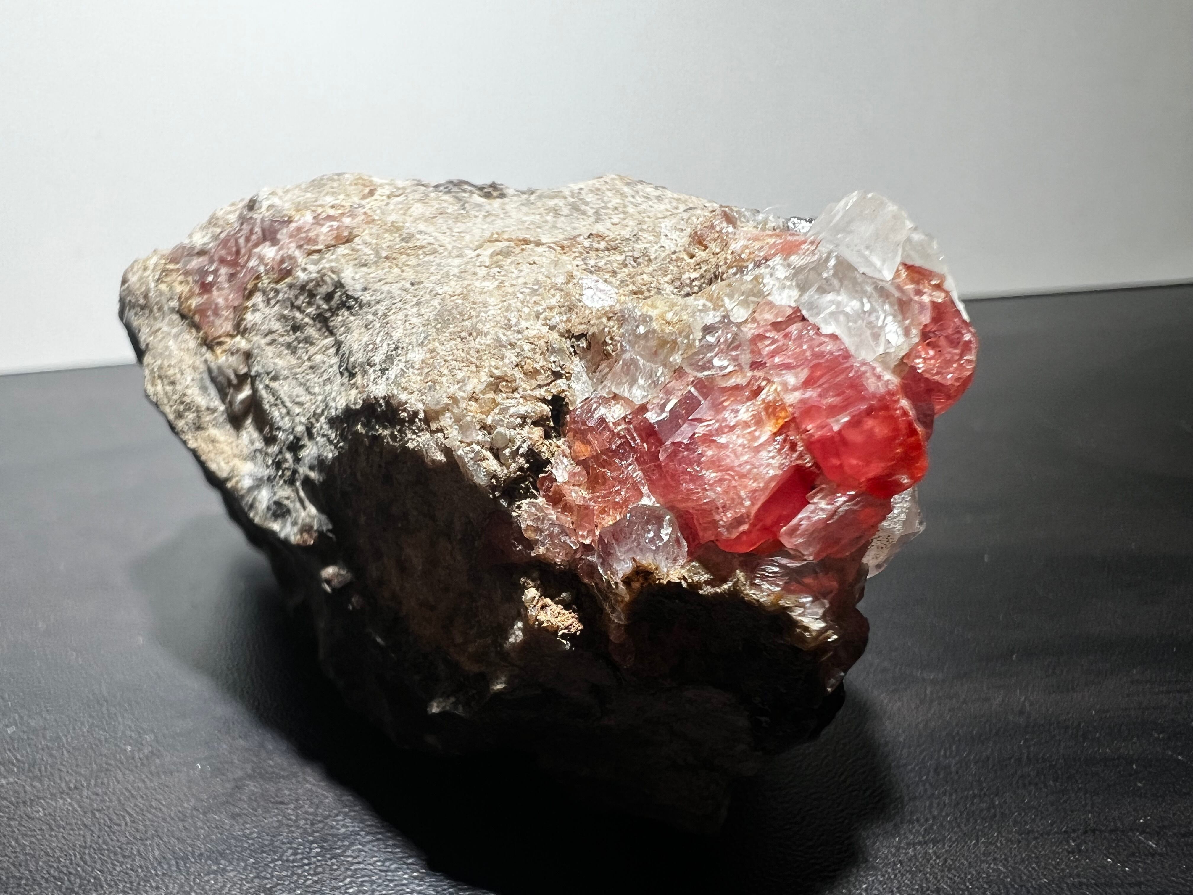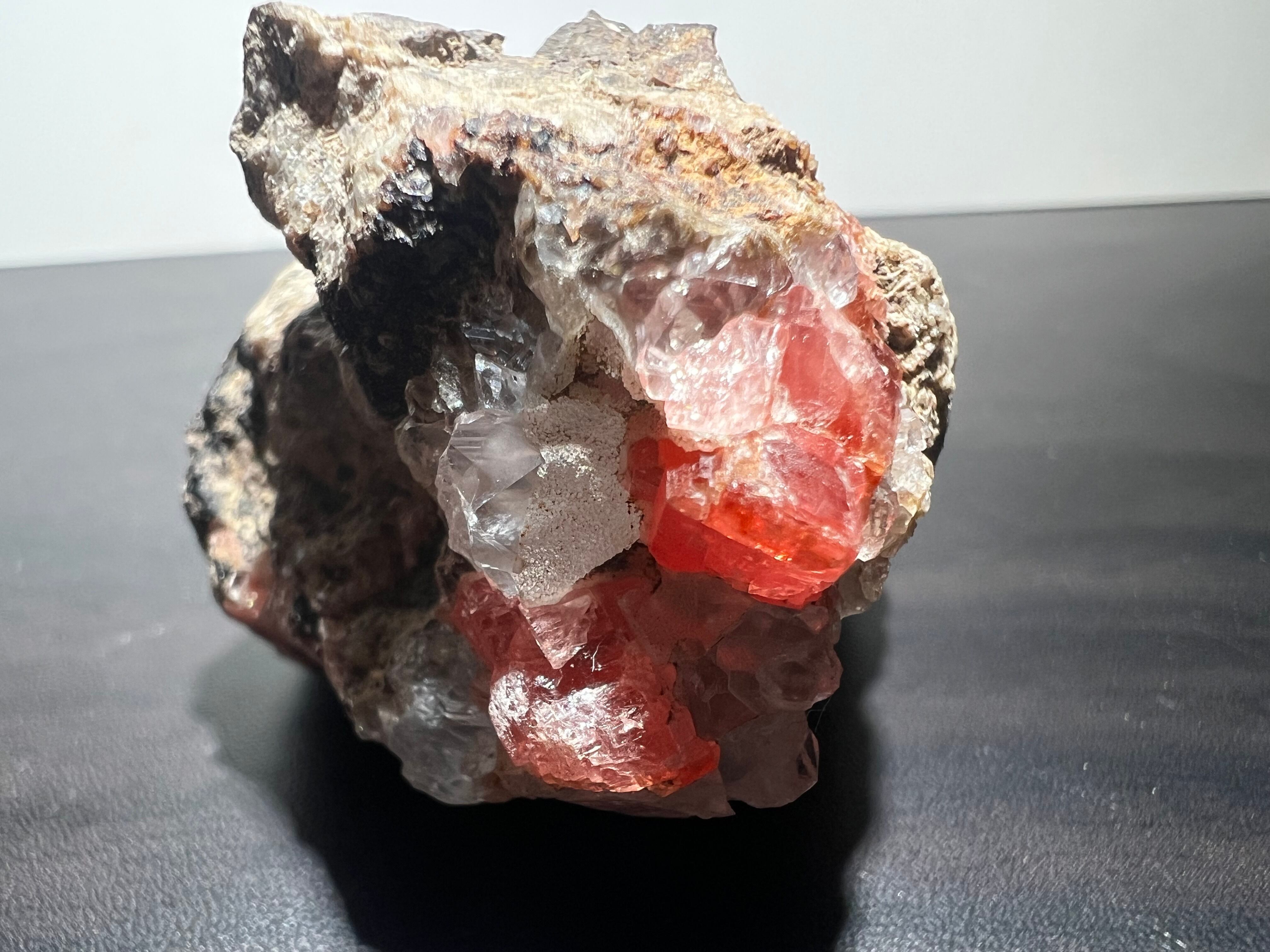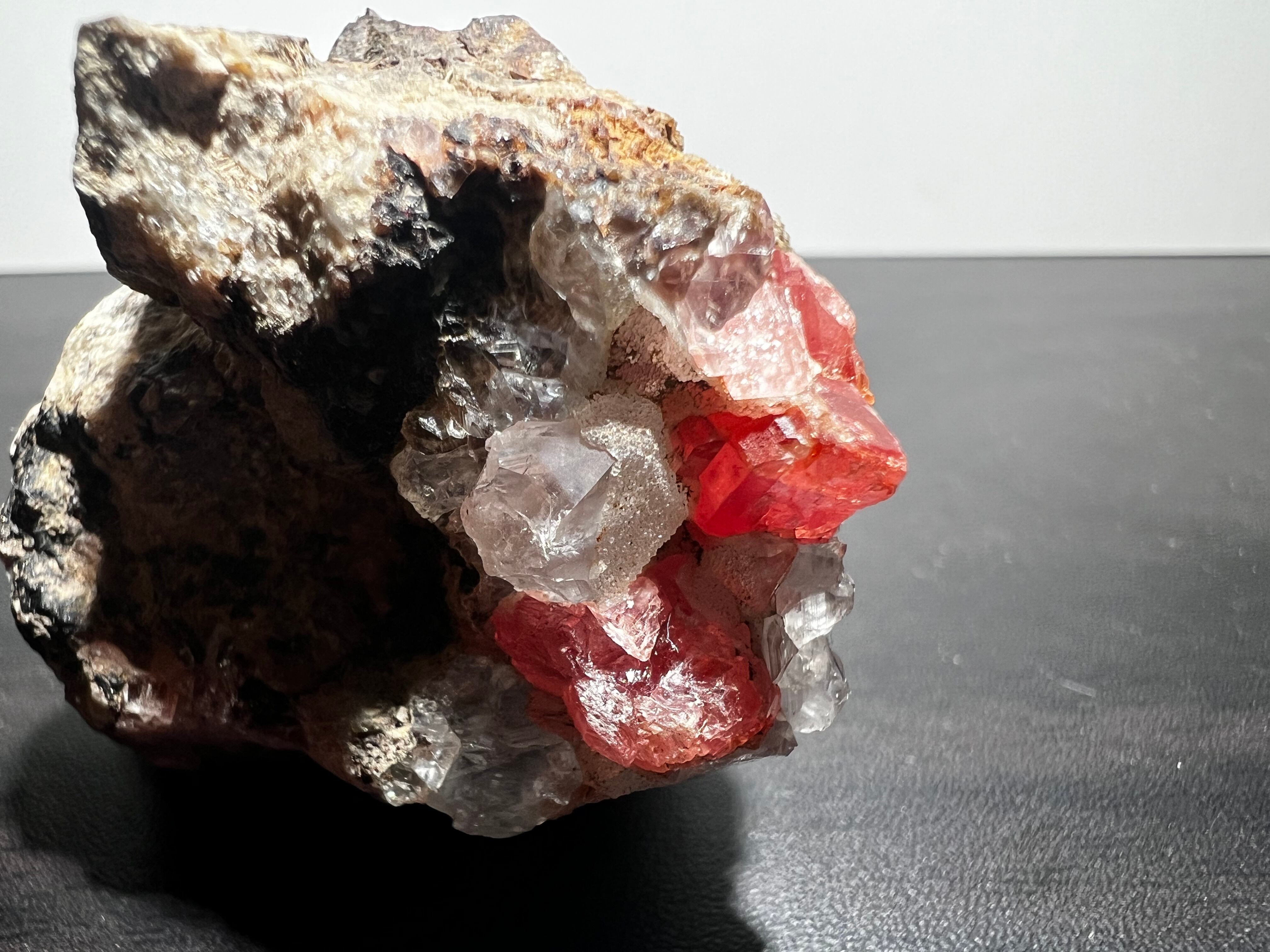 ペルー産の菱マンガン鉱(Rhodochrosite)です。灰色母岩に水晶と共に結晶しているタイプです。
