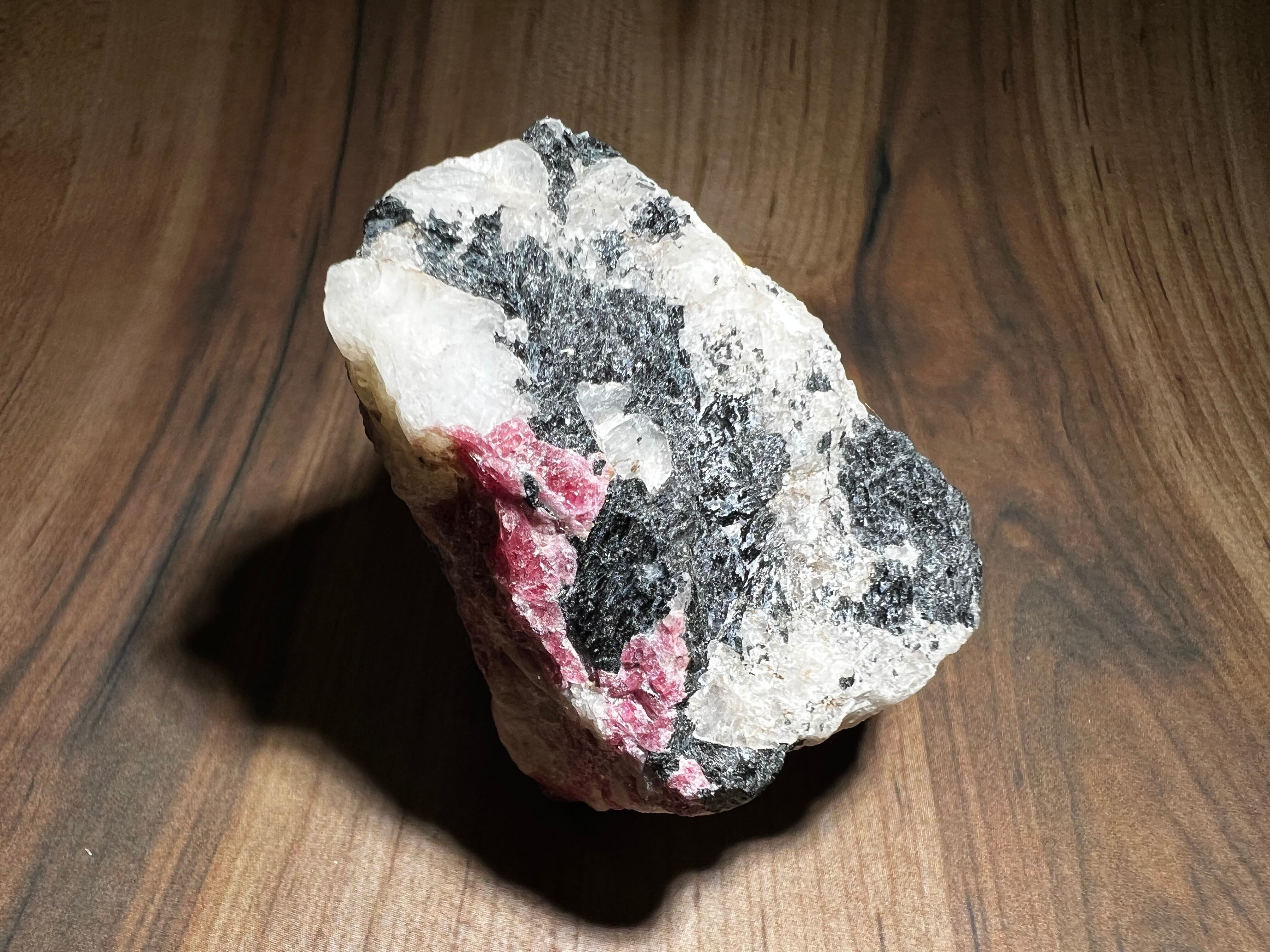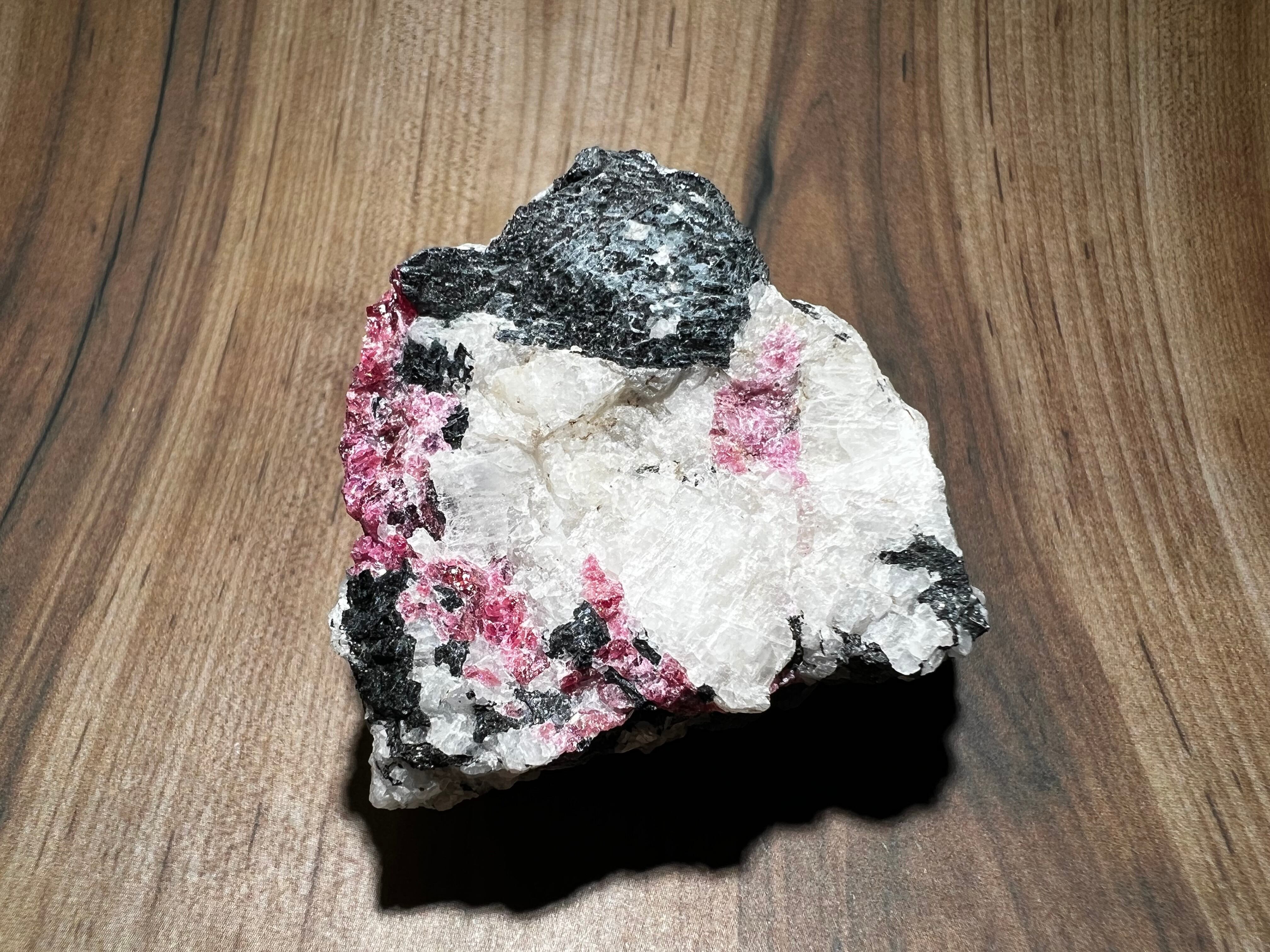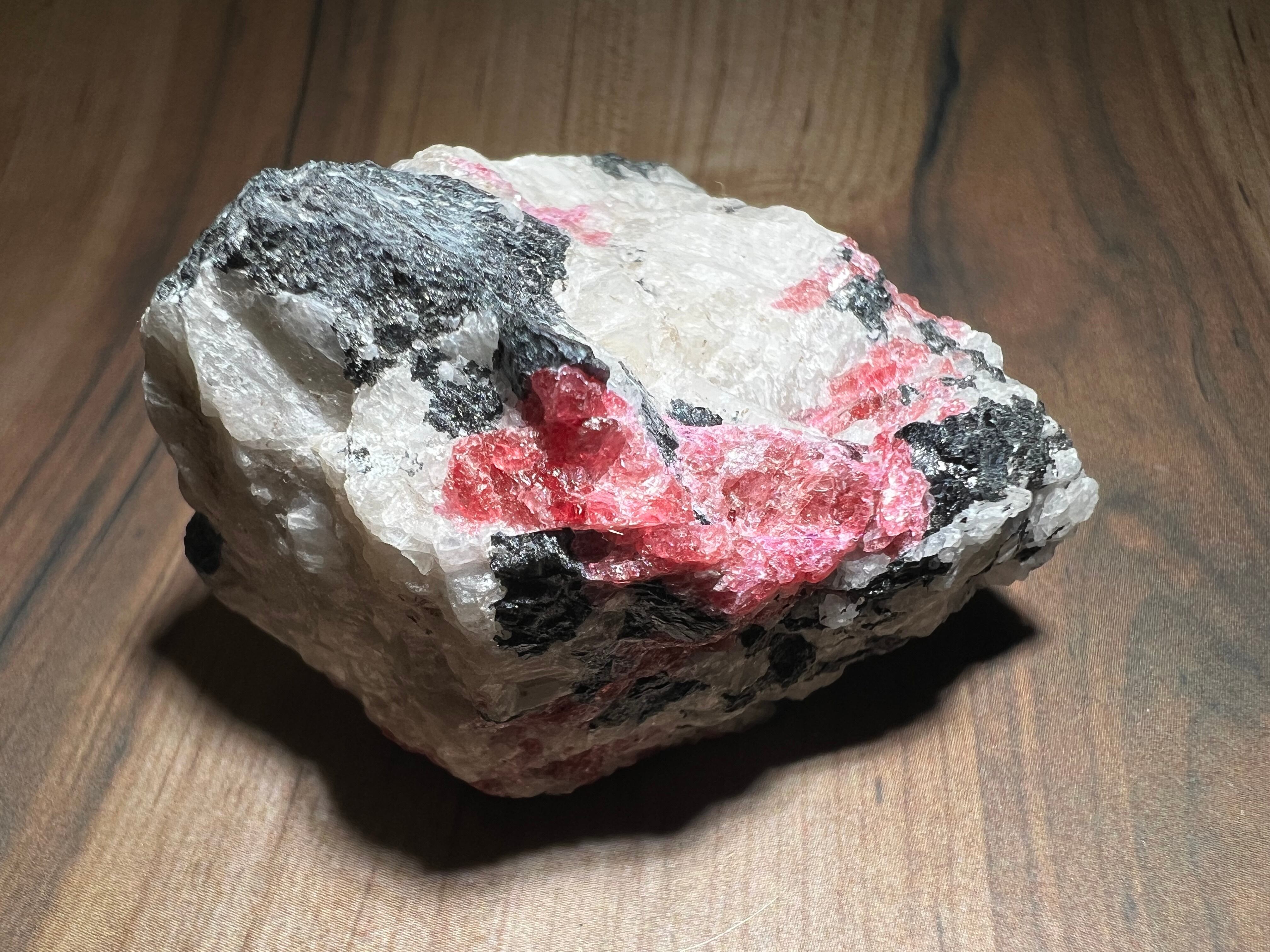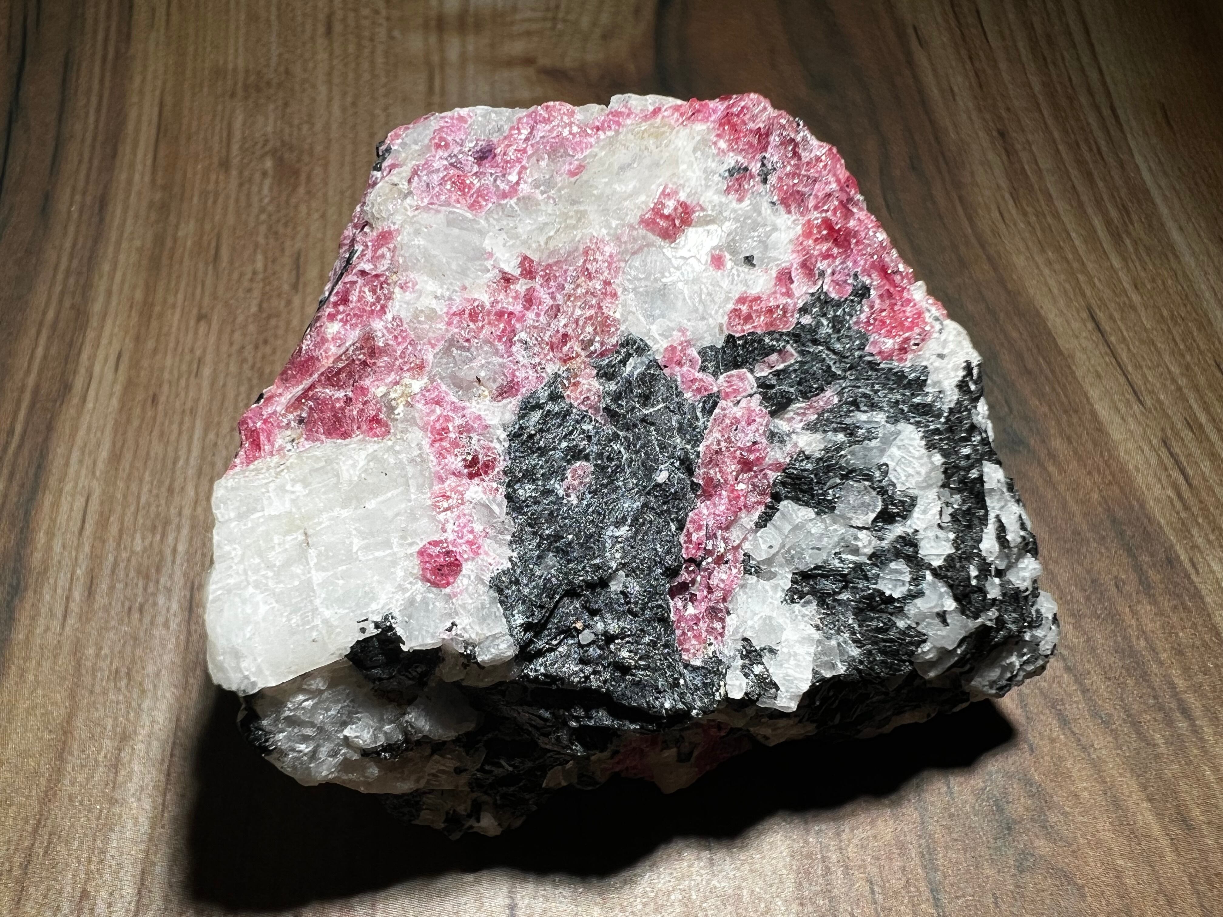 本品も結晶は確認できないものの、非常に美しく濃い独特な赤色のユージアル石を多数確認でき、サイズもあるので好標本と思います。