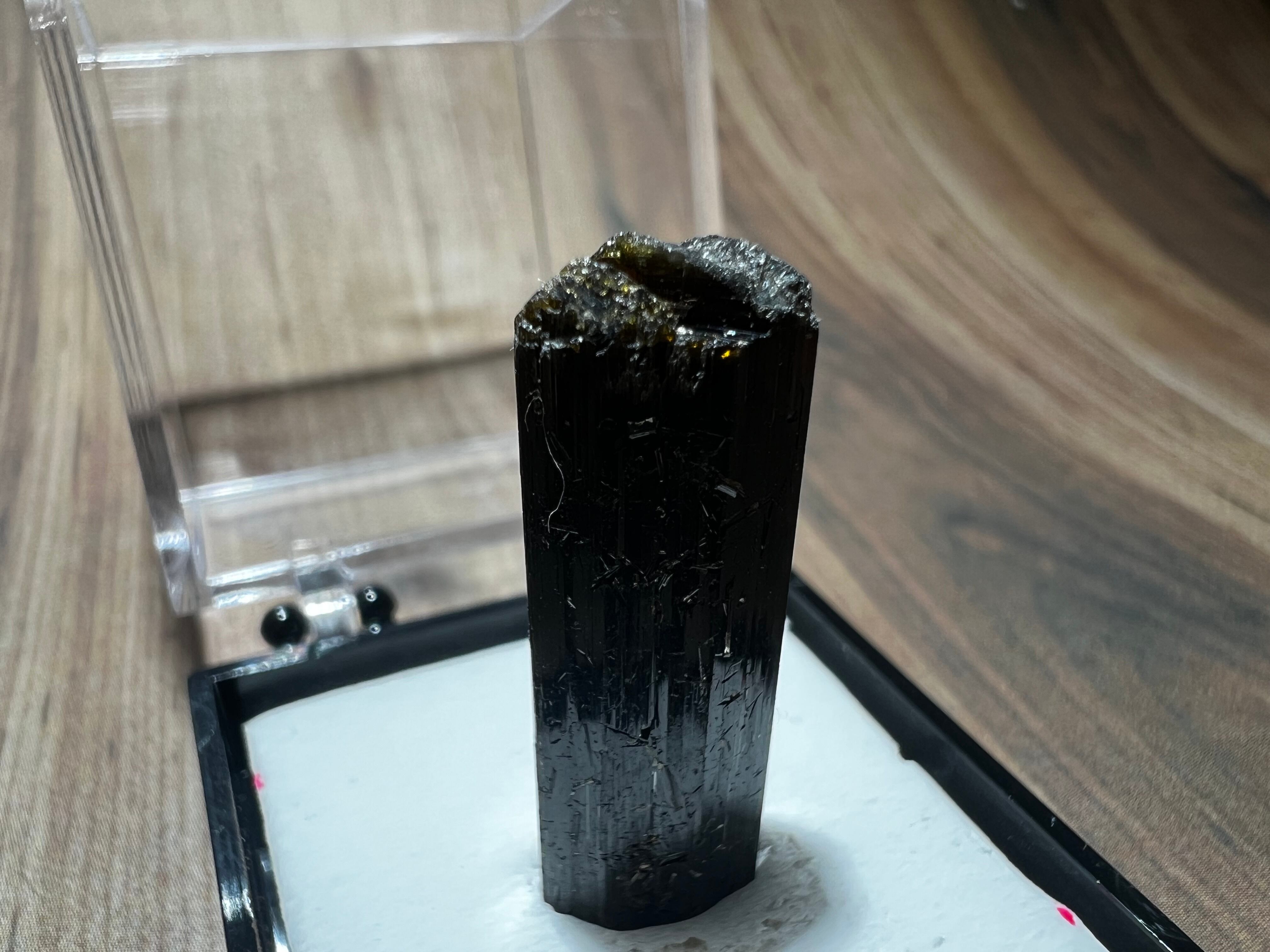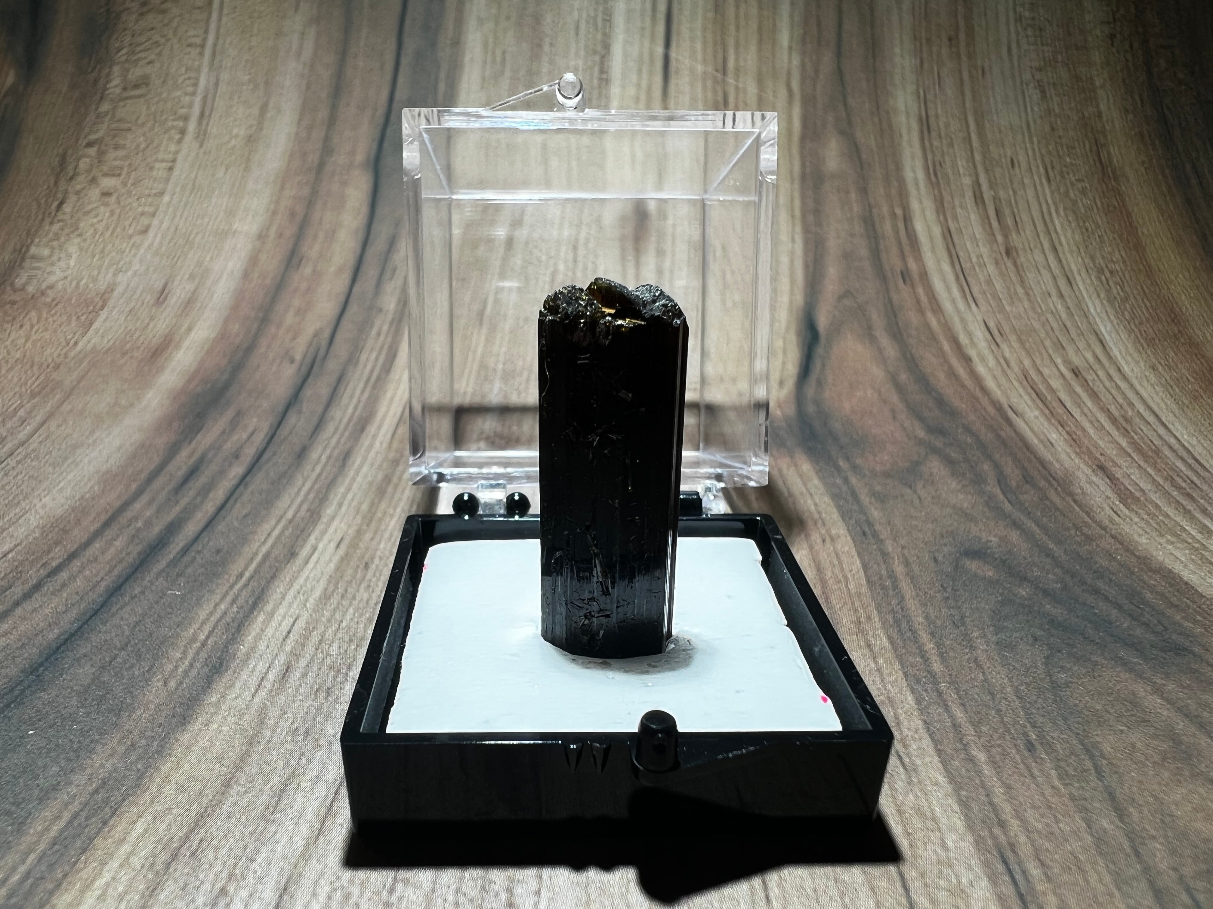 真っ黒な鉄電気石の鉄をマグネシウムに置き換えた電気石で見た目もよく似ていますが、強い光を当てると鮮やかな暗褐色に透過してとても綺麗です。