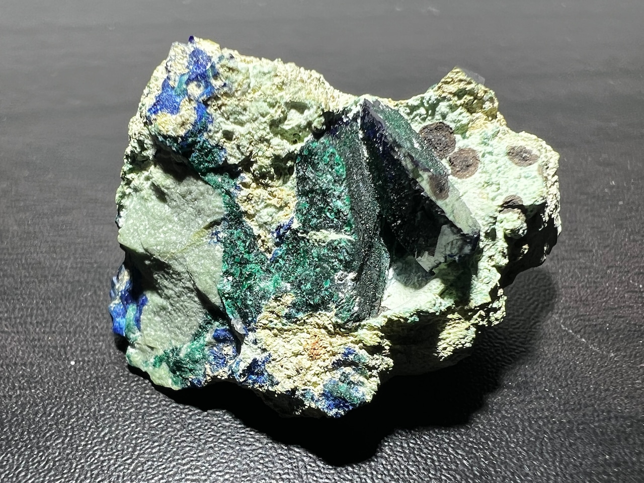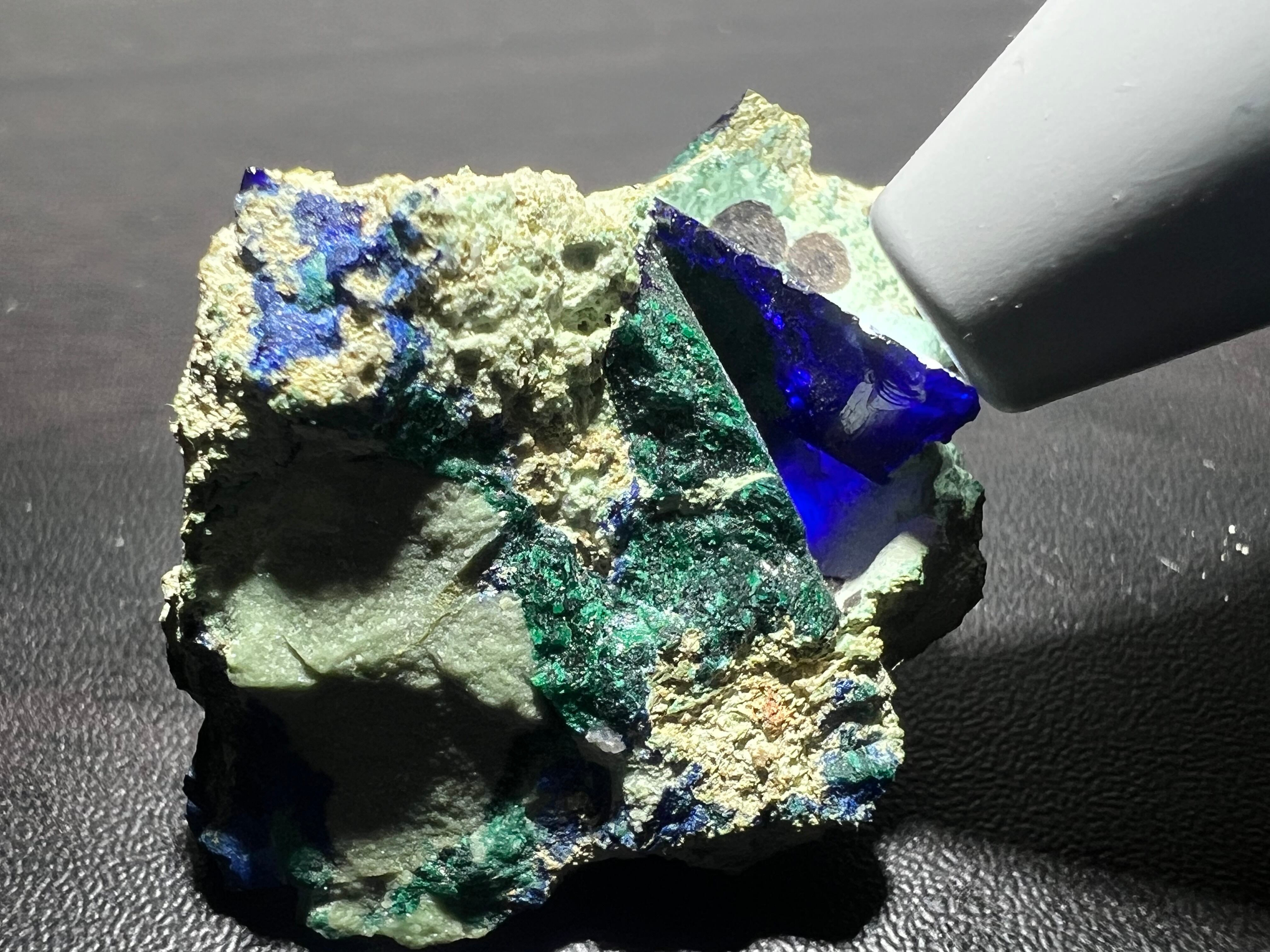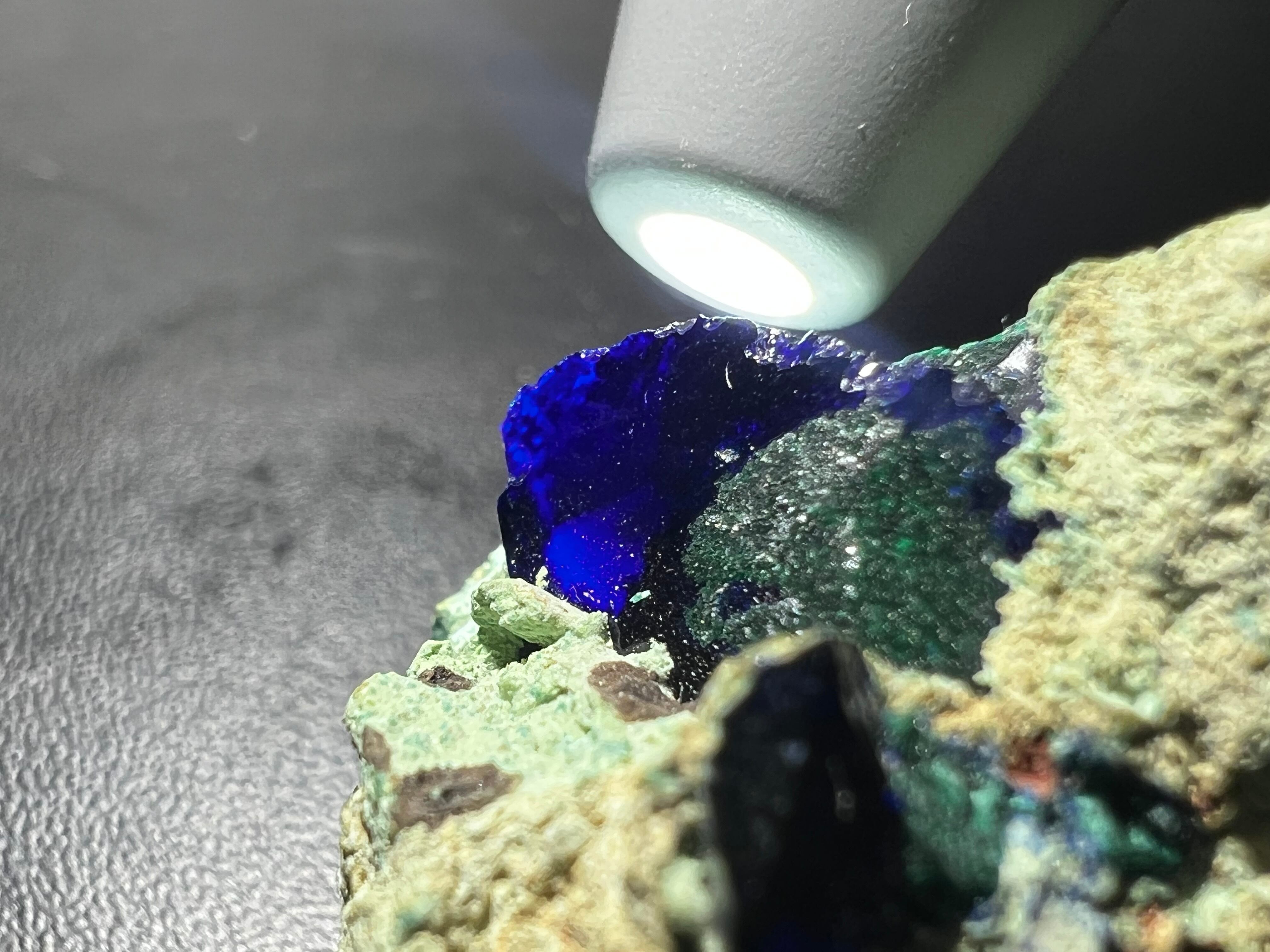 鉱物のデパートと呼ばれるツメブ鉱山産の藍銅鉱と孔雀石です。光輝が強い藍銅鉱で強い光を当てると5、6枚目のように光を透過し、非常に鮮やかな藍色が見られます。