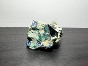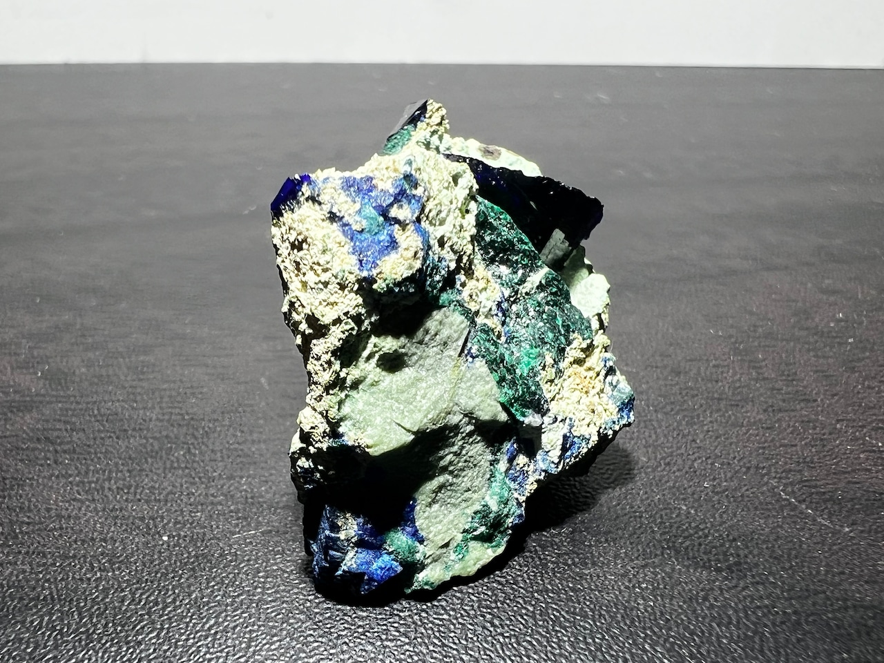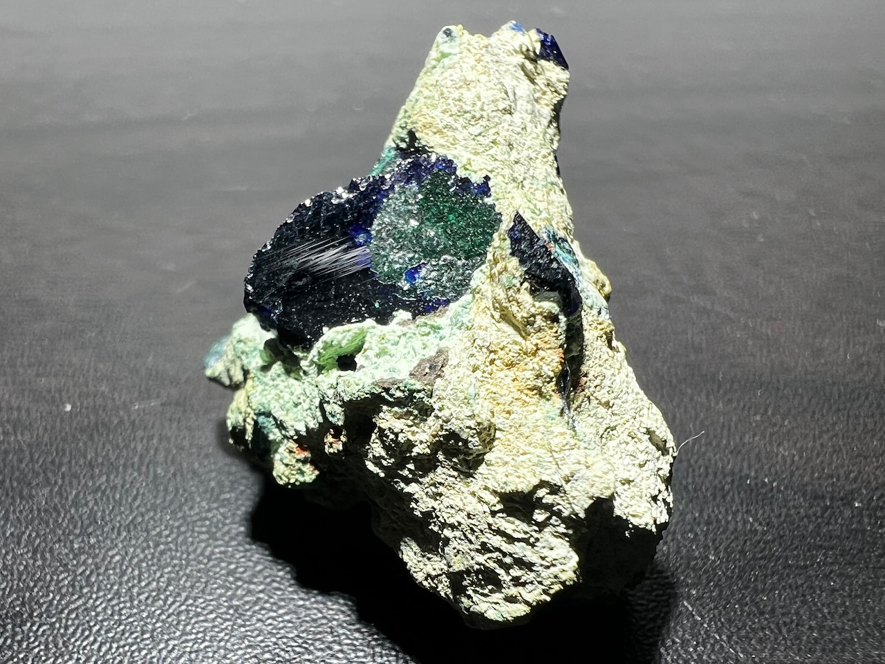 随伴鉱物として孔雀石が生じており、藍銅鉱と孔雀石の関係性もよくわかる良標本かと思います。